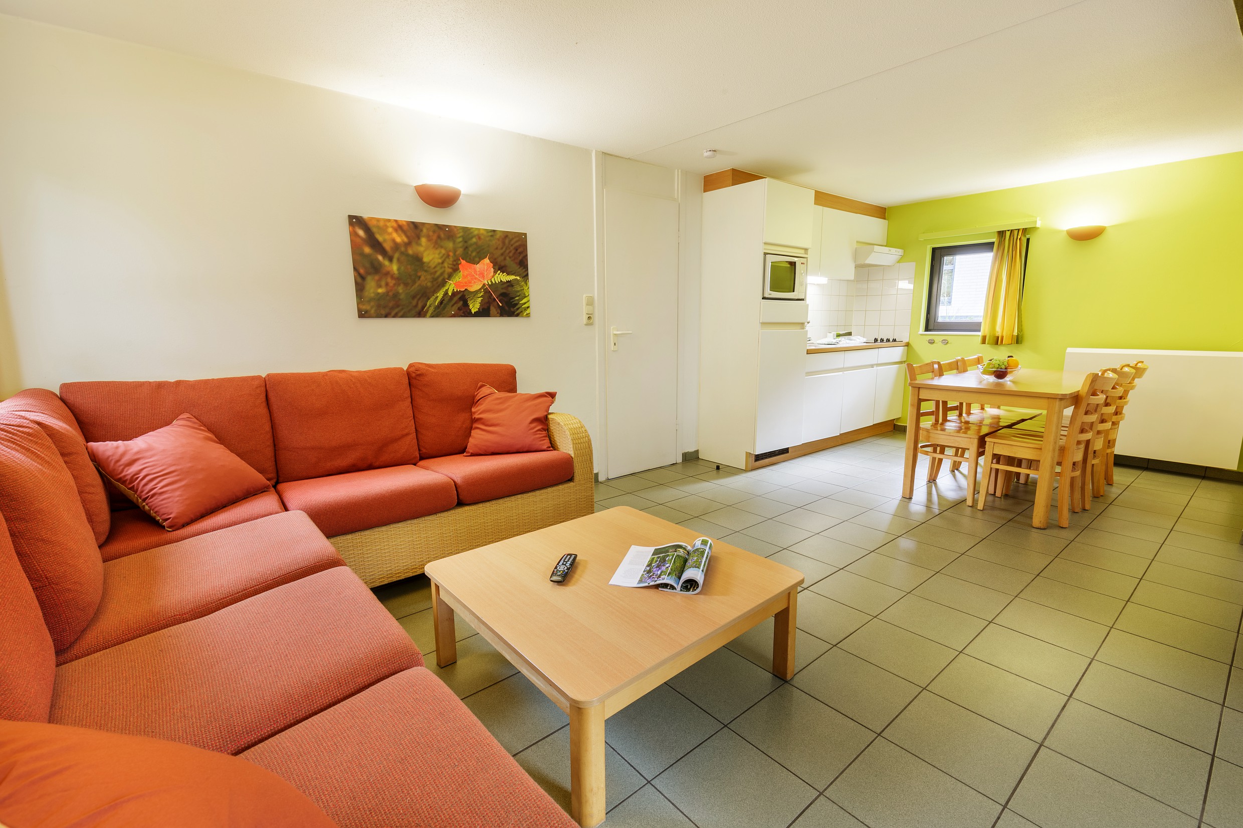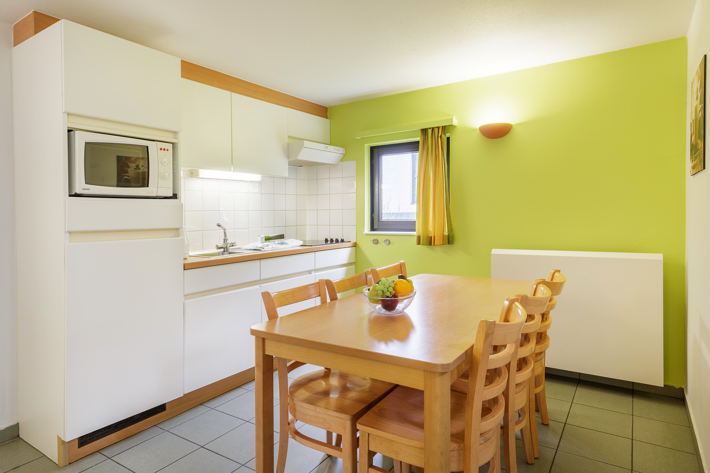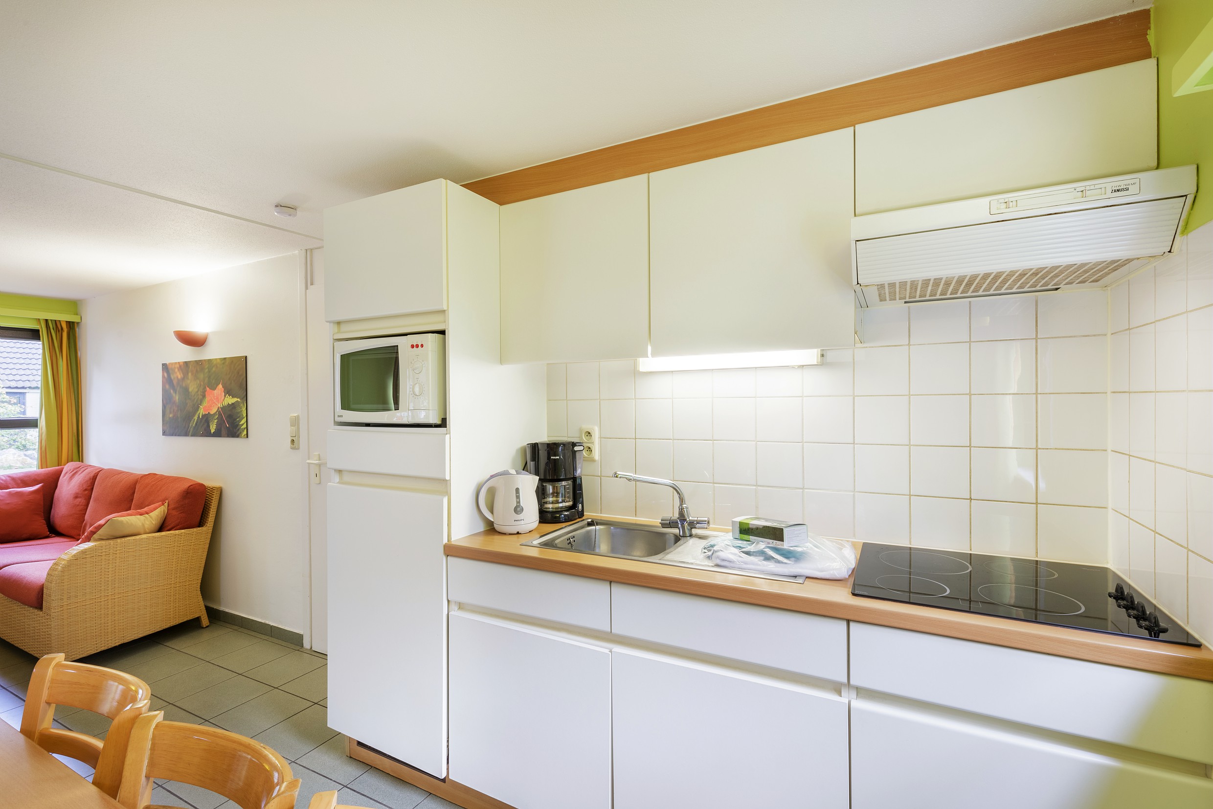 • Volledig uitgeruste keuken: 4-pits kookplaat, magnetron (zonder ovenfunctie), koelkast, filterkoffiezetapparaat, waterkoker, broodrooster, servies en kookgerei