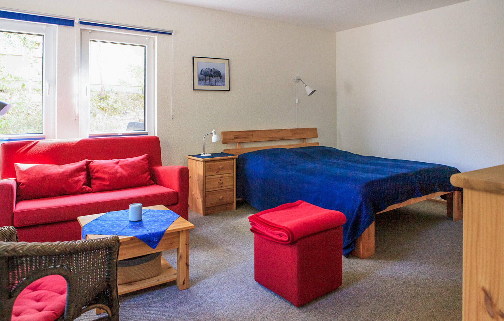 De ca. 35 m² grote rookvrije bungalow is uitgerust met een gecombineerde woon- en slaapkamer (bank, twee eenpersoonsbedden, flatscreen-tv, radio), een keuken (elektrisch fornuis met oven, koelkast met vriesvak, eethoek, diverse kleine keukenbenodigdheden), een badkamer (douche, magnetron, vaatwasser keukenapparatuur), een badkamer (douche/wc, elektrische handdoekverwarmer/verwarming, haardroger) evenals elektrische verwarming en horren voor de ramen. Er is ook een terras, een fietsenberging, parkeerplaatsen en gratis WLAN.