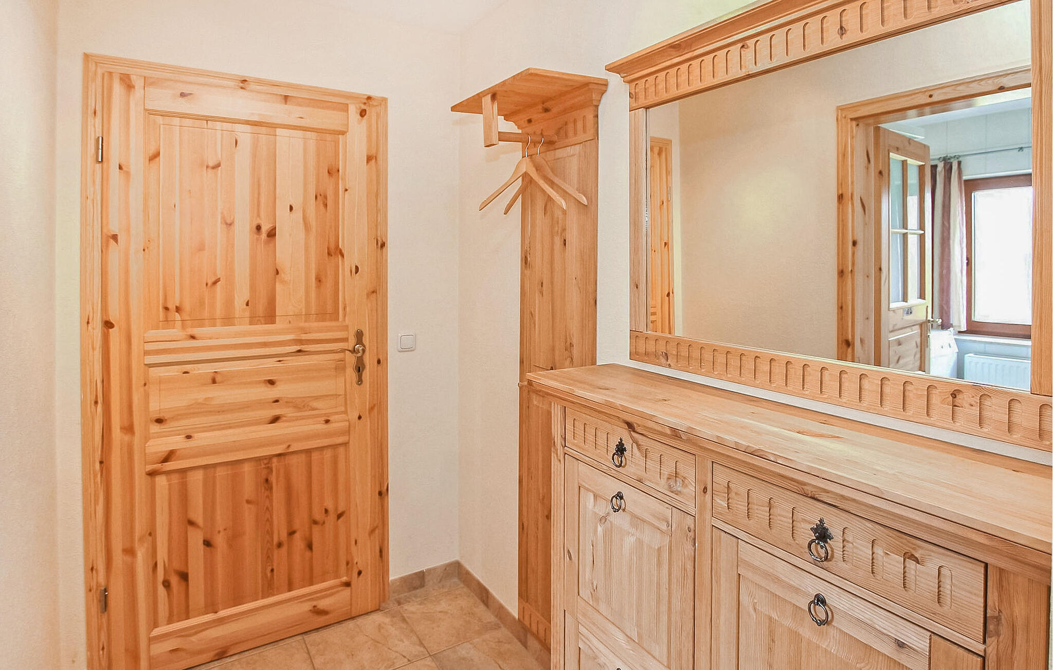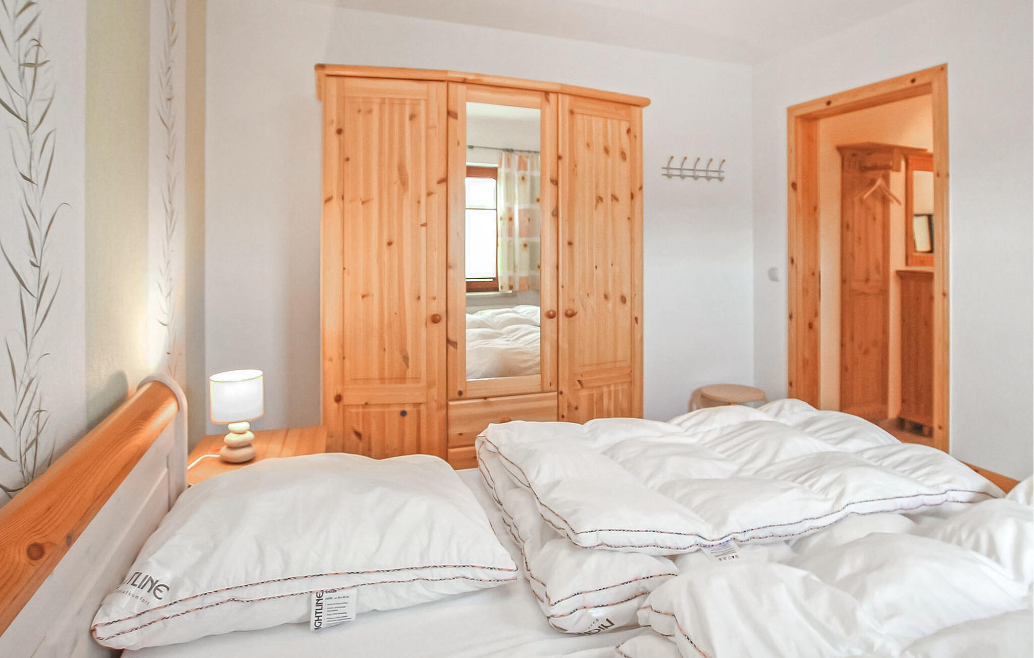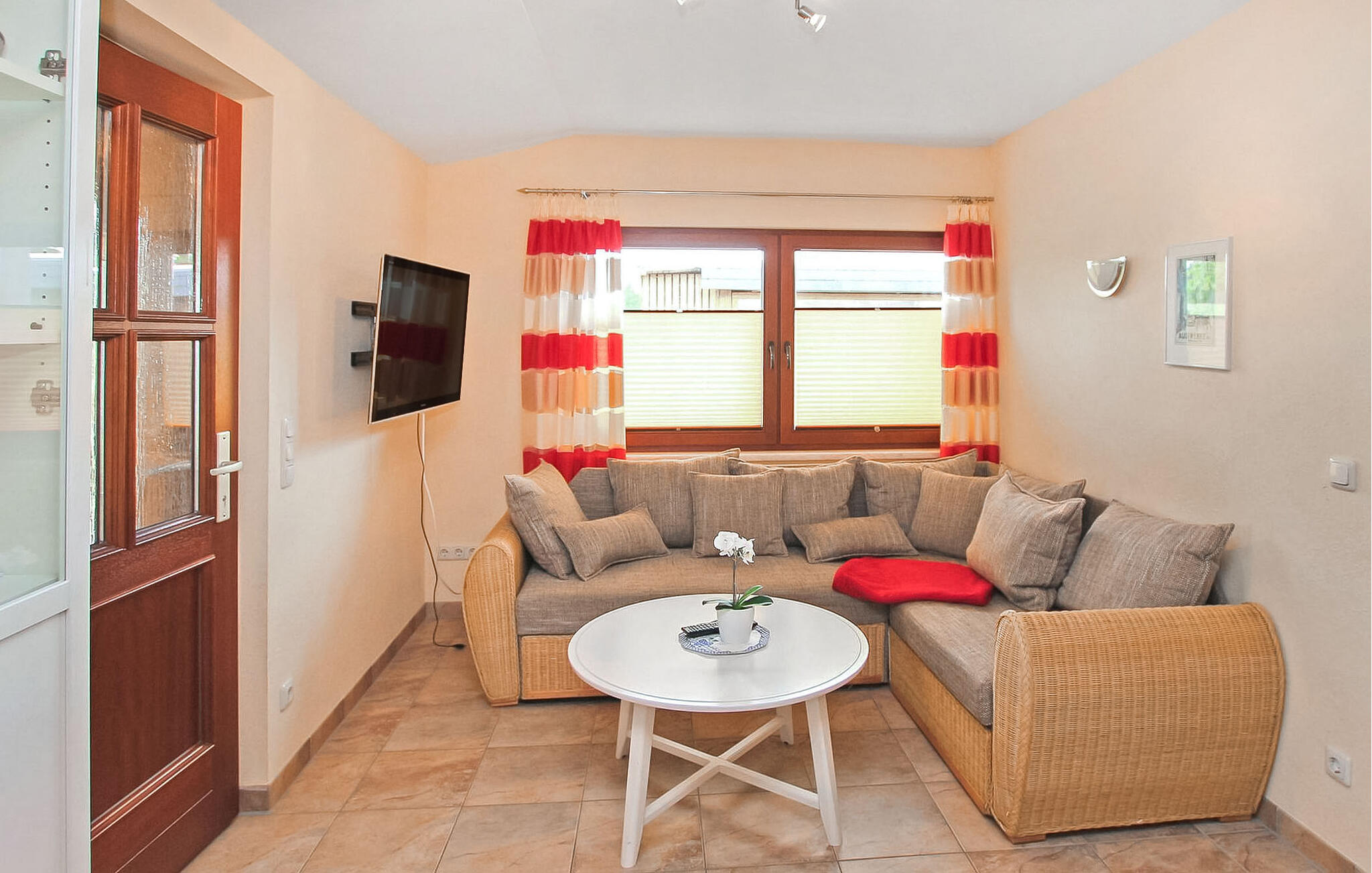Het ca. 55 m² grote appartement voor maximaal 4 personen en 1 baby heeft een woonkamer met open keuken (bank, flatscreentelevisie, radio/CD, eettafel, elektrisch fornuis met oven, koelkast met vriesvak, vaatwasser, magnetron, diverse kleine keukenapparaten), een slaapkamer (tweepersoonsbed), een kinderkamer (stapelbed), een badkamer (douche, WC, wasmachine), een kleine hal en een overdekt, gemeubileerd terras met barbecue.