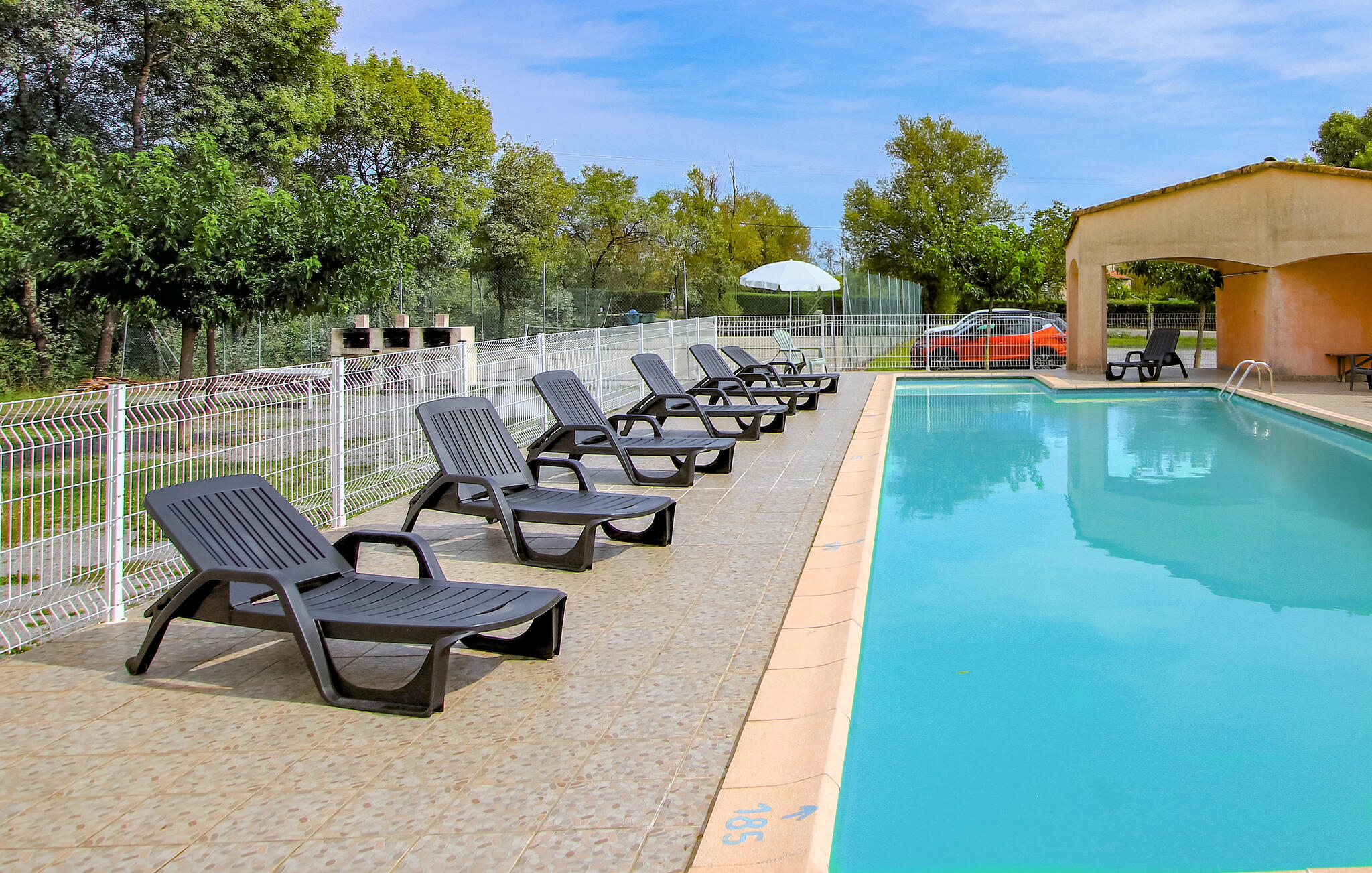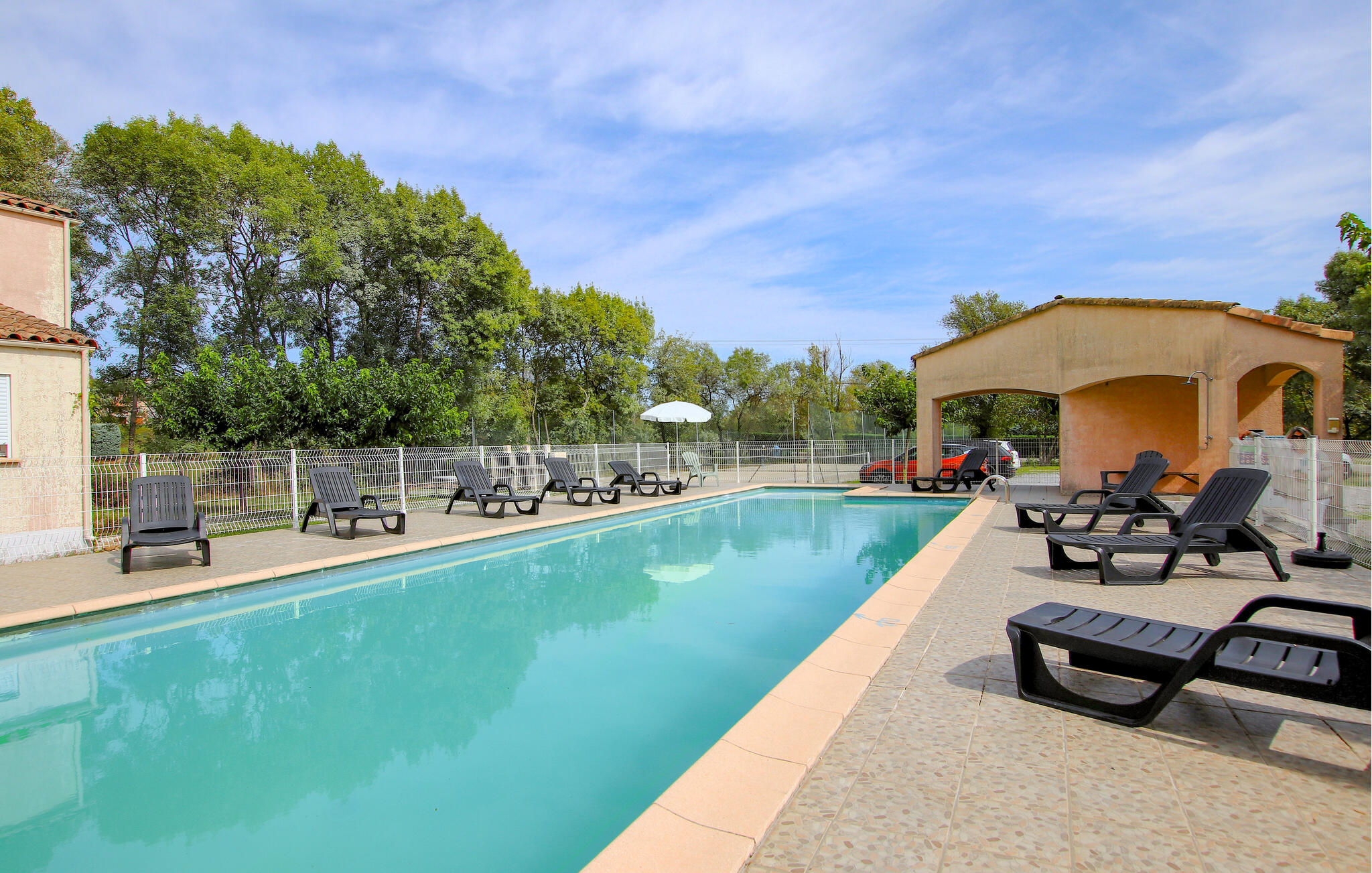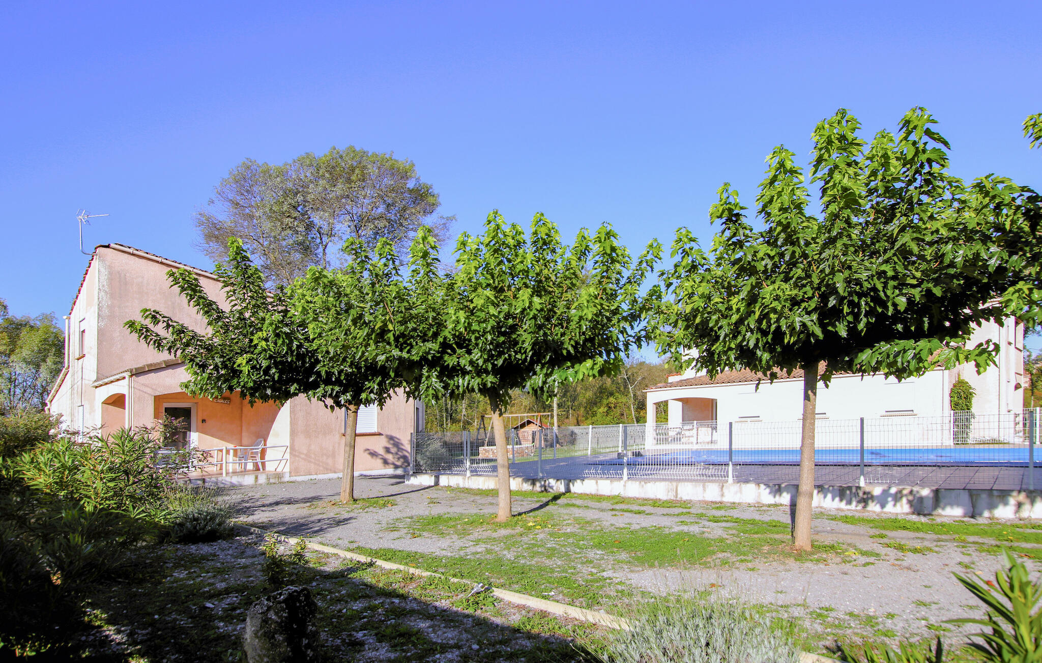 Stap naar buiten en geniet van de ruime buitenruimte. Profiteer van het grote gemeenschappelijke zwembad voor een verfrissende duik of ontspan op een van de vele ligstoelen. Speel een partijtje tennis op de tennisbaan of tafeltennis met het gezin. Kinderen kunnen zich uitleven in de kleine speeltuin met schommels en speelhuisje, terwijl jij ontspant op het schaduwrijke terras.