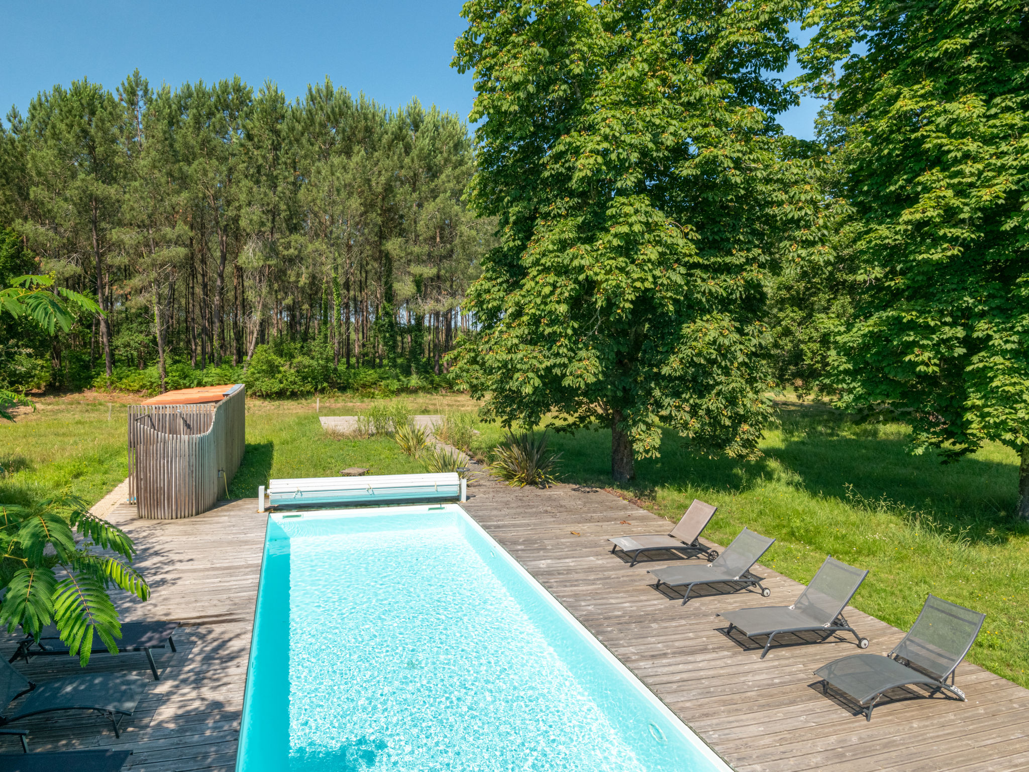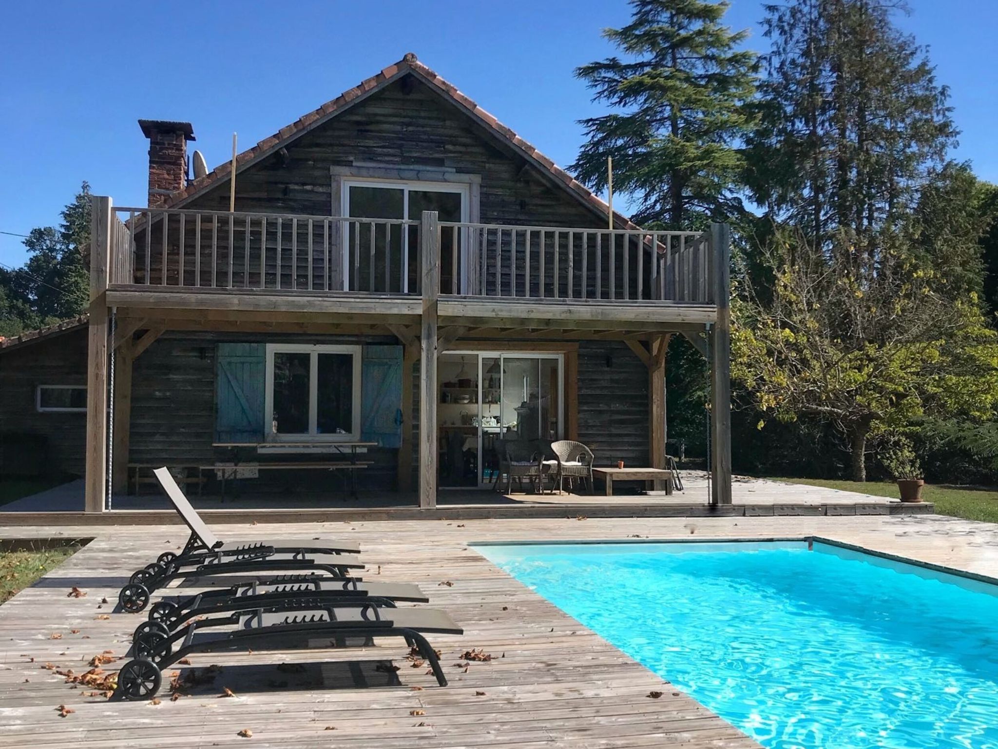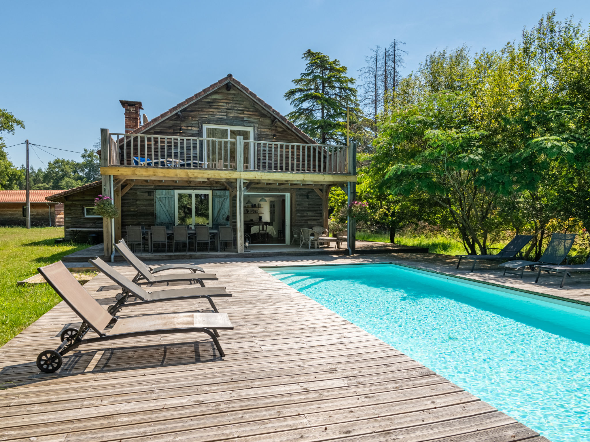 Mooi eengezinswoning "La Grange du Belon". Huurobject bestaande uit hoofd-/ bijgebouw, in het gehucht Le Belon, 2.5 km van het centrum van Mézos, 5.5 km van het centrum van Saint Julien en Born, 10 km van het centrum van Contis Plage, rustige ligging, 10 km van zee. Voor alleengebruik: wild terrein 800 m2 met bomen, openluchtzwembad verwarmd (10 x 4 m, 150 cm diepte, seizoensgebonden beschikbaarheid: 01.Mei. - 30.Sep.) met trap en oprolbaar afdekscherm. Buitendouche, onderhoud zwembad door de eigenaar/tuinman. Parkeerplaats (voor 3 auto's) bij het huis op het terrein. Winkel 2.5 km, supermarkt 5 km, bushalte "Gare de Saint Julien en Born" 4 km, zandstrand "Contis Plage" 10 km. De eigenaar accepteert geen jeugdgroepen.