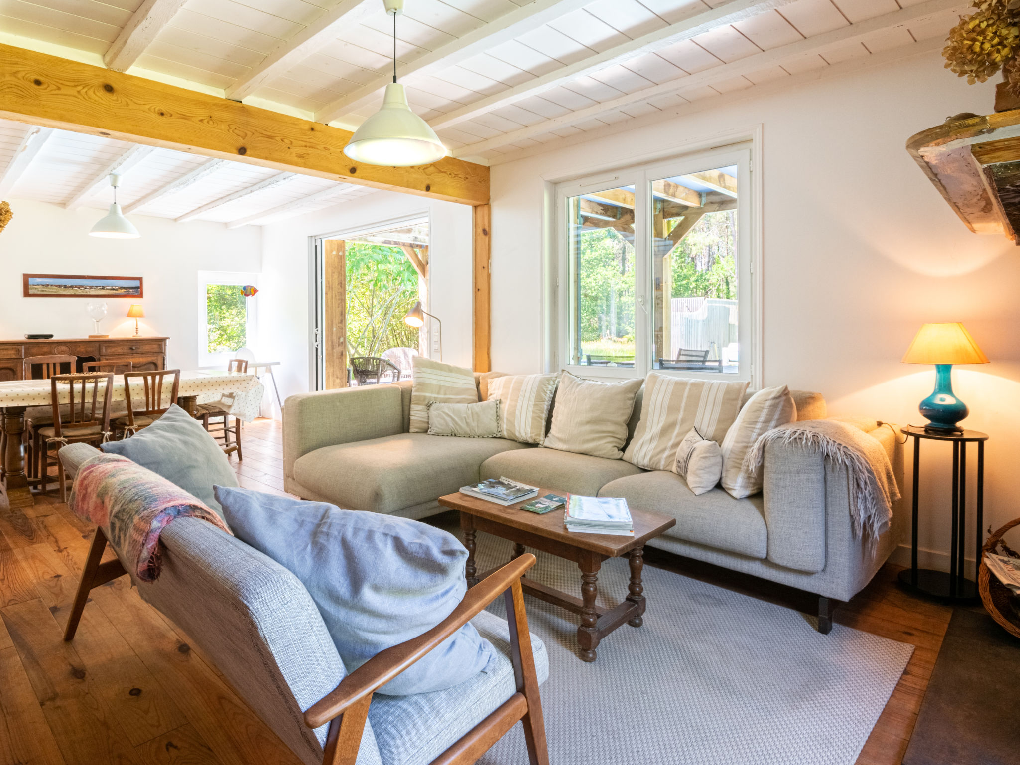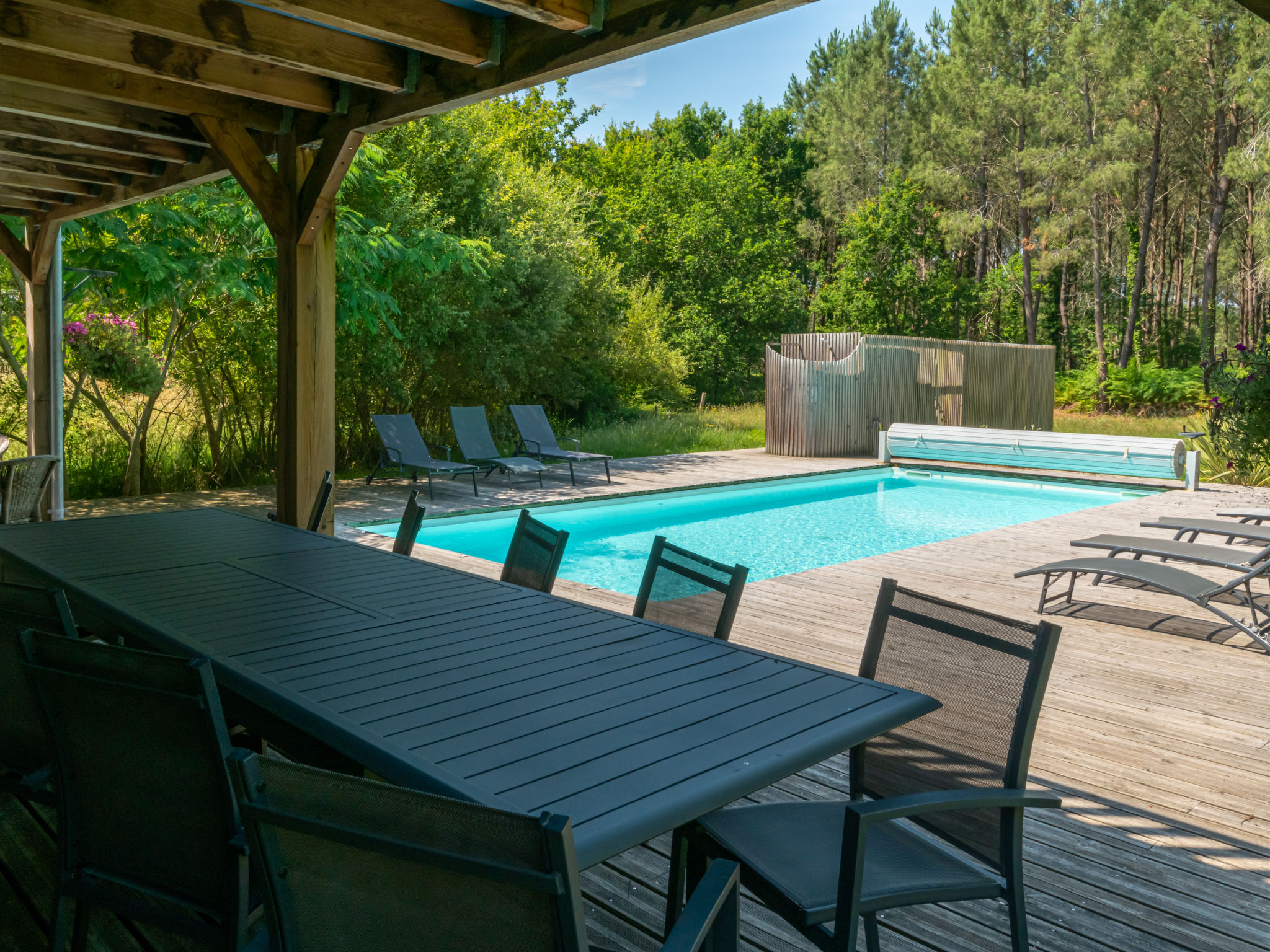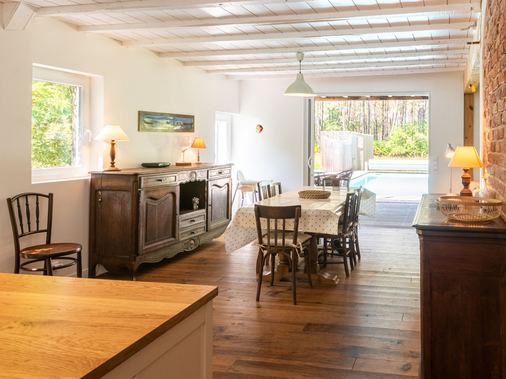 Mooi eengezinswoning "La Grange du Belon". Huurobject bestaande uit hoofd-/ bijgebouw, in het gehucht Le Belon, 2.5 km van het centrum van Mézos, 5.5 km van het centrum van Saint Julien en Born, 10 km van het centrum van Contis Plage, rustige ligging, 10 km van zee. Voor alleengebruik: wild terrein 800 m2 met bomen, openluchtzwembad verwarmd (10 x 4 m, 150 cm diepte, seizoensgebonden beschikbaarheid: 01.Mei. - 30.Sep.) met trap en oprolbaar afdekscherm. Buitendouche, onderhoud zwembad door de eigenaar/tuinman. Parkeerplaats (voor 3 auto's) bij het huis op het terrein. Winkel 2.5 km, supermarkt 5 km, bushalte "Gare de Saint Julien en Born" 4 km, zandstrand "Contis Plage" 10 km. De eigenaar accepteert geen jeugdgroepen.