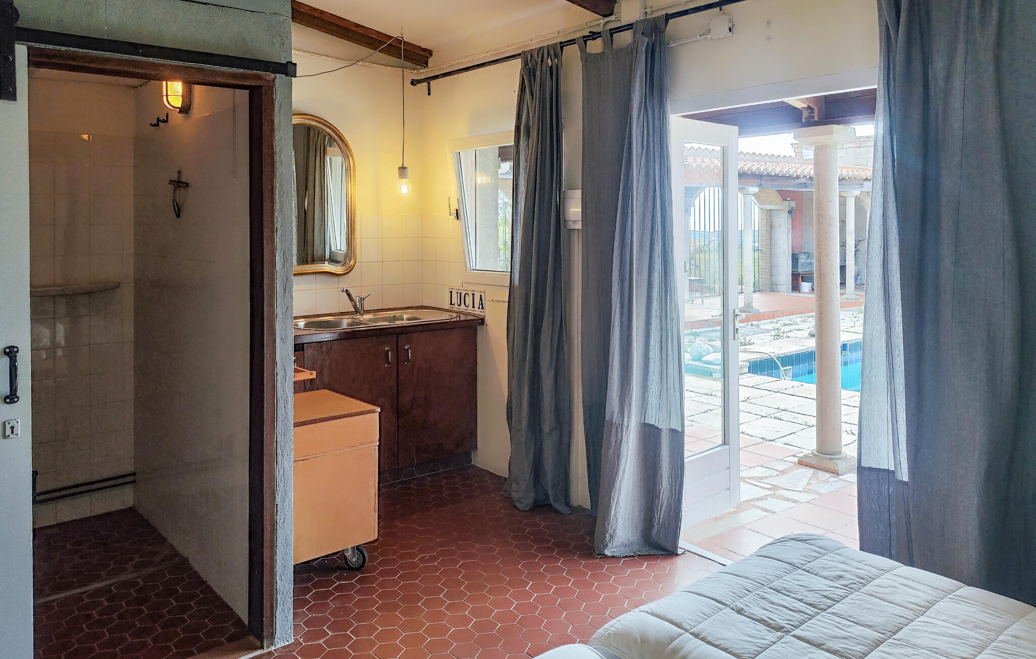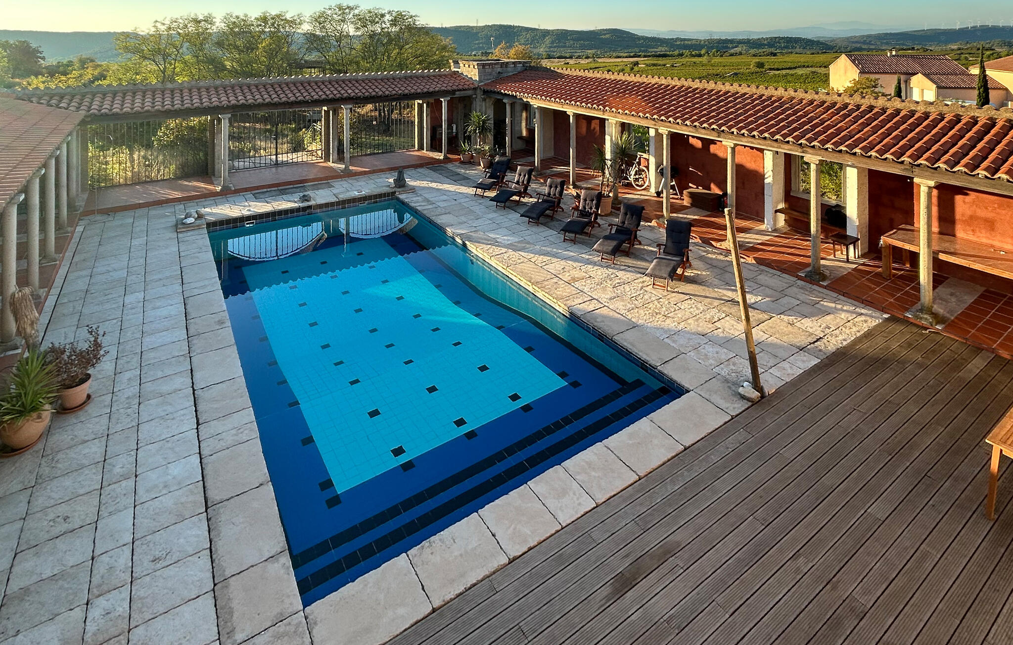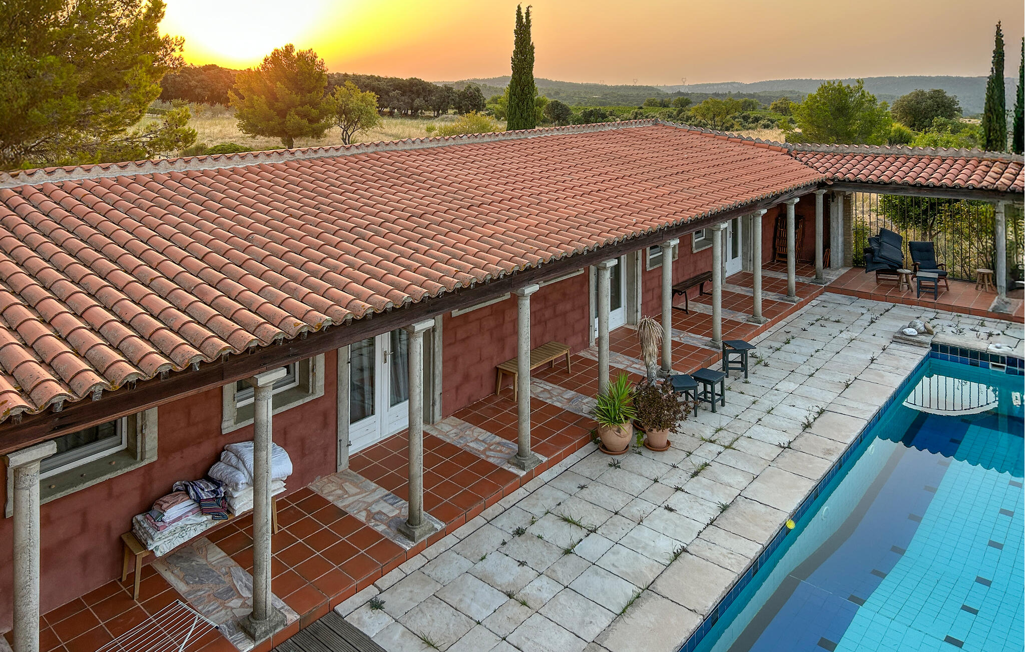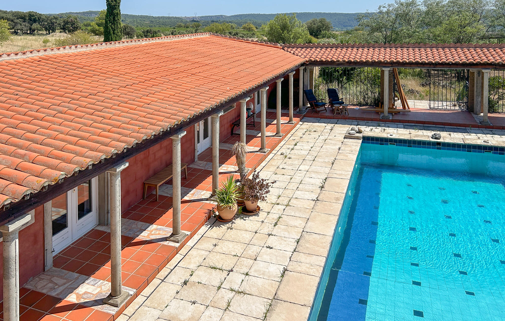 De grote binnenplaats met zwembad vormt het middelpunt van het pand en nodigt je uit om te zwemmen, zonnen en ontspannen. Onder de arcades vind je schaduwrijke plekjes om buiten te eten of rustig te lezen. Geniet vanaf het balkon van het weidse uitzicht over het prachtige landschap en laat je betoveren door de mediterrane flair. Het is hier bijzonder sfeervol bij zonsondergang.