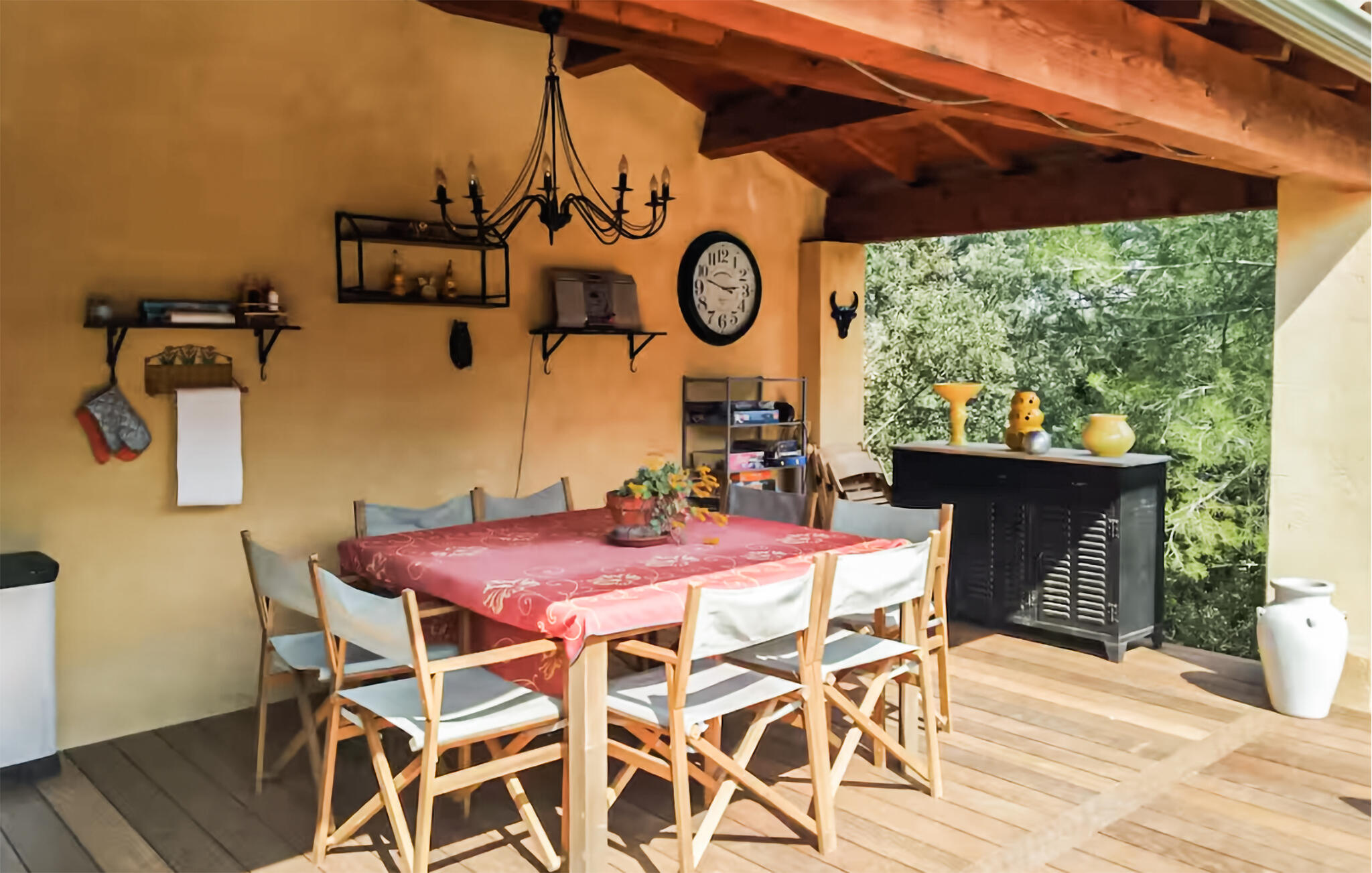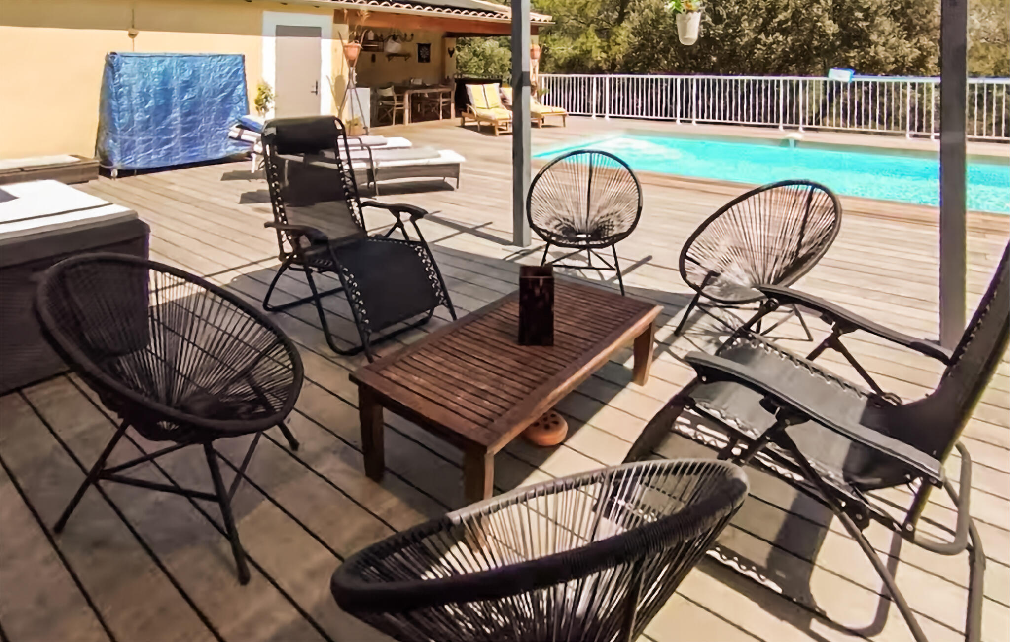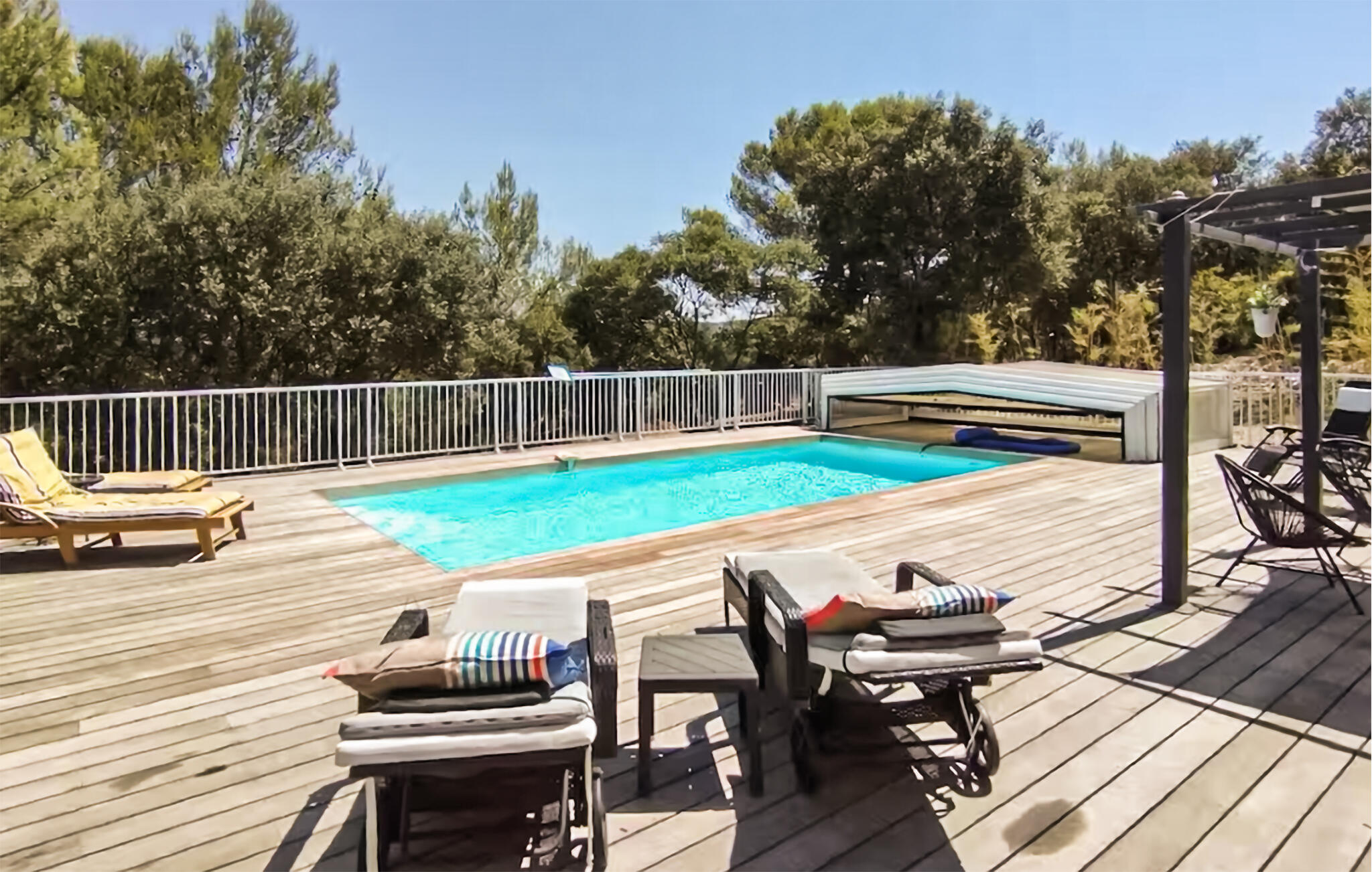 Stap naar buiten en geniet van de Provençaalse zon. Ontspan op de ligstoelen bij het privézwembad of trek je terug op de schaduwrijke plekjes onder de pergola. Gebruik het tweede terras om de dag flexibel in te delen. Bereid maaltijden in de overdekte zomerkeuken en eet buiten aan de grote tafel. Blijf `s avonds hangen in de loungemeubels met uitzicht op het zwembad. Het omheinde terrein biedt rust, privacy en de hele dag zon.