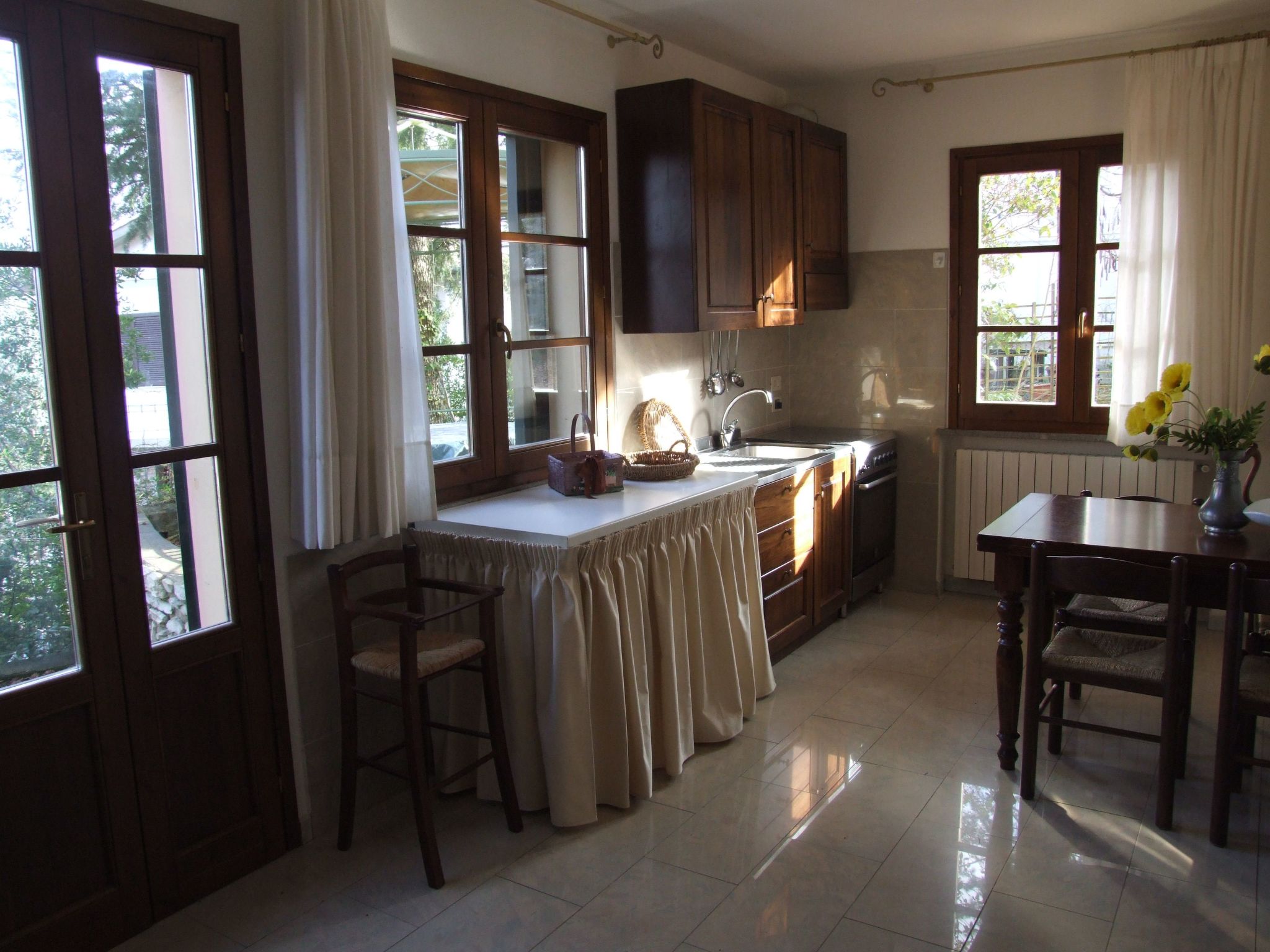 Beautiful ground floor flat with separate entrance and terrace.From the garden on the east side you enter the living room.In front of this entrance is a gazebo with a marble table and wrought-iron sofas with comfortable cushions. The flat's private garden is also equipped with a barbecue, an outdoor shower and two deck chairs. Entering the living room, on the left is the well-equipped kitchen with gas hob, gas oven, refrigerator/freezer, dishwasher, toaster and mocha and filter coffee machine. In front of the kitchen is a wooden table with six chairs. The living room also has a sofa that can be converted into a double bed or two single beds.The living room leads to the bedroom, which has a French window, a double bed, an extra bed and a door to the bathroom with shower. The flat is very well equipped and has Wi-Fi, a washing machine and central heating.The flat and bathrooms are barrier-free and therefore also accessible to people with disabilities.The holiday home with a 2000 sq m garden is surrounded by a chestnut forest and is only 800 metres from the village, and consists of three holiday flats.Situated 500 metres above sea level, the villa is ideal for a relaxing holiday.The house is luxurious and recently renovated. The floors are light-coloured and of the same quality and colour throughout the house, as are the tiles in the kitchen and bathrooms. The exterior of the house is well maintained and takes into account the surroundings.There is a swimming pool (12x6 m, open from April to October).In Marina di Castagneto our guests have access to a Maremma pine forest (with changing room, toilets, water, deckchairs and parasols) and access to a free beach.The medieval village of Sassetta is situated on the hills of the Costa degli Etruschi, in a very green area from which you can enjoy amazing views of the woods and the sea. From here you can make excursions to beautiful villages such as Bolgheri (famous for its Sassicaia wine) or Massa Marittima, as well as visit the Etruscan necropolis of Populonia (25 km).MANDATORY PORTA A PORTA WASTE COLLECTION: if rubbish accumulates at check-out, a charge will be deducted from the security deposit. IT049019B4EMU2MK5E