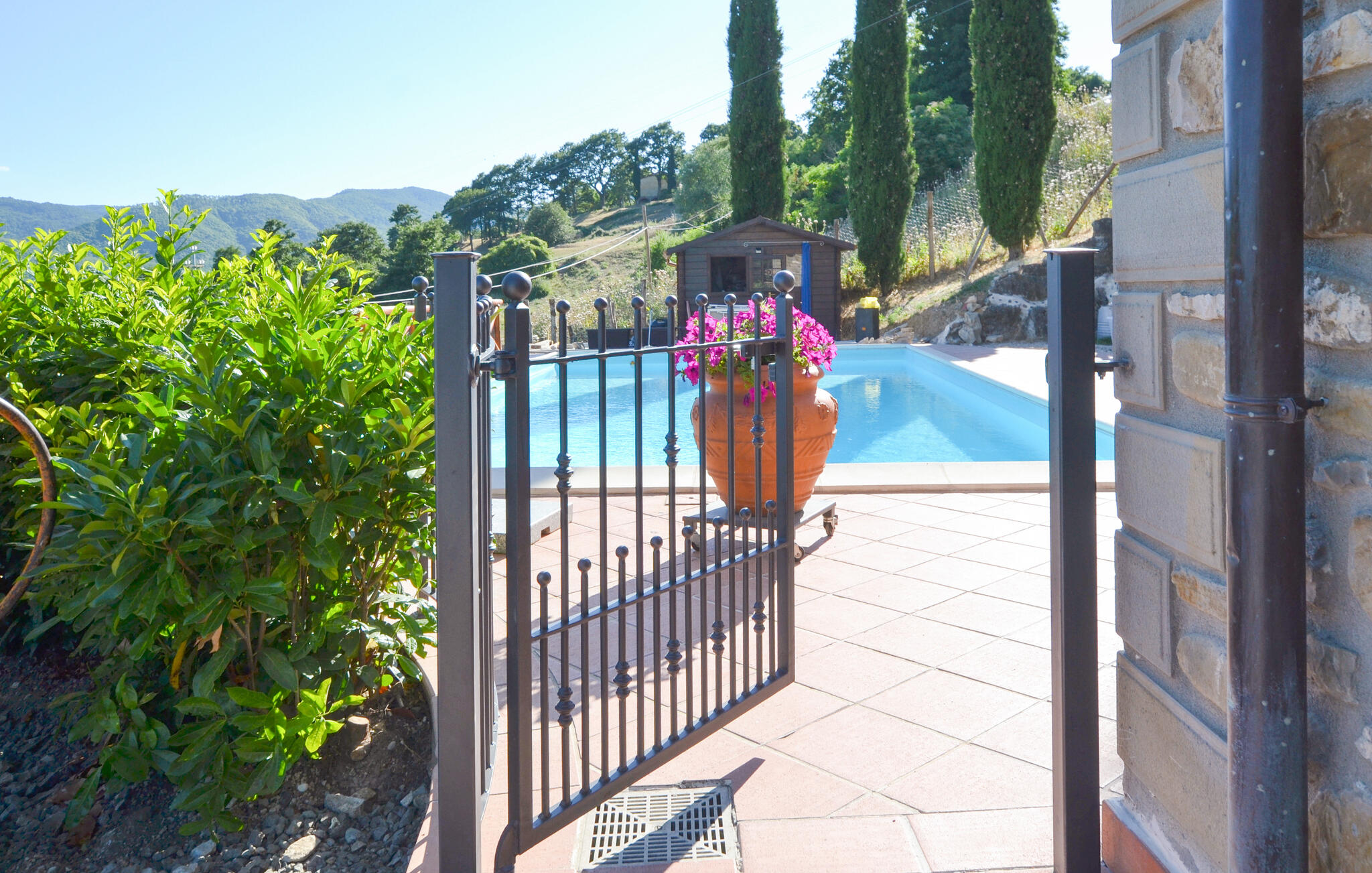 RookalarmOmheind zwembadBuitendoucheZwembad: juni - eind septemberOmheind grondstuk. Hoogte : 120cm