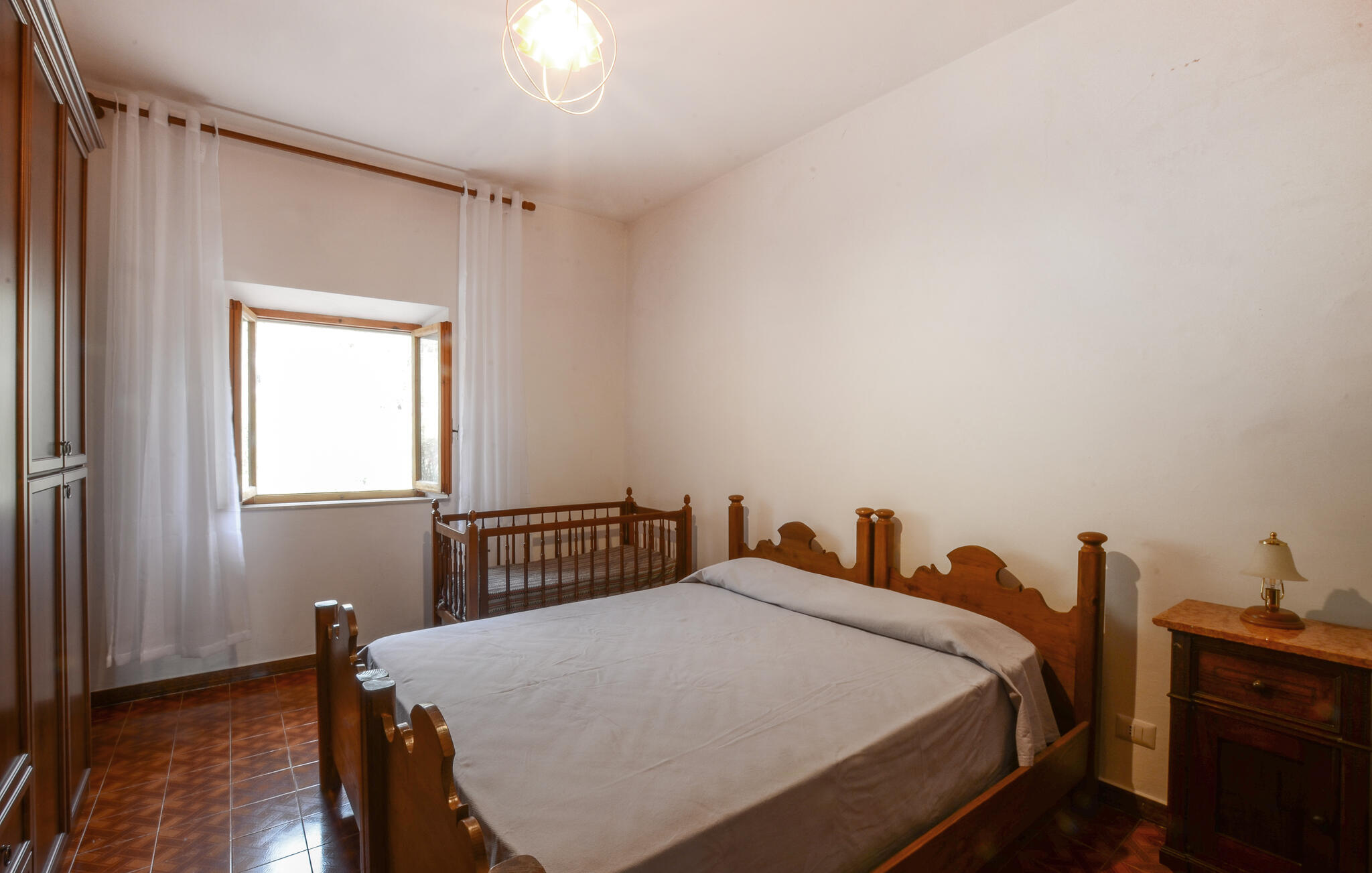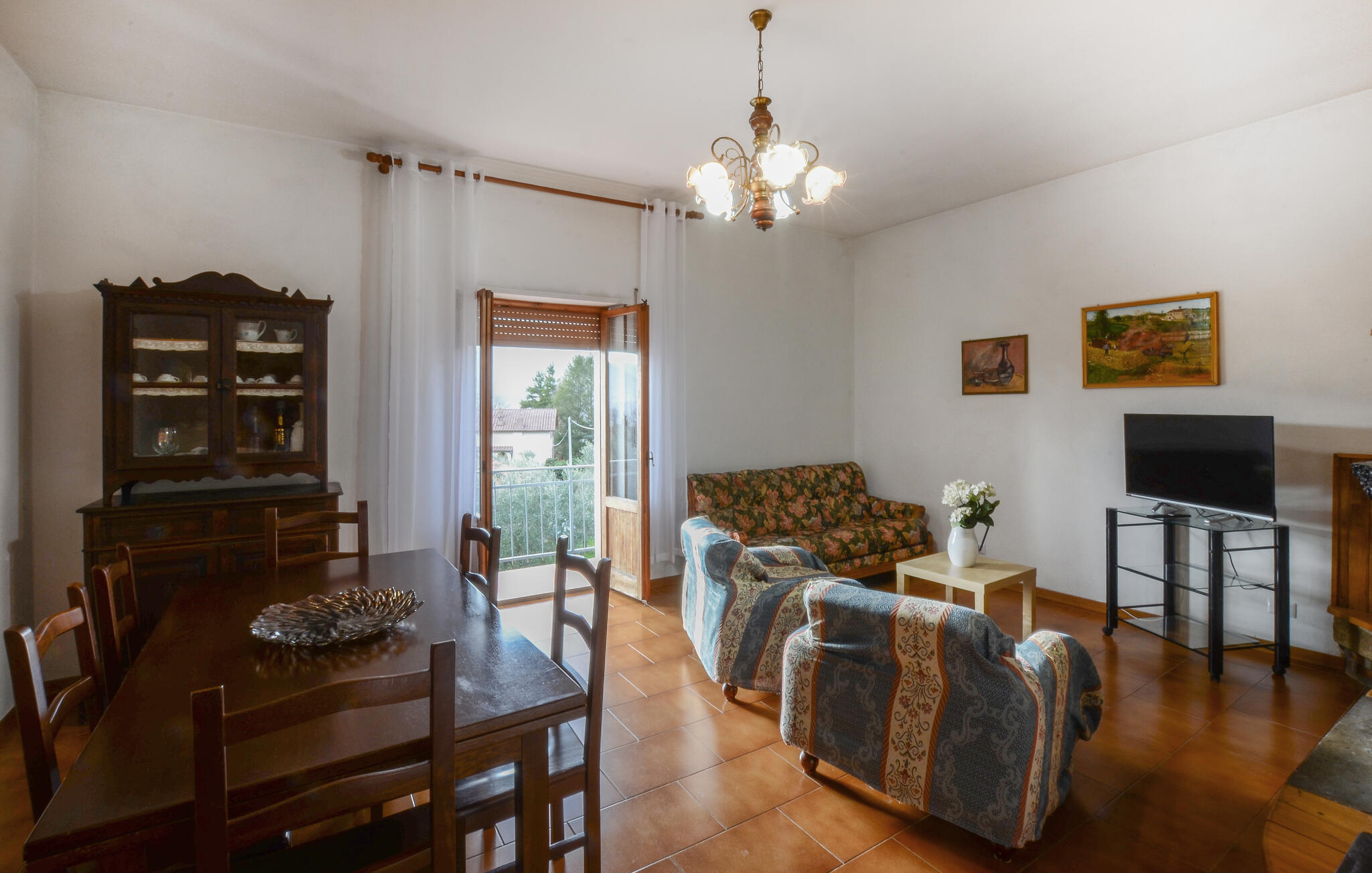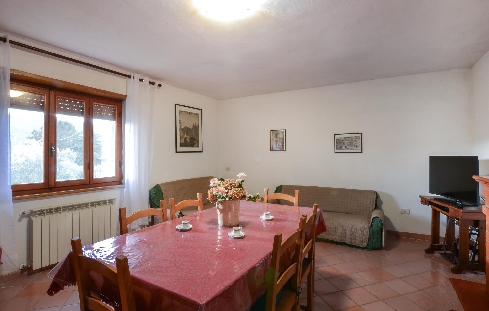 Stap binnen en geniet van de eenvoudige, authentieke sfeer van dit huis. De woonkamer verwelkomt je met klassieke banken, warm houten meubilair en een opvallende open haard die de kamer karakter geeft. Maak het jezelf gemakkelijk met een avond voor de tv of gezellig aan de eettafel. De aparte keuken met rustieke tegels, houten kasten en ronde tafel biedt je voldoende ruimte om Italiaanse specialiteiten te bereiden. Open de ramen en laat de milde Toscaanse lucht binnen terwijl je samen kookt en geniet.