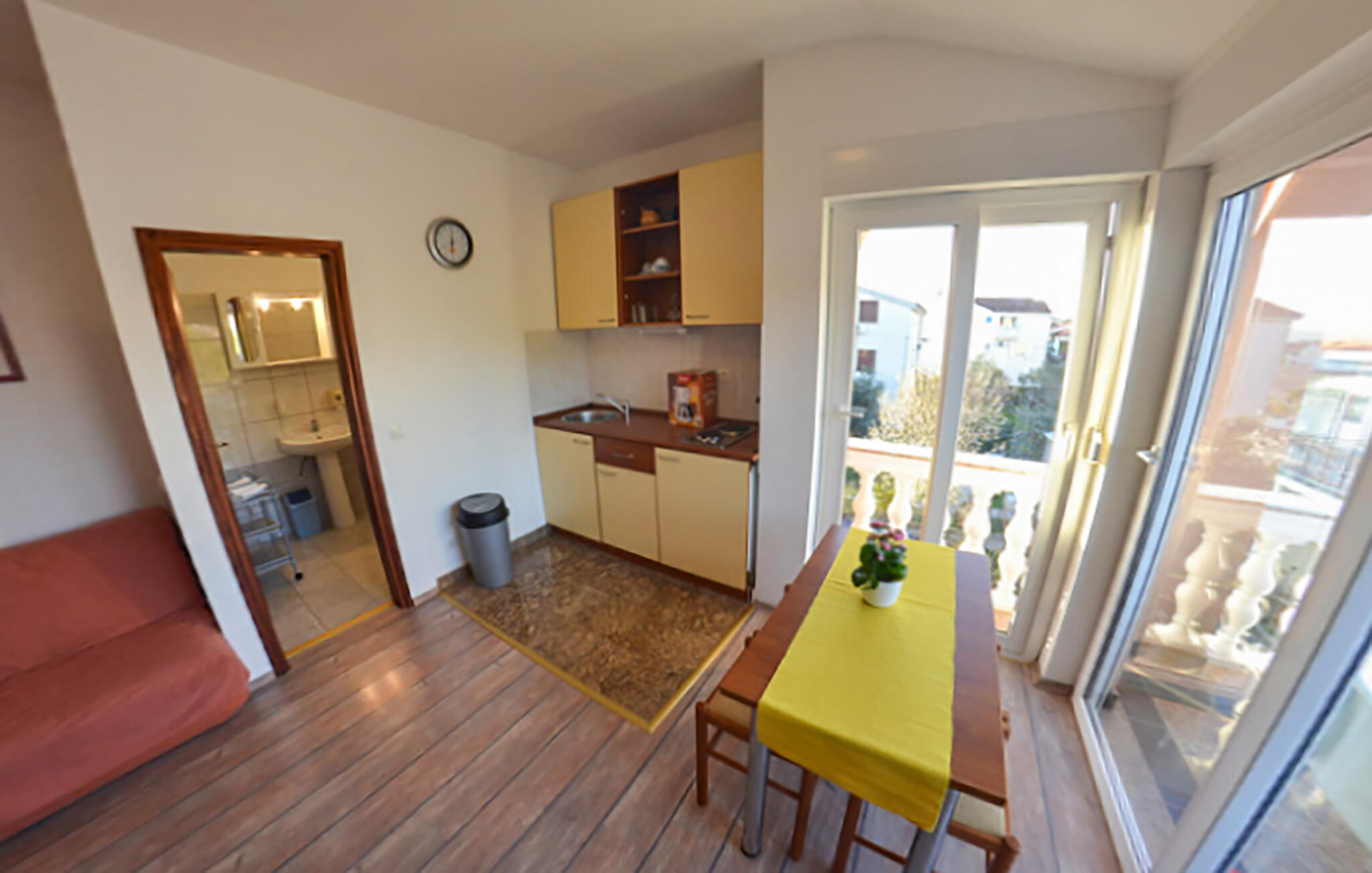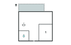 Slaapkamer(1x 2-persoonsbed(den)), Theekeuken(1x Opklapbed(den) of matras(sen)), Badkamer(Toilet: warm en koud water, Douche), Terras of vergelijkbaar(Balkon)