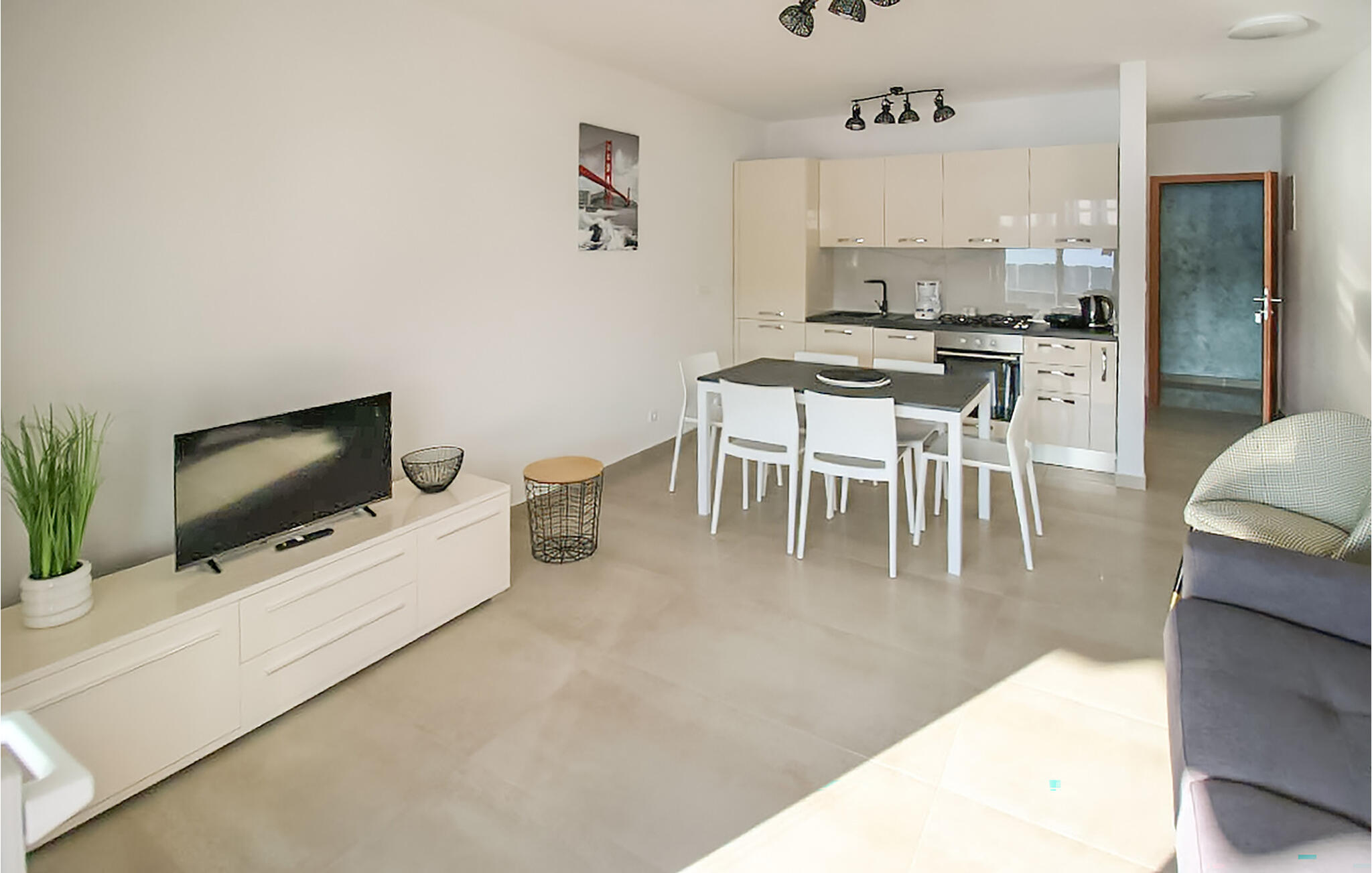 Kom binnen in de eetkeuken en doe alsof je thuis bent in de open, lichte kamer. Gebruik de functionele kitchenette om kleine maaltijden te bereiden en geniet ervan aan de eettafel met uitzicht naar buiten. Ontspan op de bank, die prachtig opgaat in de woonkamer, en gebruik de tv voor een rustige avond.
