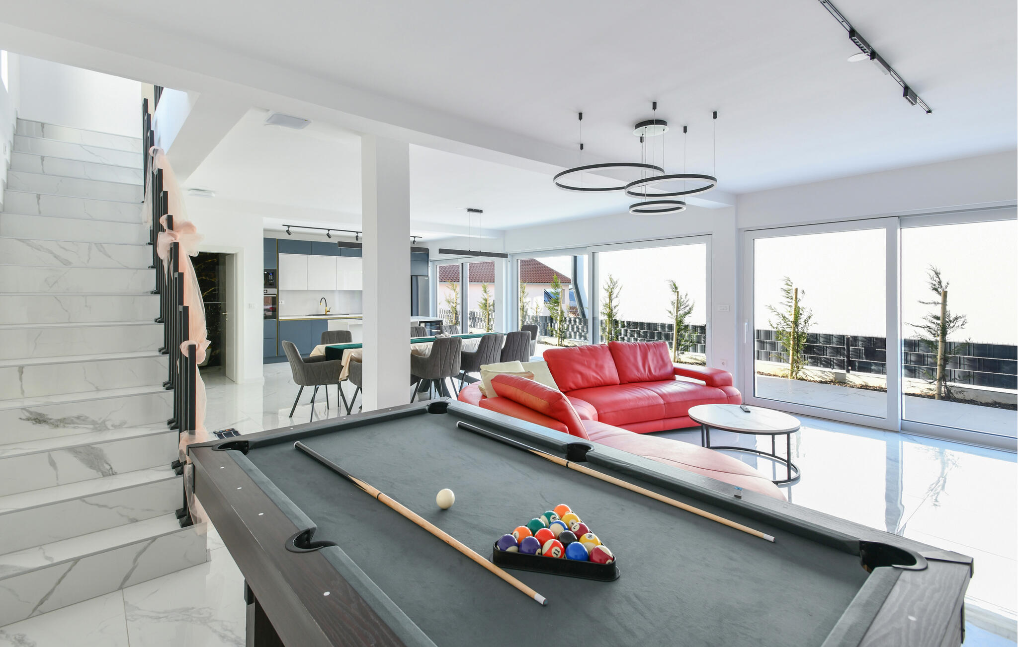 Een ander zwembad wacht op je in de buitenruimte, waar je kunt genieten van lange uren zon. Daag jezelf tussendoor uit aan de tafeltennistafel, trakteer jezelf op gezellige momenten in de whirlpool bij zonsondergang en vier jullie tijd samen met sfeervolle barbecue-avonden.