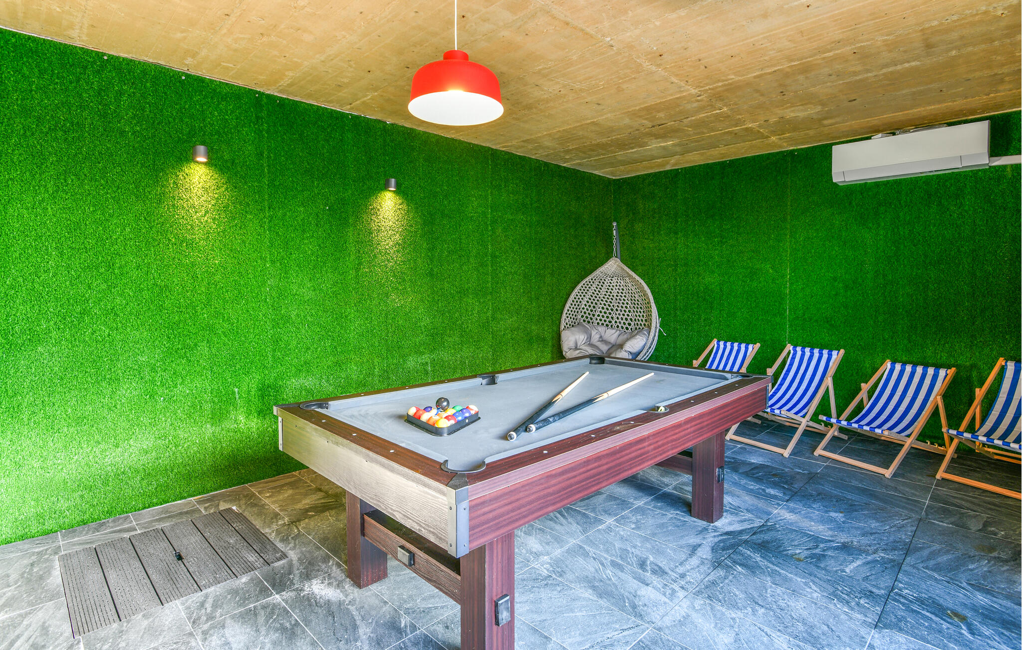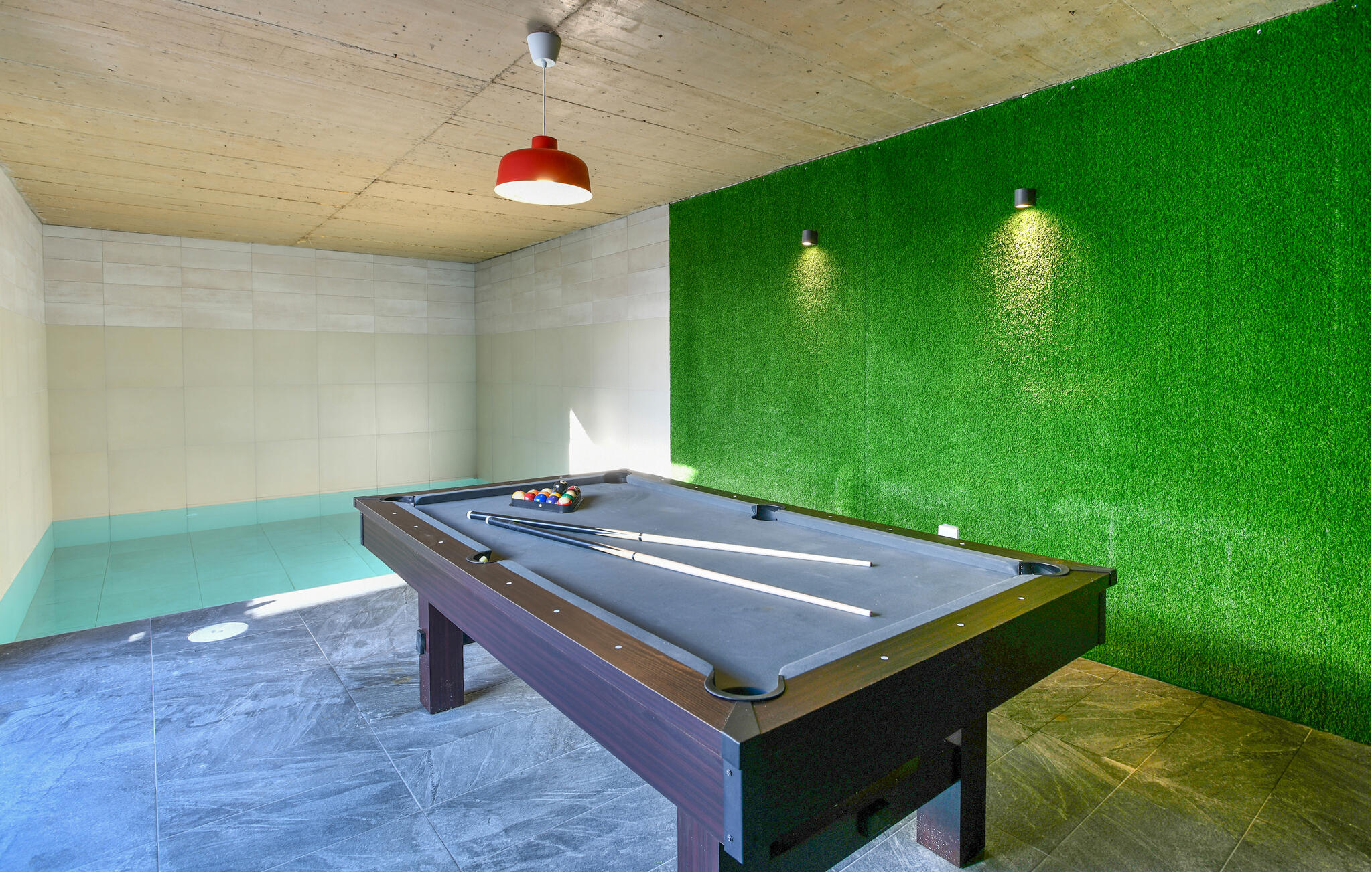 Een ander zwembad wacht op je in de buitenruimte, waar je kunt genieten van lange uren zon. Daag jezelf tussendoor uit aan de tafeltennistafel, trakteer jezelf op gezellige momenten in de whirlpool bij zonsondergang en vier jullie tijd samen met sfeervolle barbecue-avonden.
