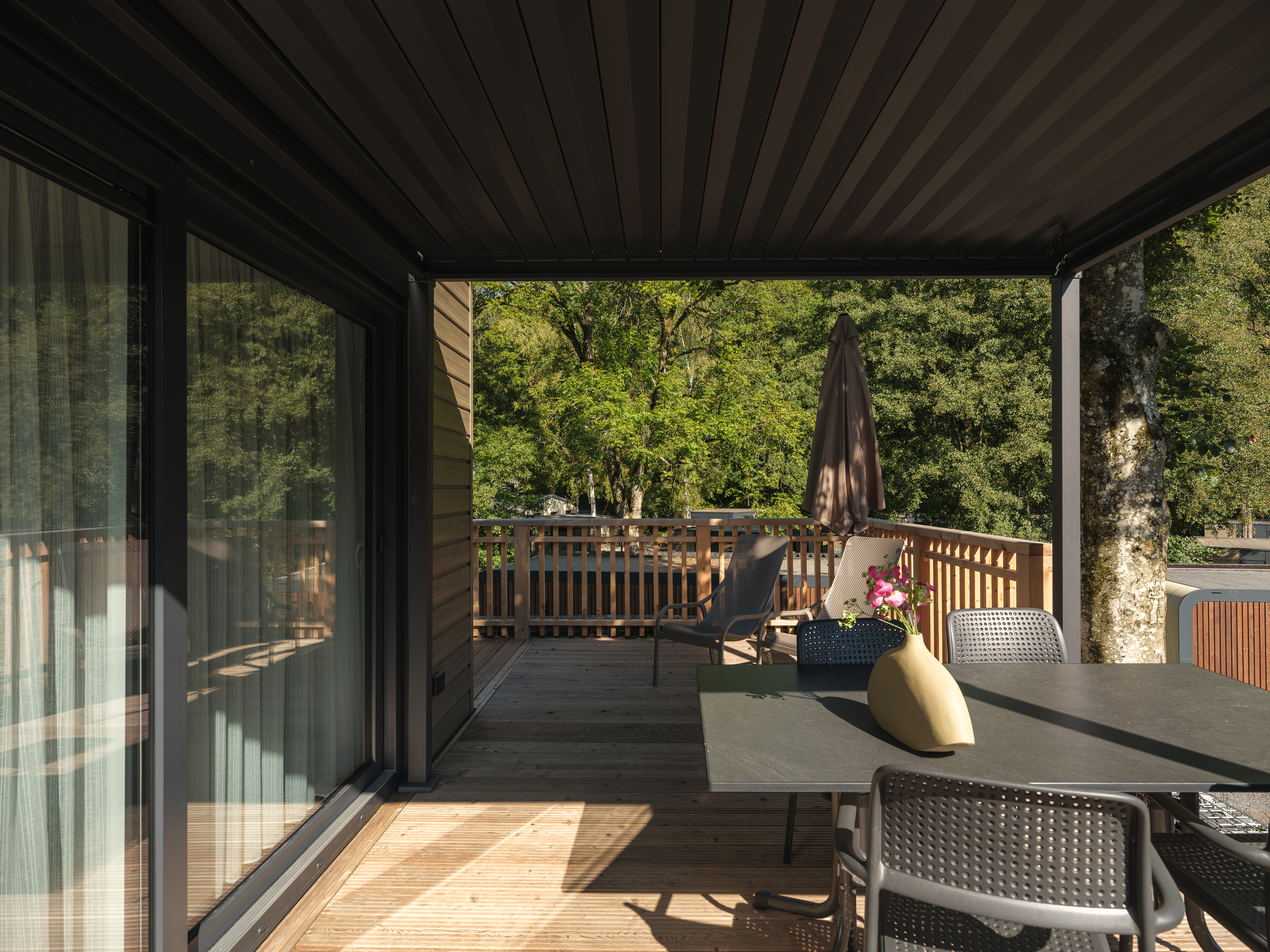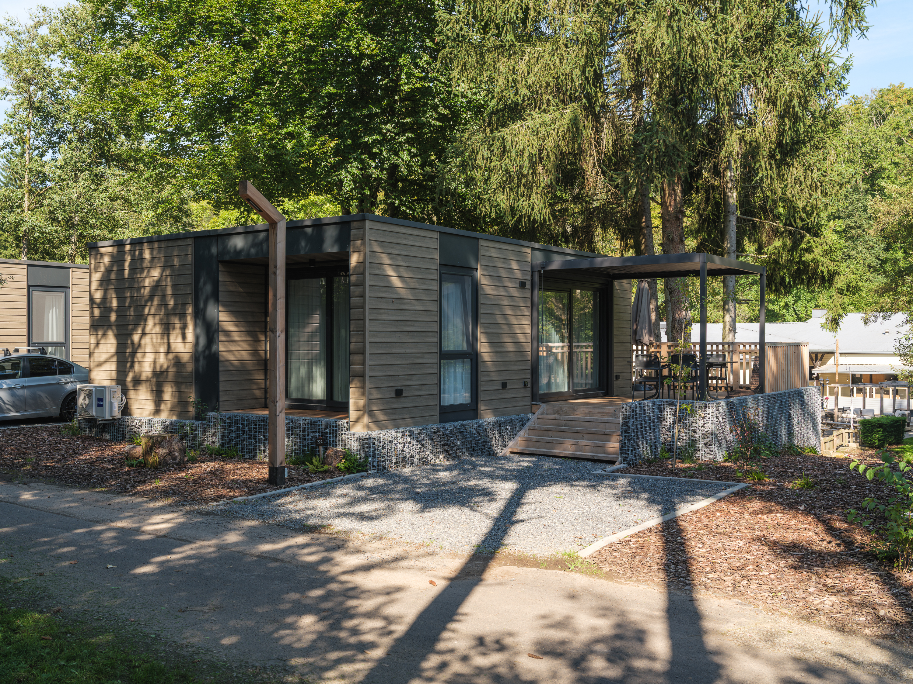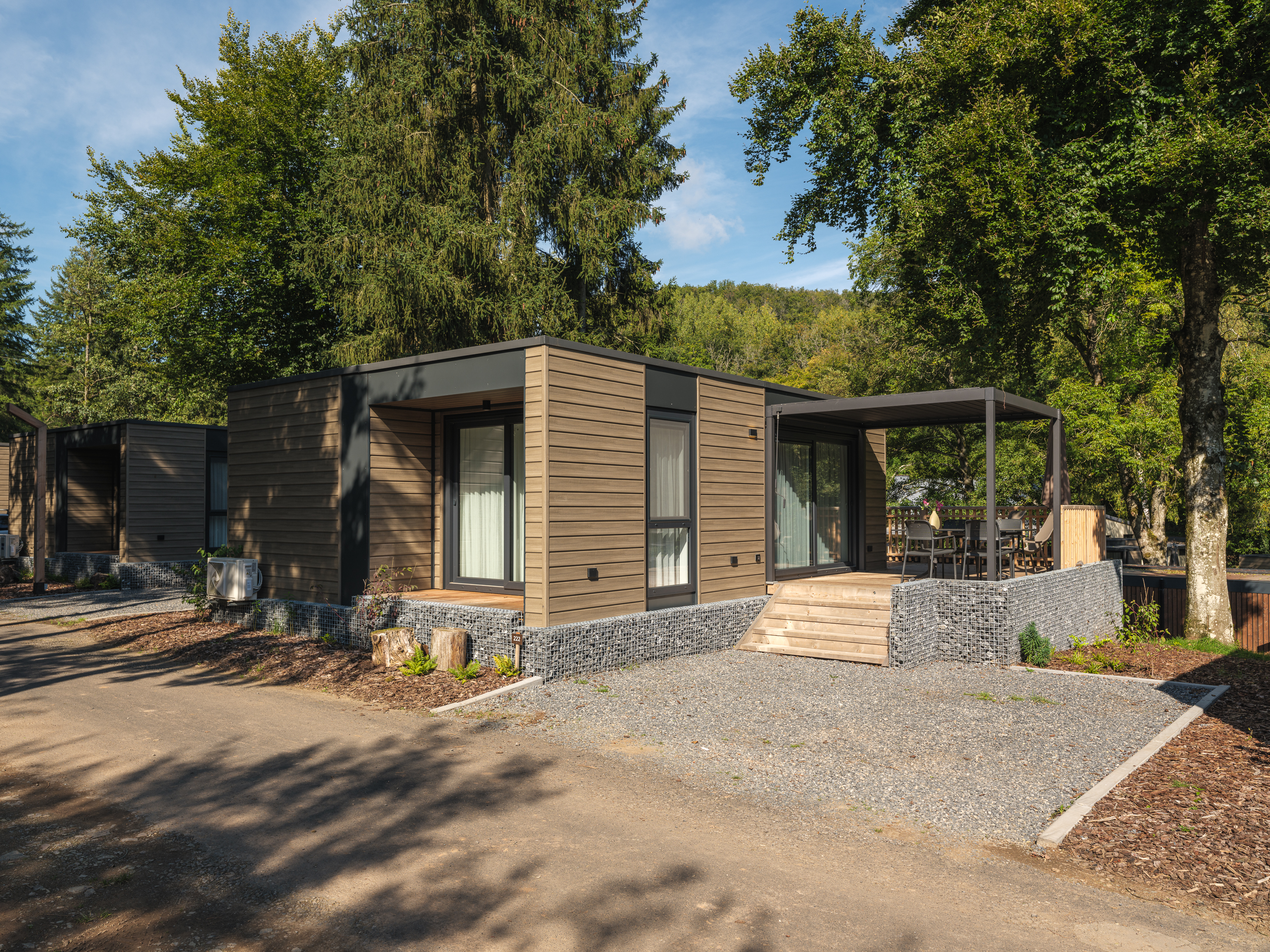 De woning beschikt over twee comfortabele slaapkamers die via de gang te bereiken zijn. Daarnaast is er een moderne badkamer met een ruime douche, een wastafelmeubel en een toilet. Voor extra gemak heeft de lodge een tweede toilet. De woonkamer geeft direct toegang tot het terras, waar je kunt ontspannen en genieten van de groene omgeving, eventueel onder de beschutting van de veranda.