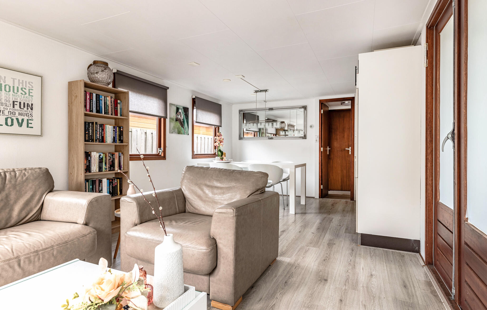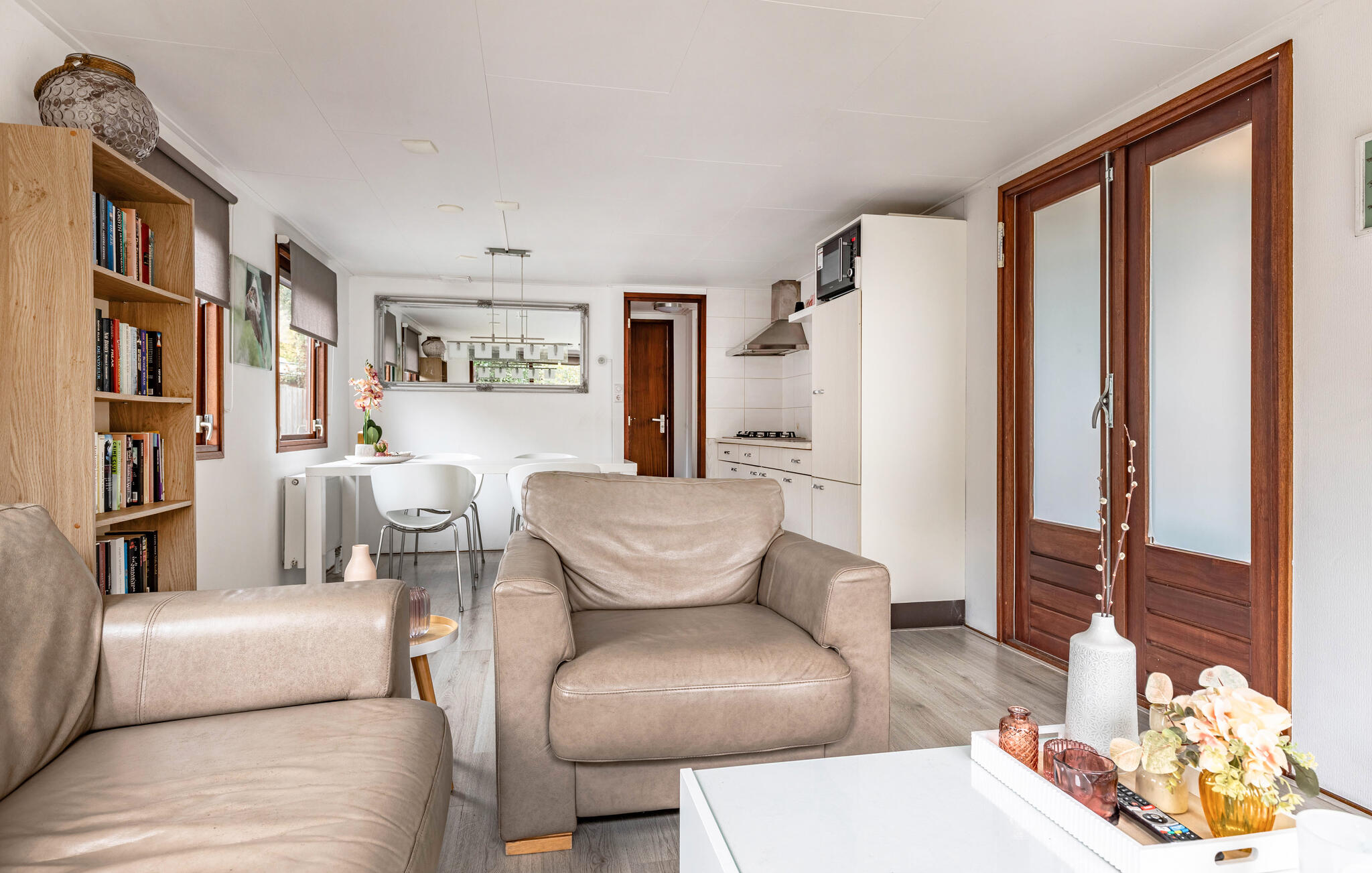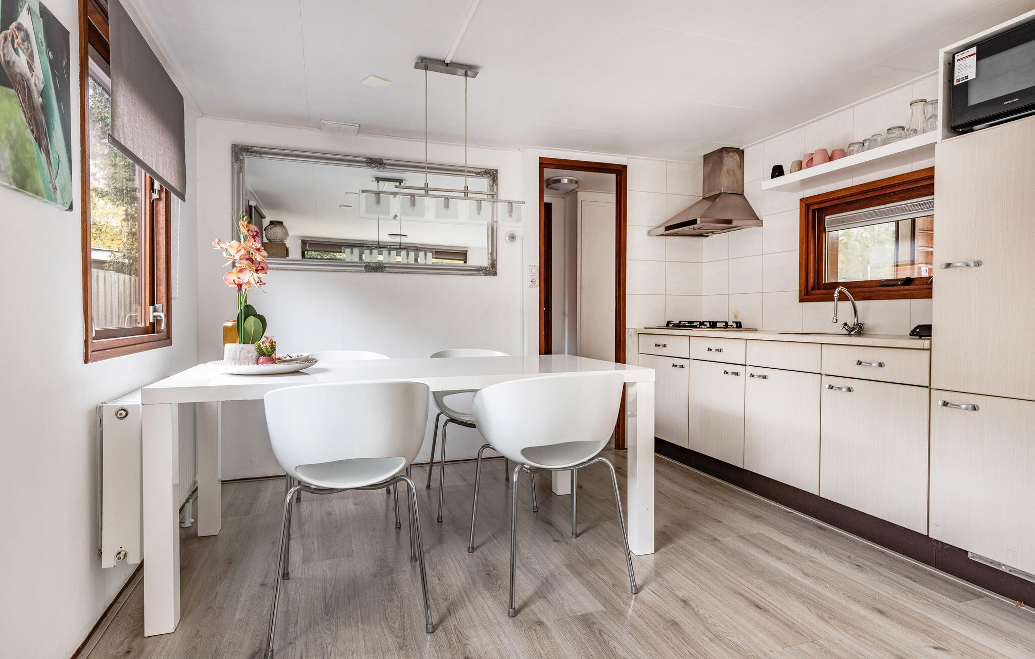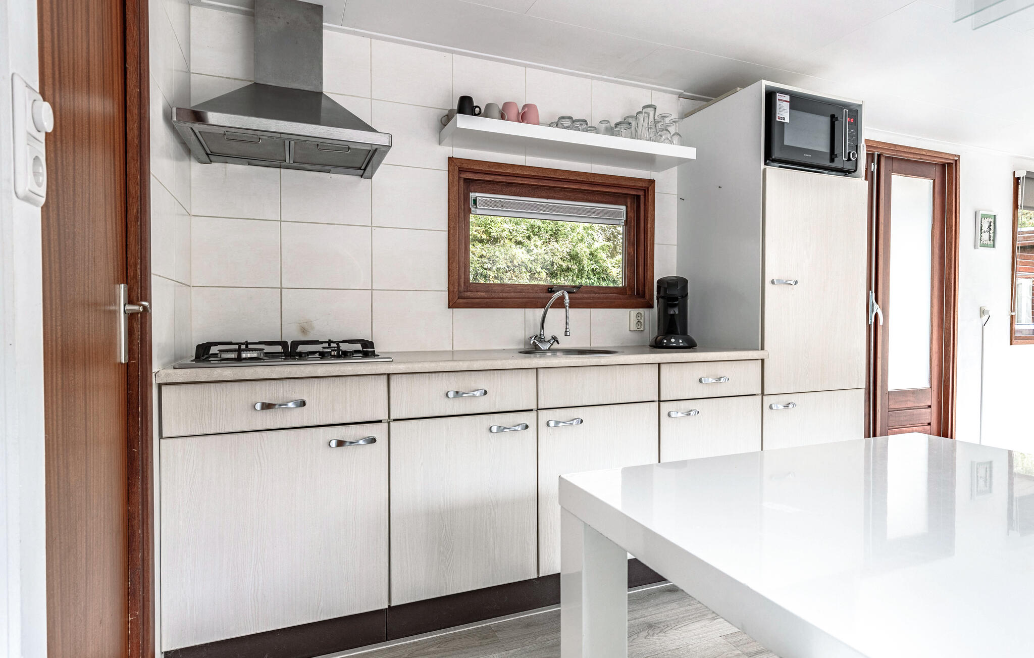 Geniet van een ontspannen vakantie in deze prachtig ontworpen accommodatie in een rustige, groene omgeving. Kom binnen in de vriendelijke woonkamer, die veel daglicht ontvangt door de grote ramen en een aangename openheid uitstraalt. Het harmonieuze kleurenschema en het zorgvuldig geselecteerde meubilair creëren een gezellige sfeer. Maak het jezelf gemakkelijk en geniet van het uitzicht op het groen. Neem je maaltijden aan de eettafel bij de keuken, die uitnodigt om samen maaltijden te bereiden.