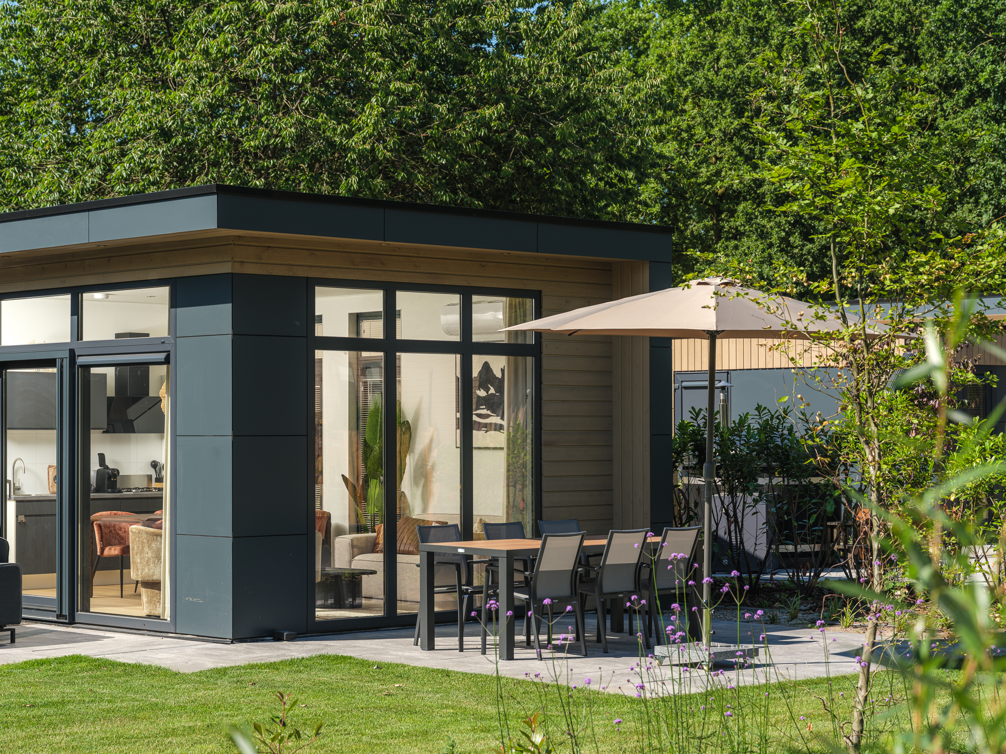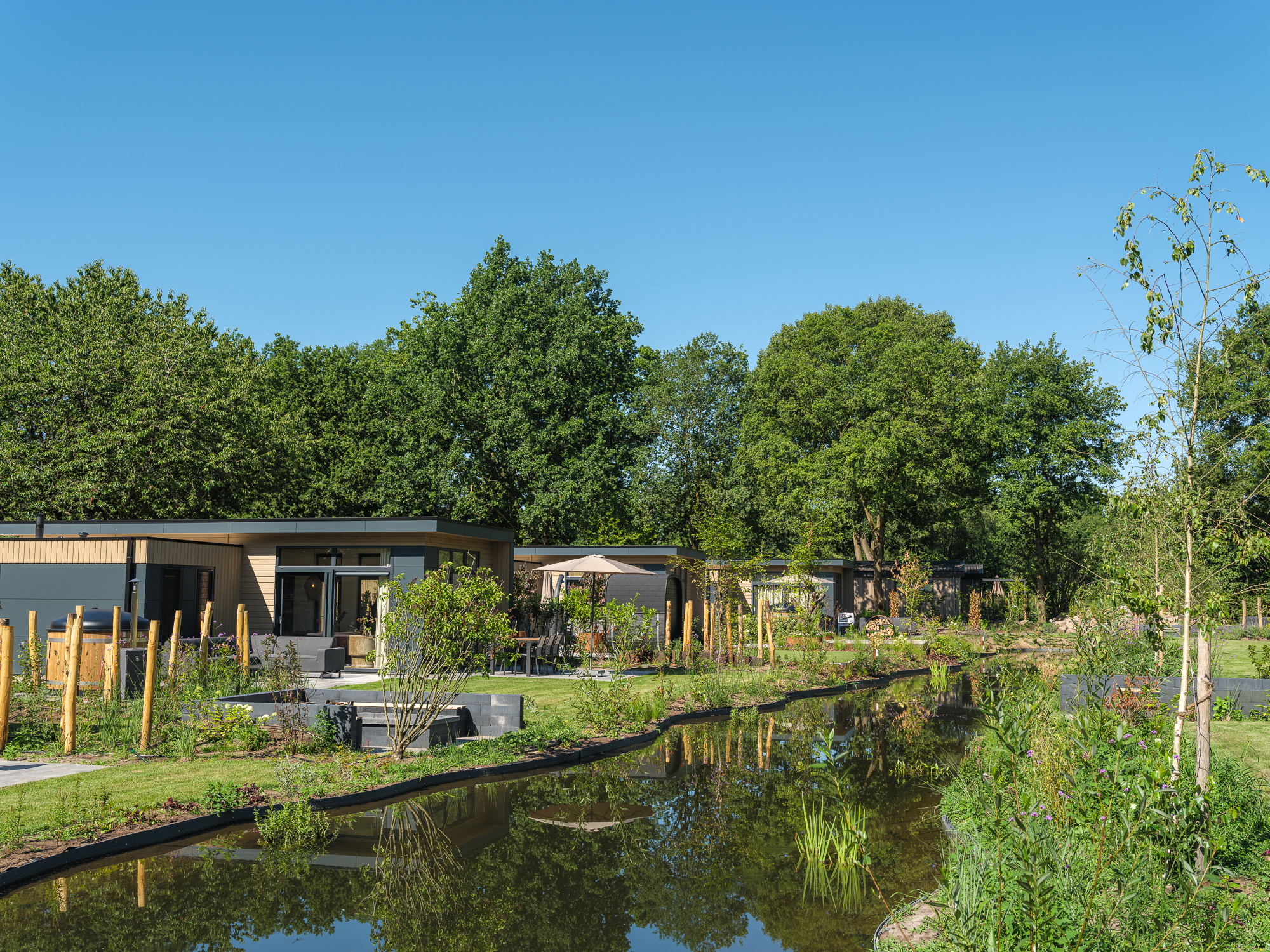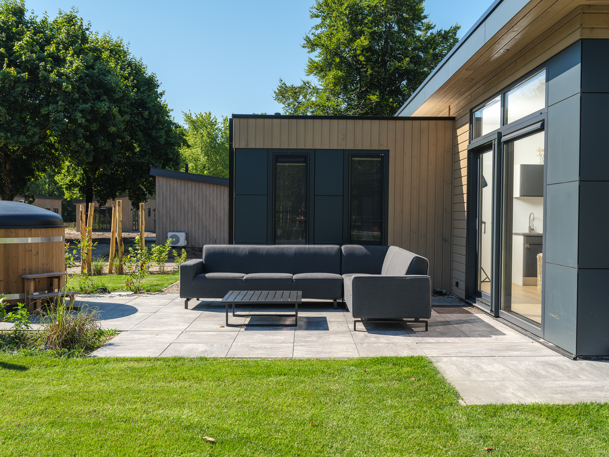 Naast de stijlvolle inrichting biedt de lodge ook extra comfort met airconditioning, die zowel kan verwarmen als koelen, voor een optimaal binnenklimaat in elk seizoen. Buiten geniet u van de luxe pergola, zodat u zelfs op warme dagen of tijdens een lichte regenbui heerlijk buiten kunt zitten.
