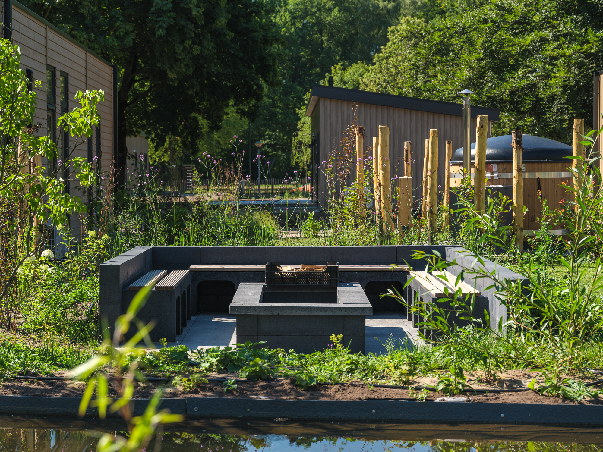 De zitlounge met buitenhaard is de perfecte privé relaxplek die je vakantiehuis helemaal compleet maakt. Hier kun je, zowel overdag als `s avonds, genieten van een sfeervolle omgeving in de buitenlucht. Of het nu is om te ontspannen met een goed boek, een drankje met vrienden of om gezellig bij het vuur te zitten tijdens een frisse avond, de buitenhaard zorgt voor warmte en een knusse sfeer. Deze luxe toevoeging biedt het ultieme gevoel van comfort en maakt van elke avond een speciaal moment.