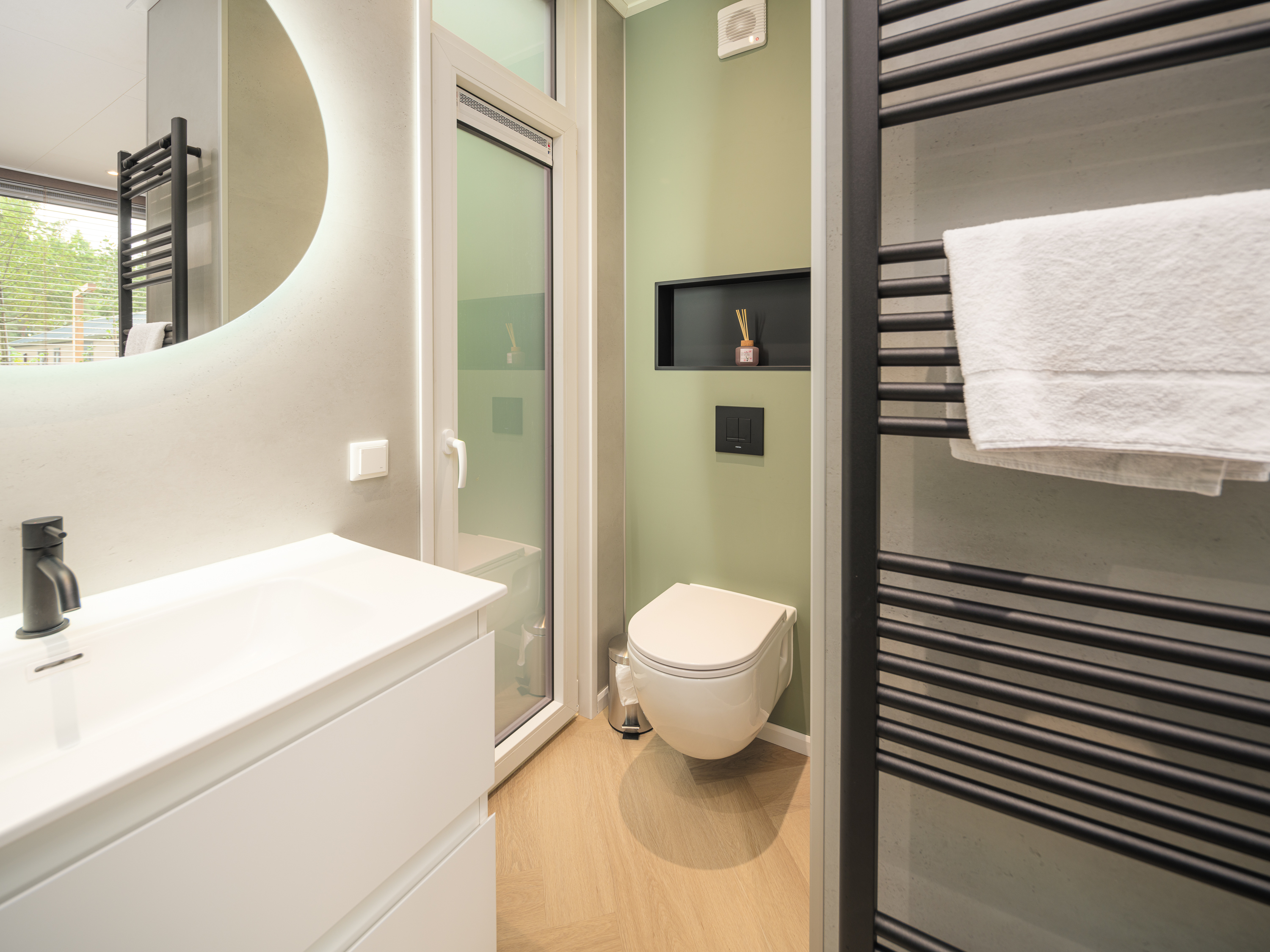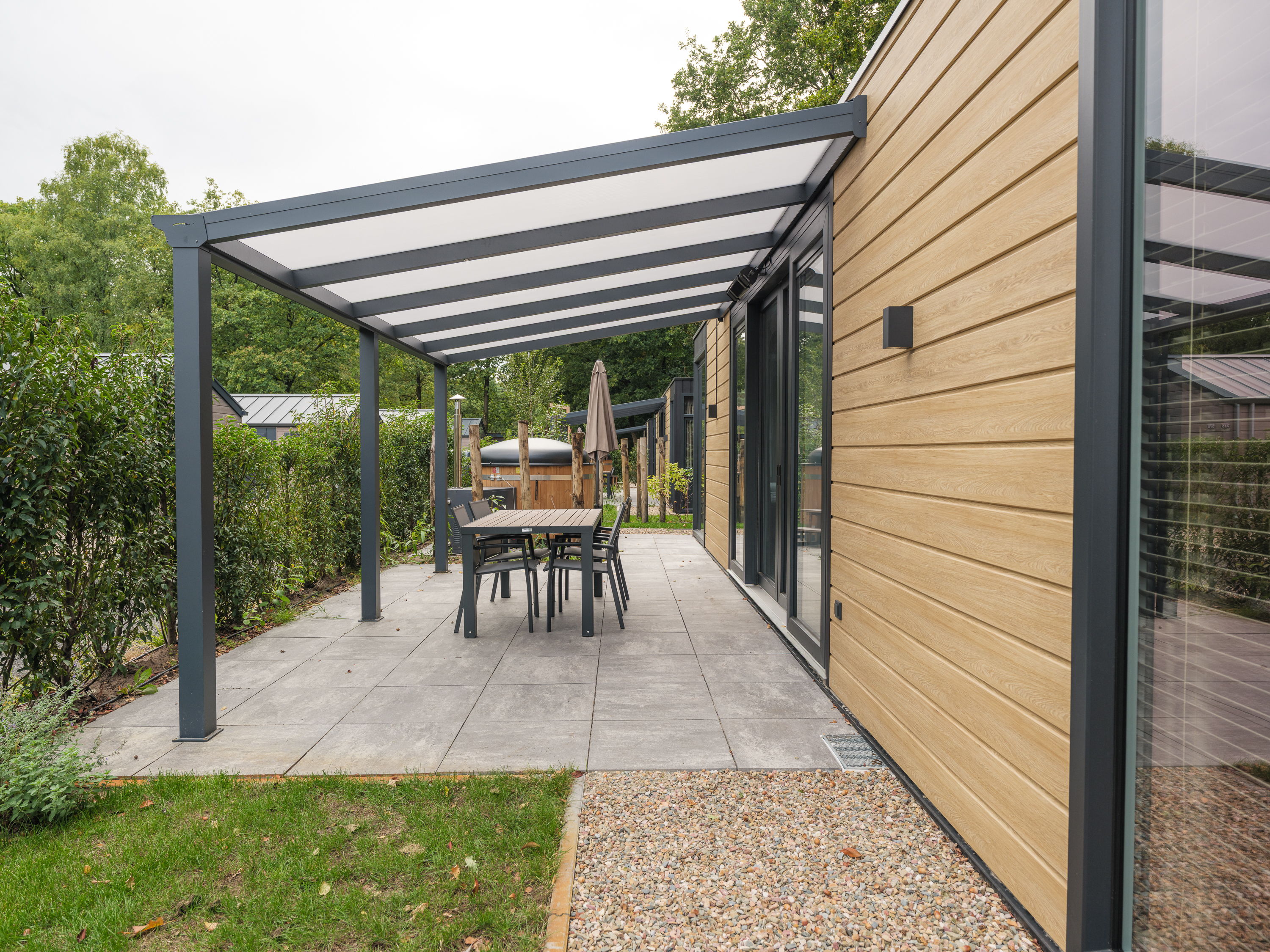 Naast de stijlvolle inrichting biedt de lodge ook extra comfort met airconditioning, die zowel kan verwarmen als koelen, voor een optimaal binnenklimaat in elk seizoen.