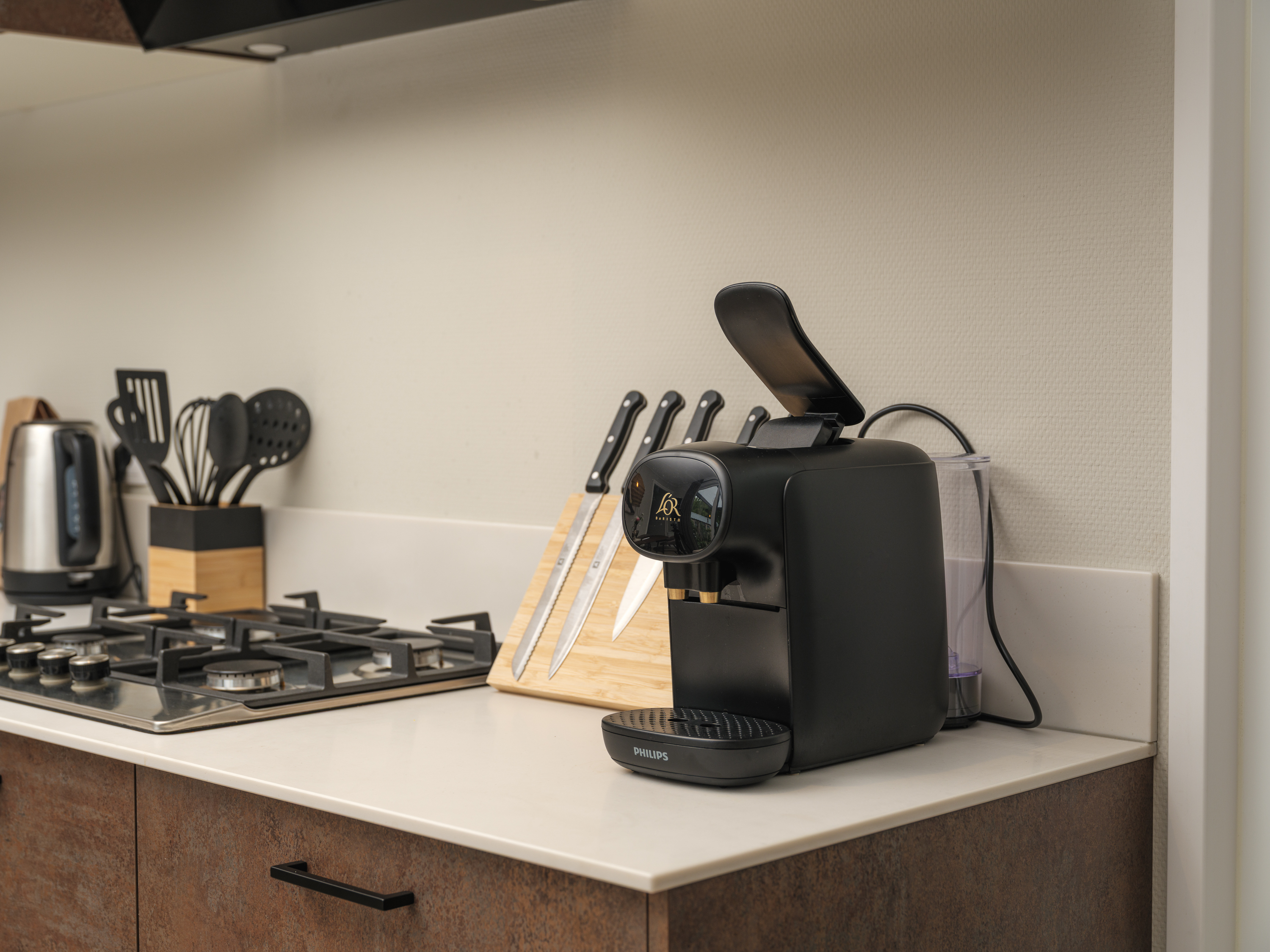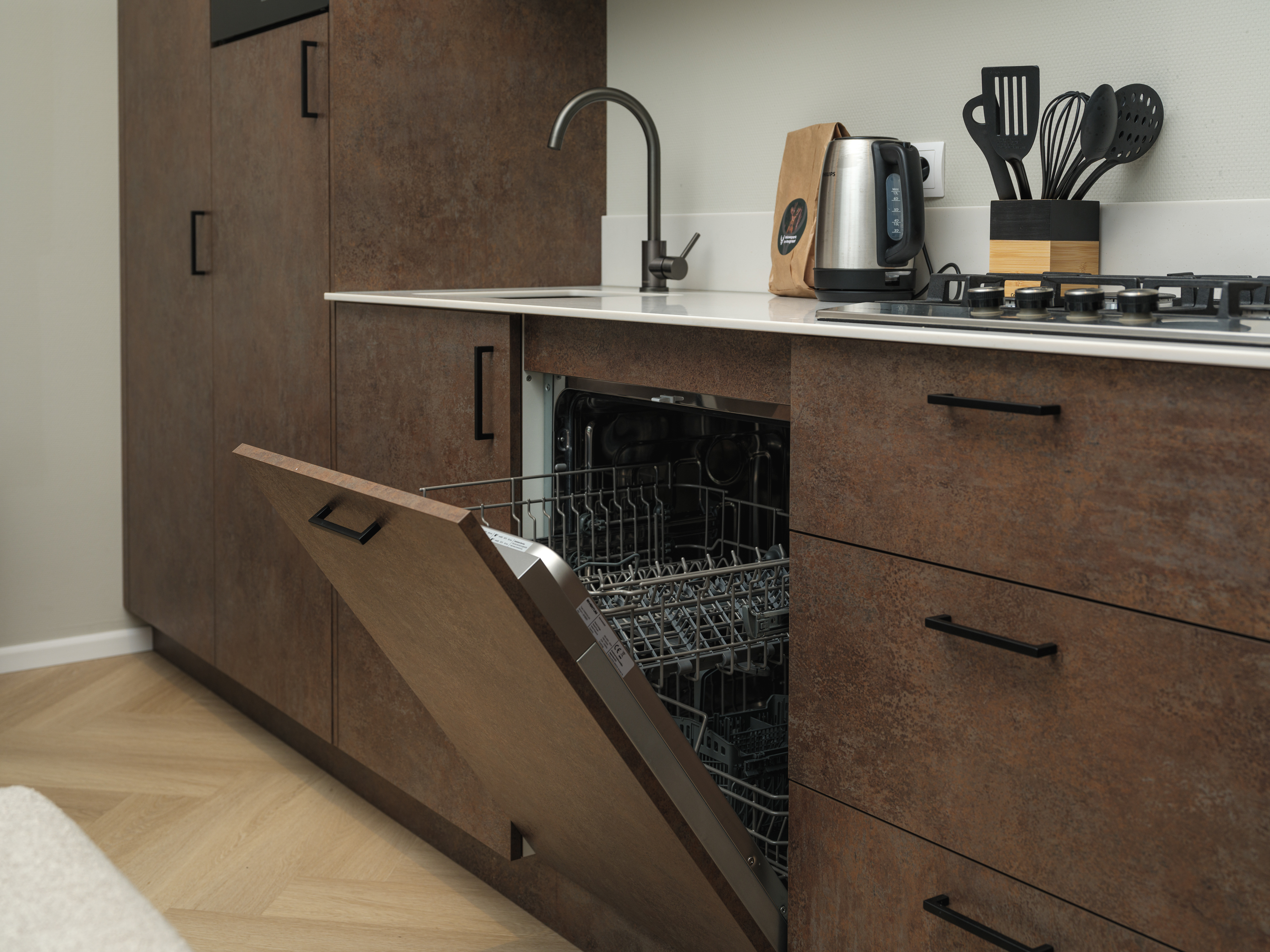 KoffiecupmachineEettafelVaatwasserAfzuigkapGasfornuisWaterkokerStandaard keukeninventarisKoelkastCombi-ovenBuitenleven