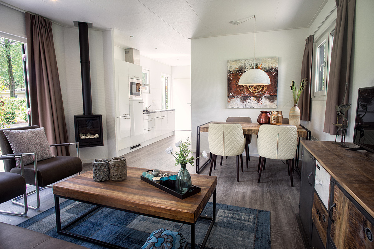 De ruime woonkamer is voorzien van een elektrische haard, een smart-tv met streamingfunctionaliteit en centrale verwarming. Twee slaapkamers met comfortabele boxspringbedden – één met twee bedden tegen elkaar en één met twee aparte bedden – zorgen voor een goede nachtrust. De luxe keuken is voorzien van hoogwaardige inbouwapparatuur, waaronder een inductiekookplaat, een koel-/vriescombinatie, een combimagnetron en een vaatwasser. De moderne badkamer heeft een inloopdouche en een toilet. Andere voorzieningen zoals een berging, horren en een milieuvriendelijk sedumdak maken het geheel compleet. Buiten kunnen gasten genieten van een volledig omheinde tuin, een ruim terras met zonnescherm en privéparkeergelegenheid. Huisdieren zijn welkom, maximaal twee per lodge.