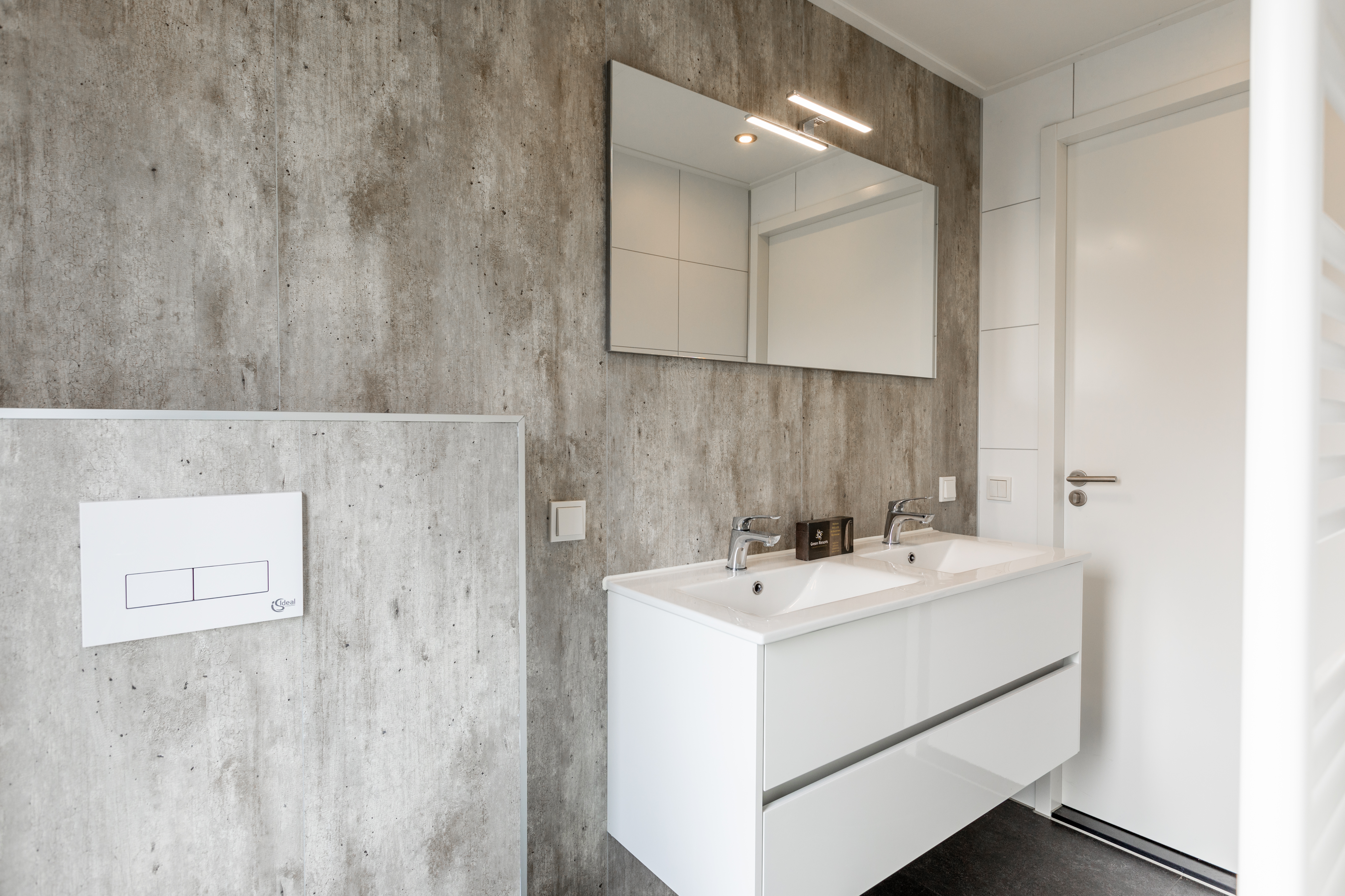 - Badkamer met dubbele wastafel, douche en toilet.