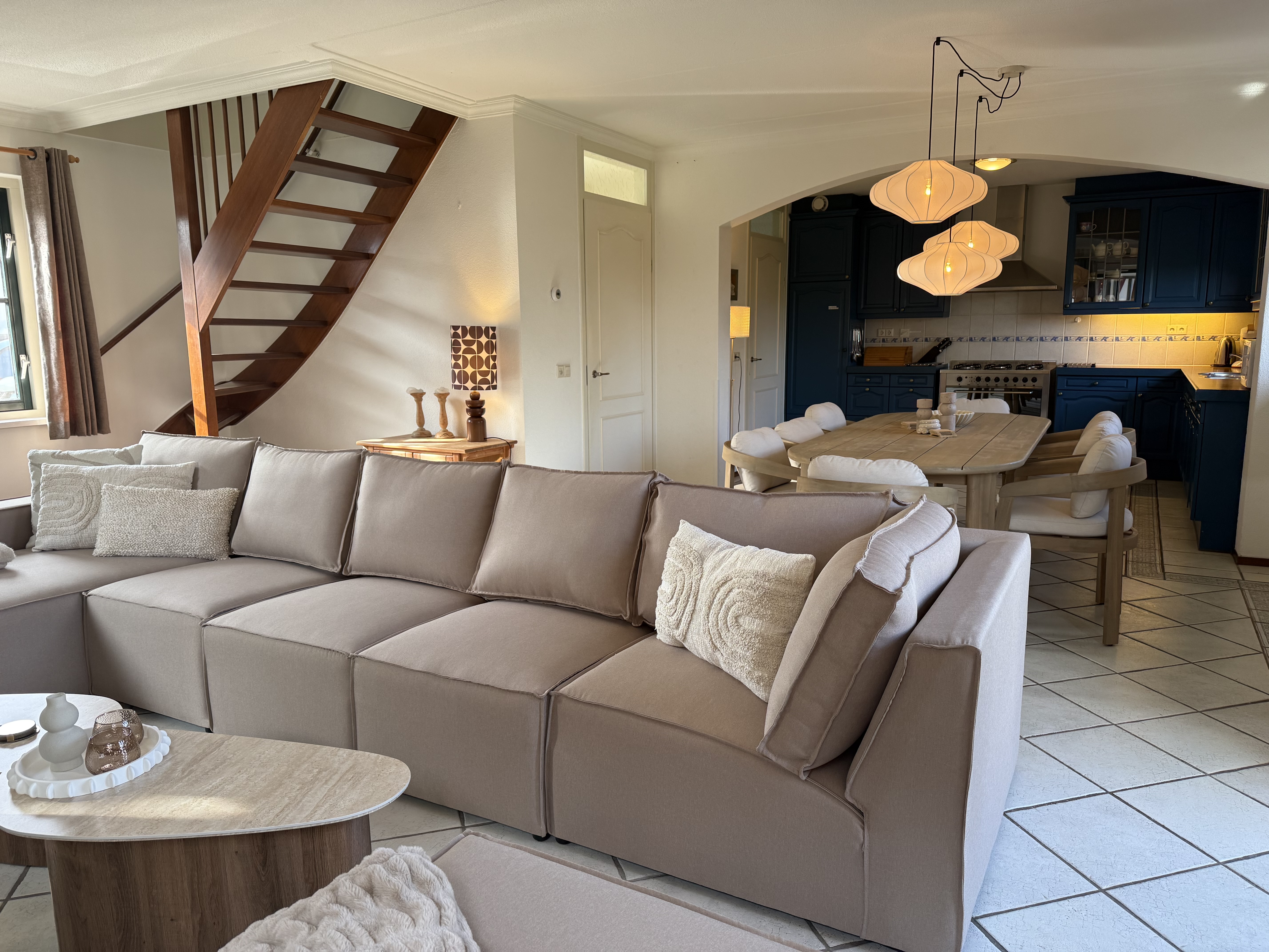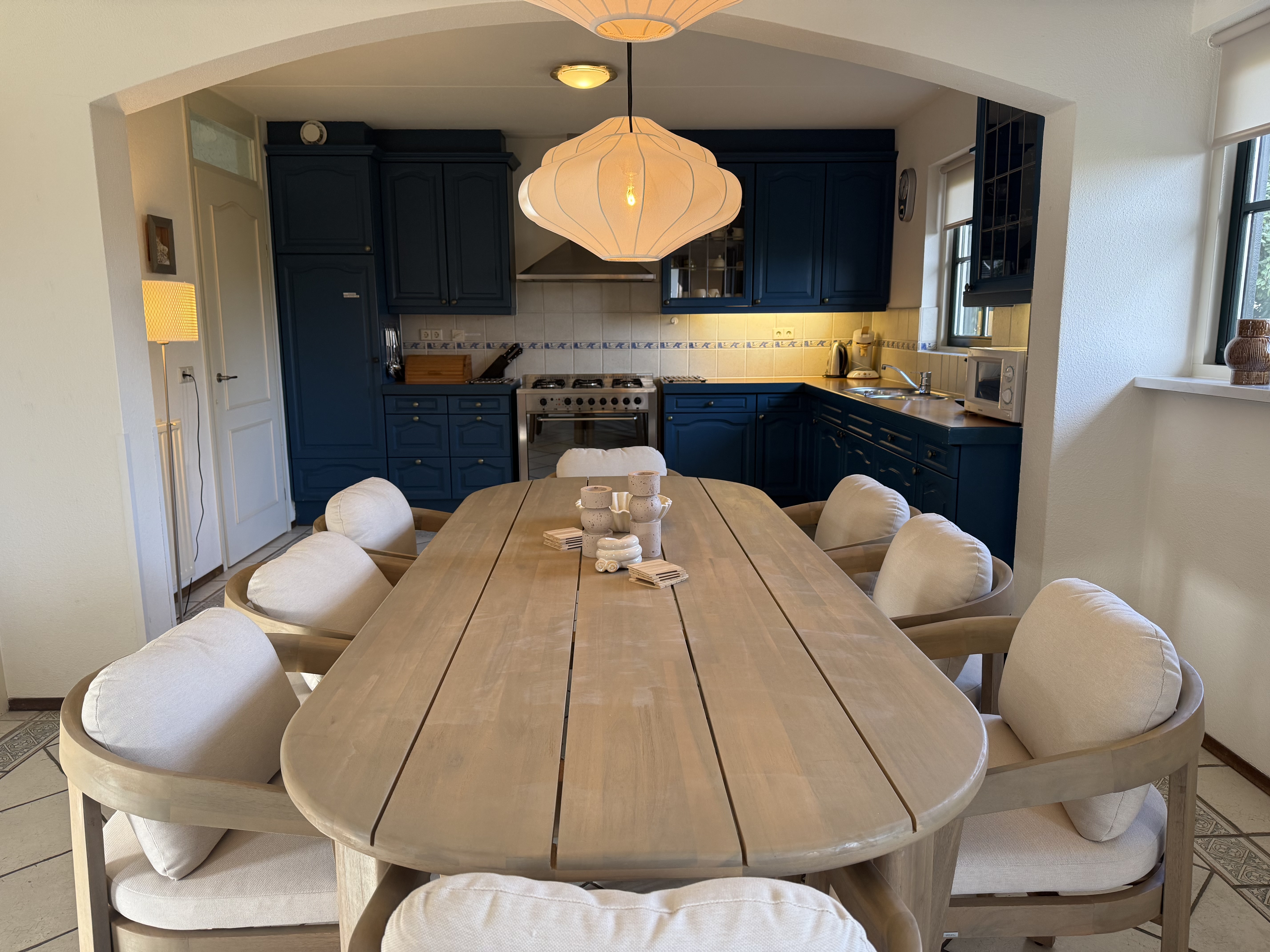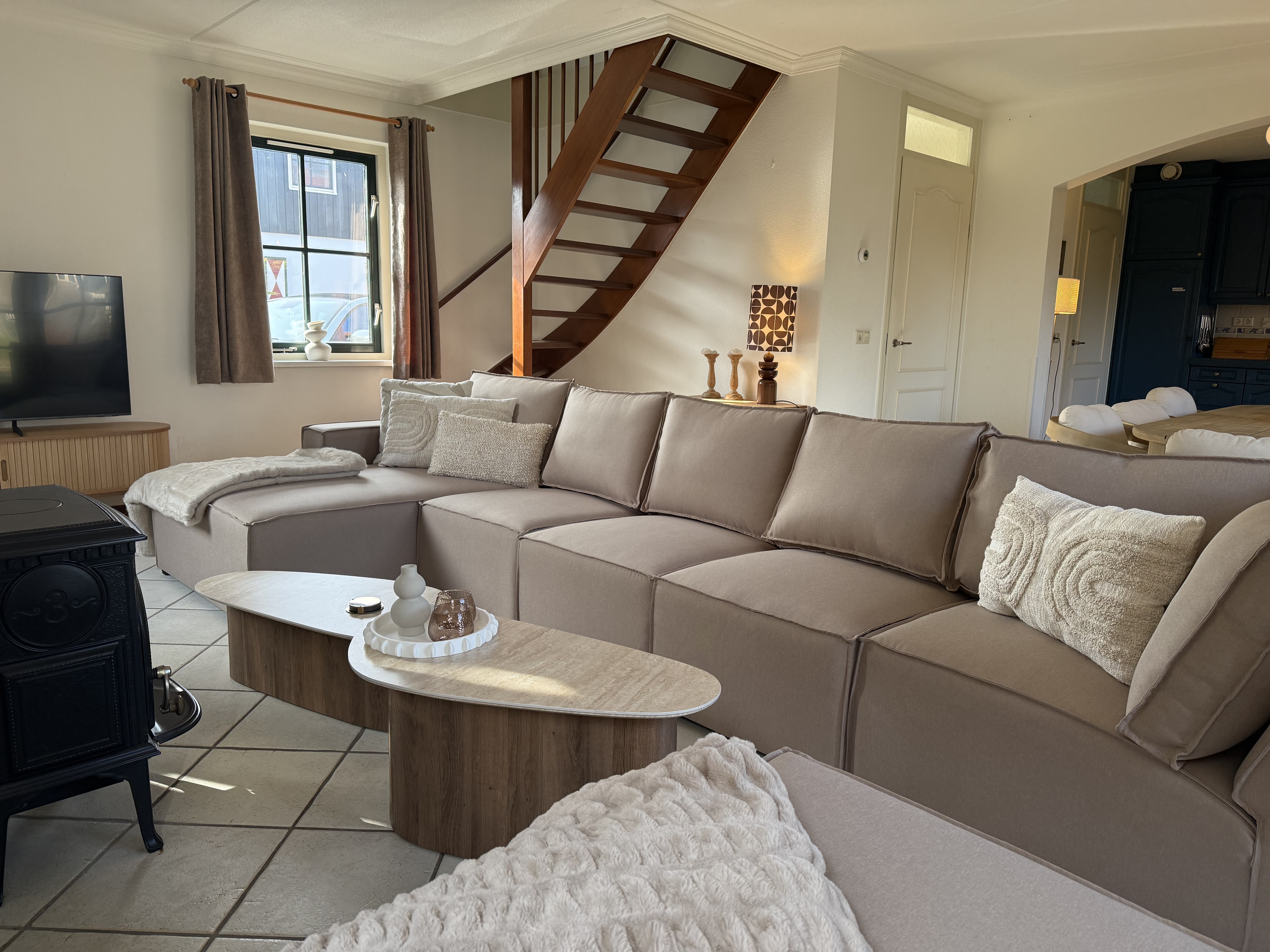Op de begane grond vindt u de ruime woon- en eetkamer met een comfortabele zithoek en een televisie, een open, volledig uitgeruste keuken, een bijkeuken en een apart gastentoilet in de hal. De keuken is voorzien van een vaatwasser, oven, magnetron, koelkast met vriesvak, waterkoker en koffiezetapparaat. Boven zijn er drie slaapkamers met in totaal acht eenpersoonsbedden, evenals de moderne badkamer met een ligbad, aparte douche, wastafel en toilet.