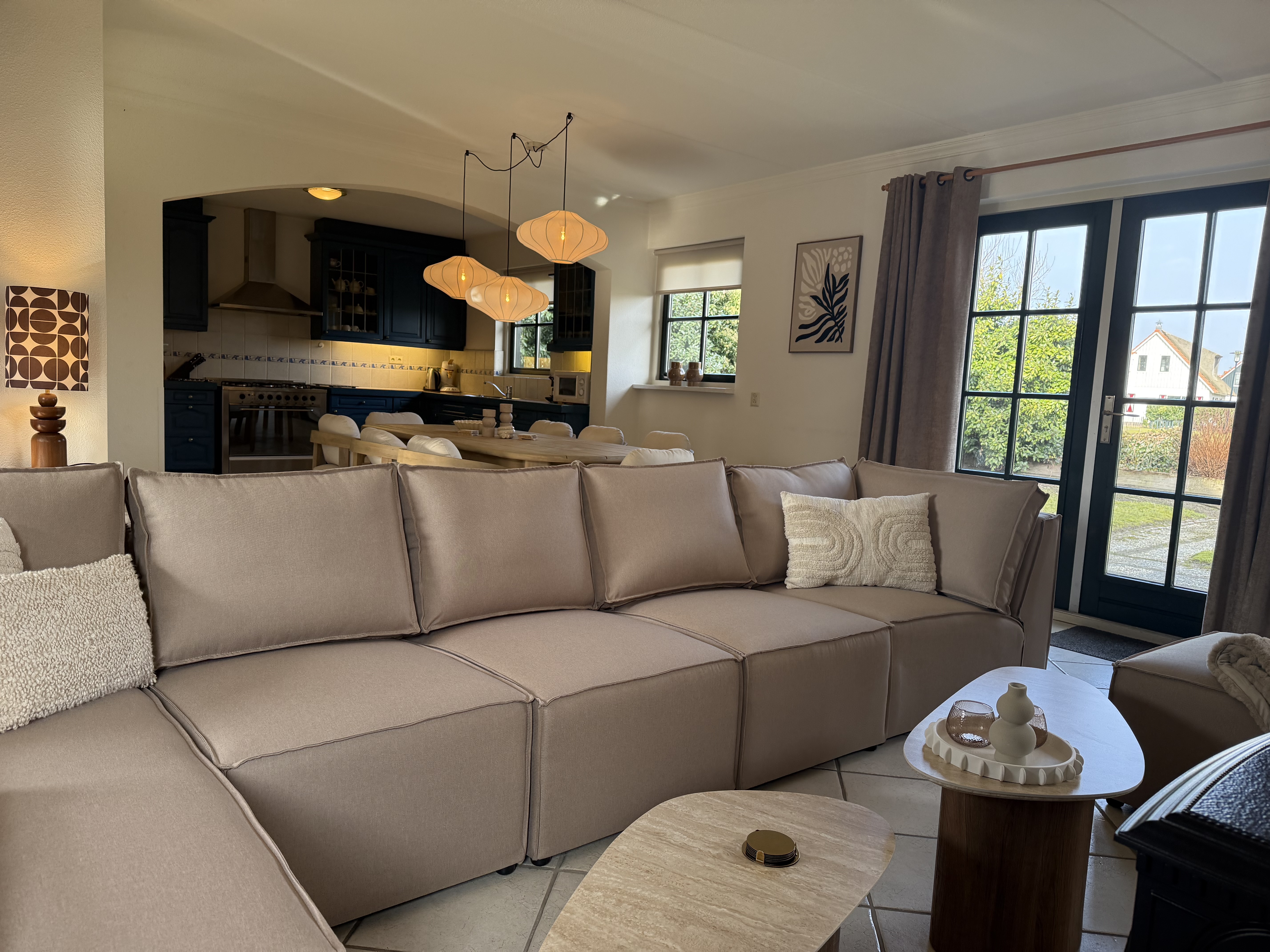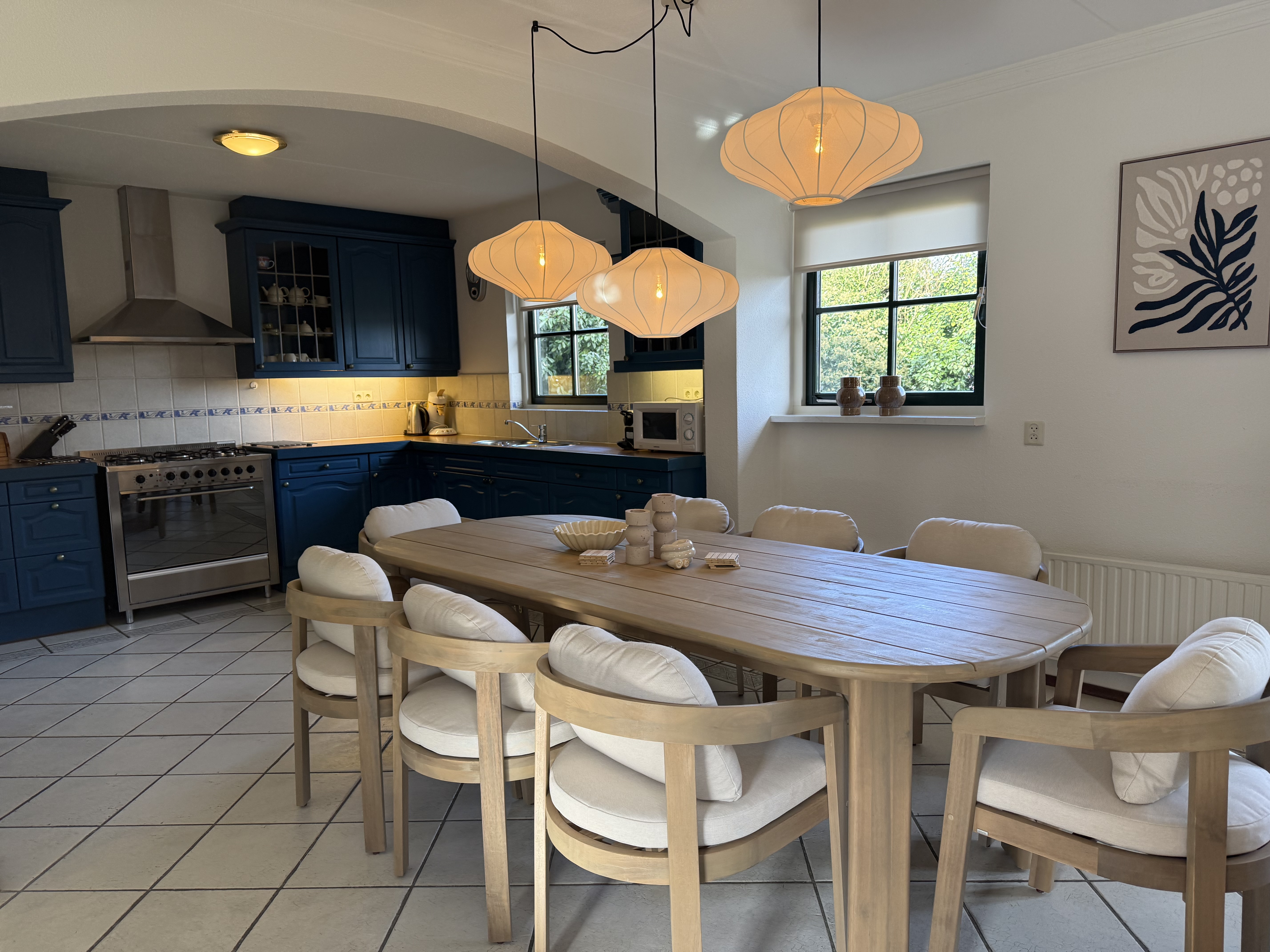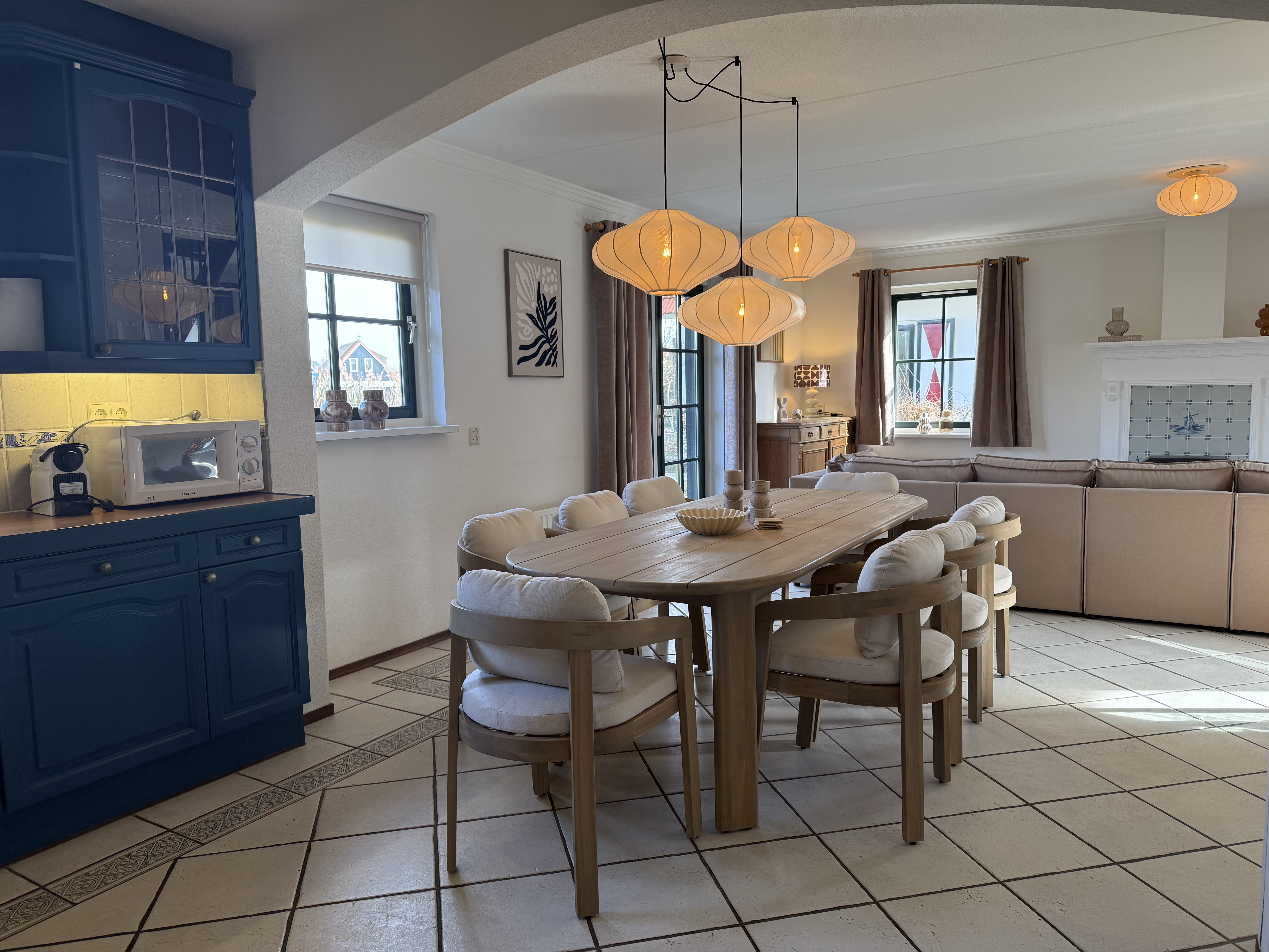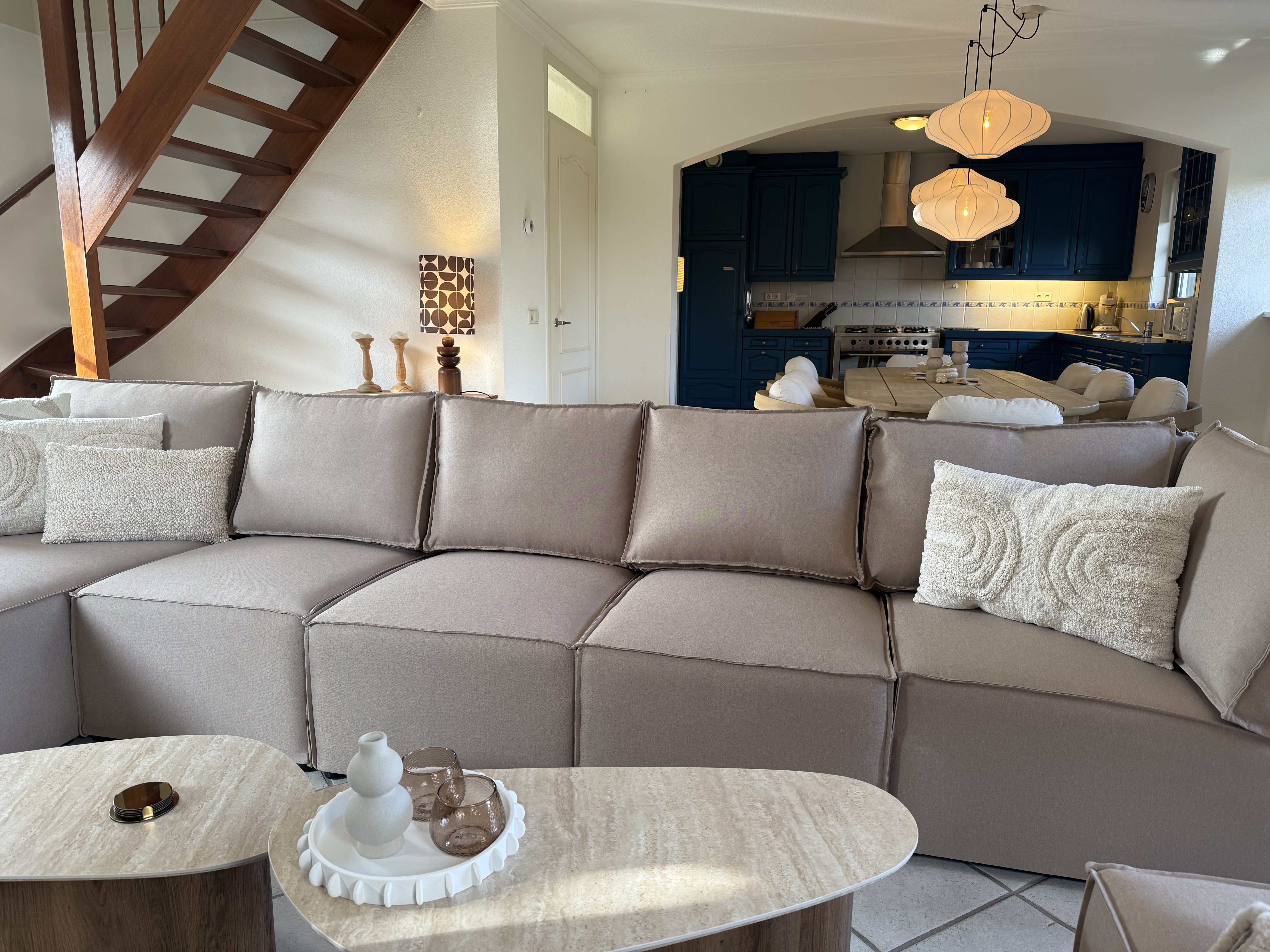 Op de begane grond vindt u de ruime woon- en eetkamer met een comfortabele zithoek en een televisie, een open, volledig uitgeruste keuken, een bijkeuken en een apart gastentoilet in de hal. De keuken is voorzien van een vaatwasser, oven, magnetron, koelkast met vriesvak, waterkoker en koffiezetapparaat. Boven zijn er drie slaapkamers met in totaal acht eenpersoonsbedden, evenals de moderne badkamer met een ligbad, aparte douche, wastafel en toilet.