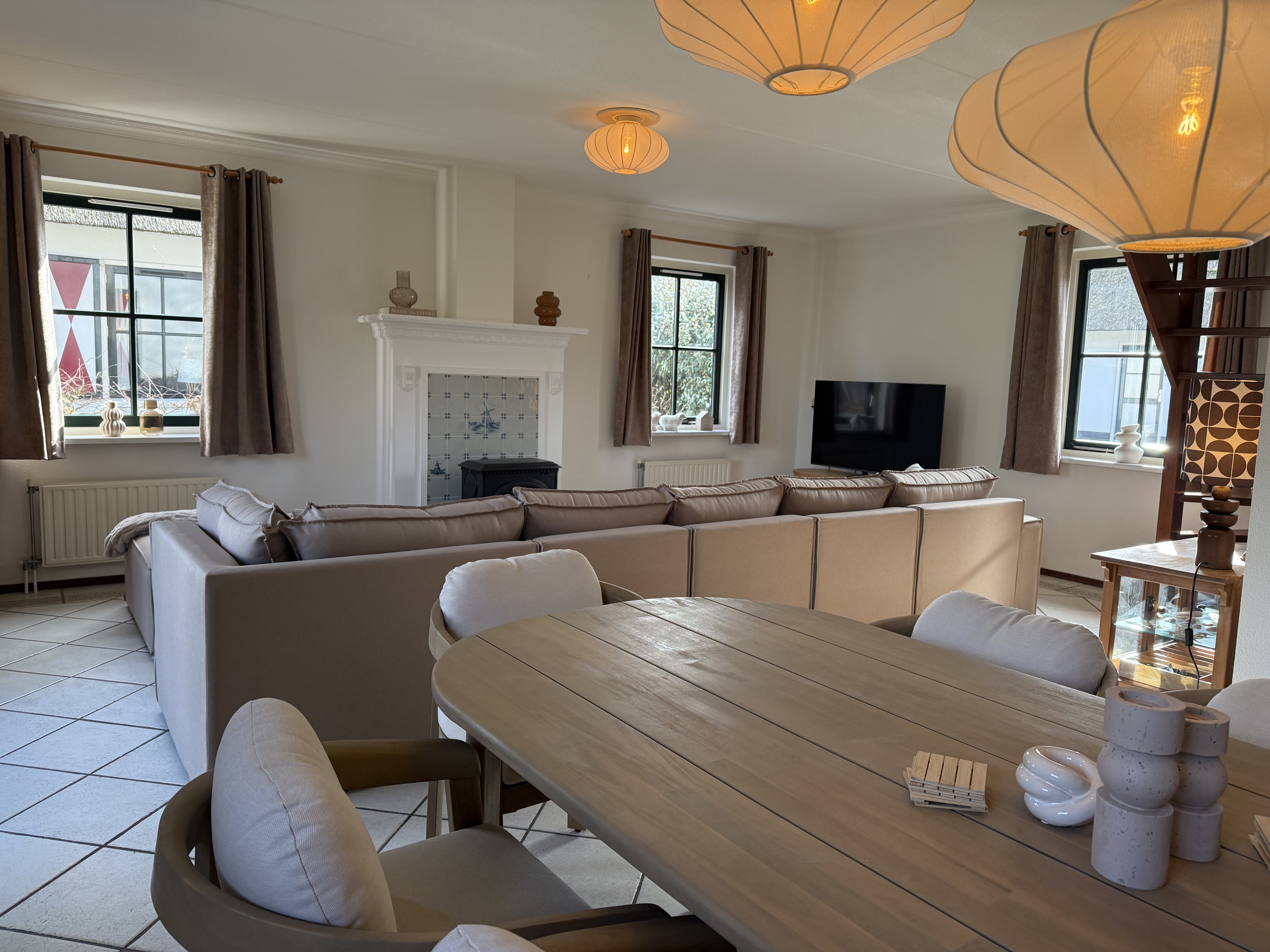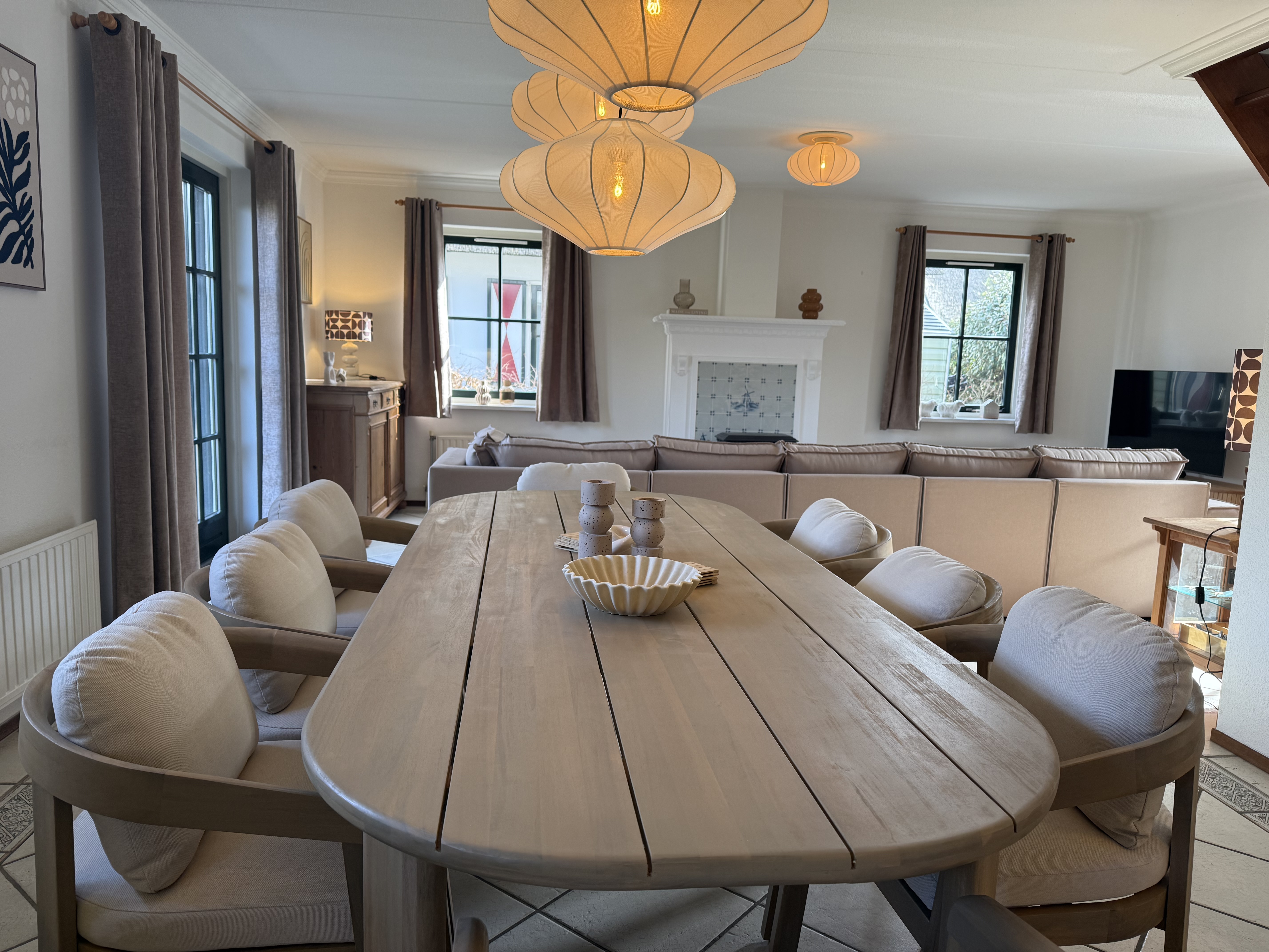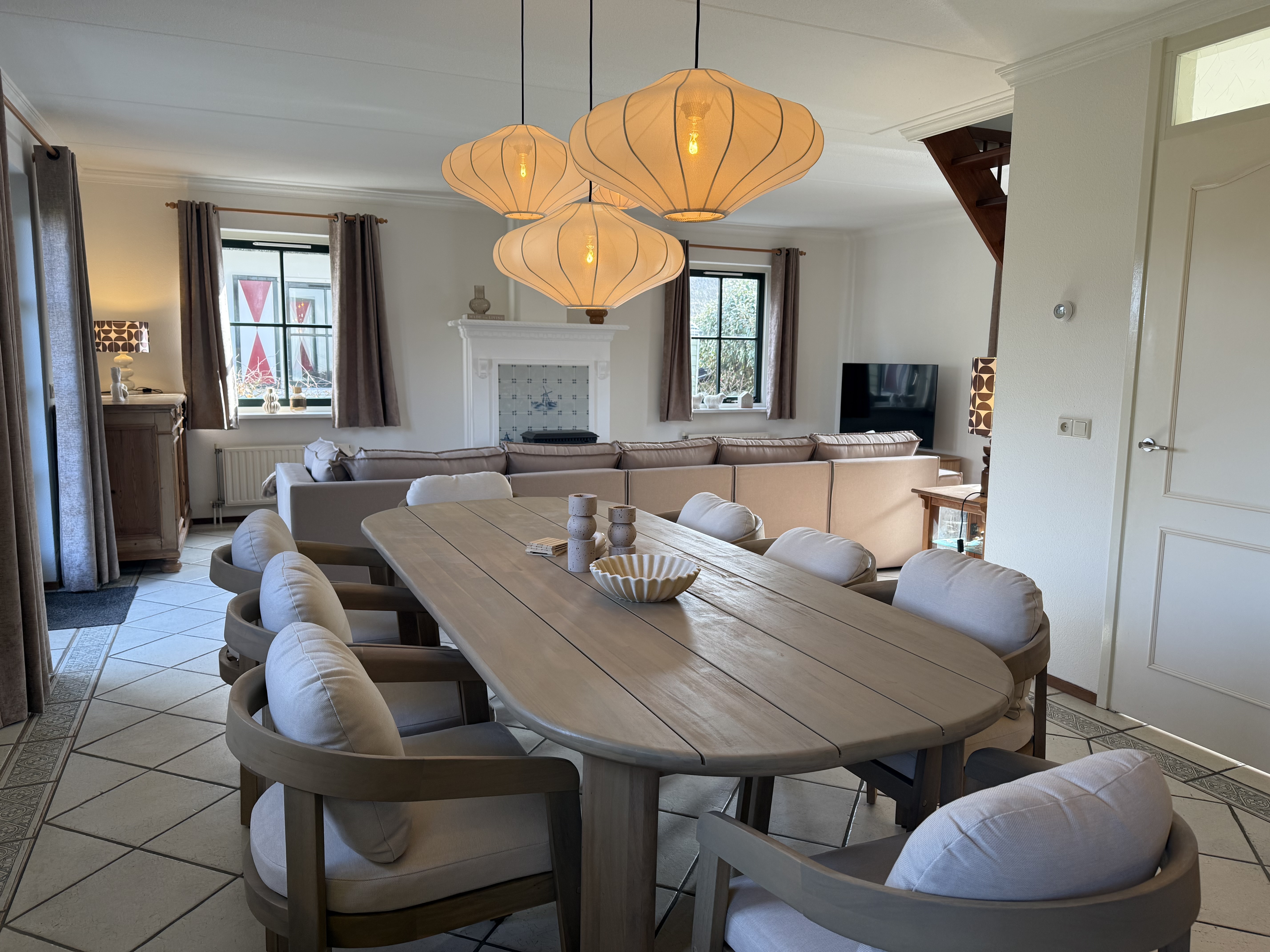 Voor extra gemak zijn er ook een wasmachine, droger en stofzuiger beschikbaar. Gezinsvriendelijke voorzieningen zoals een kinderstoel en een traphekje zijn ook aanwezig. Het huis wordt comfortabel verwarmd door centrale verwarming en vloerverwarming. Buiten vindt u een grote, goed onderhouden tuin met een terras en tuinmeubelen. Parkeren is direct bij het huis mogelijk.