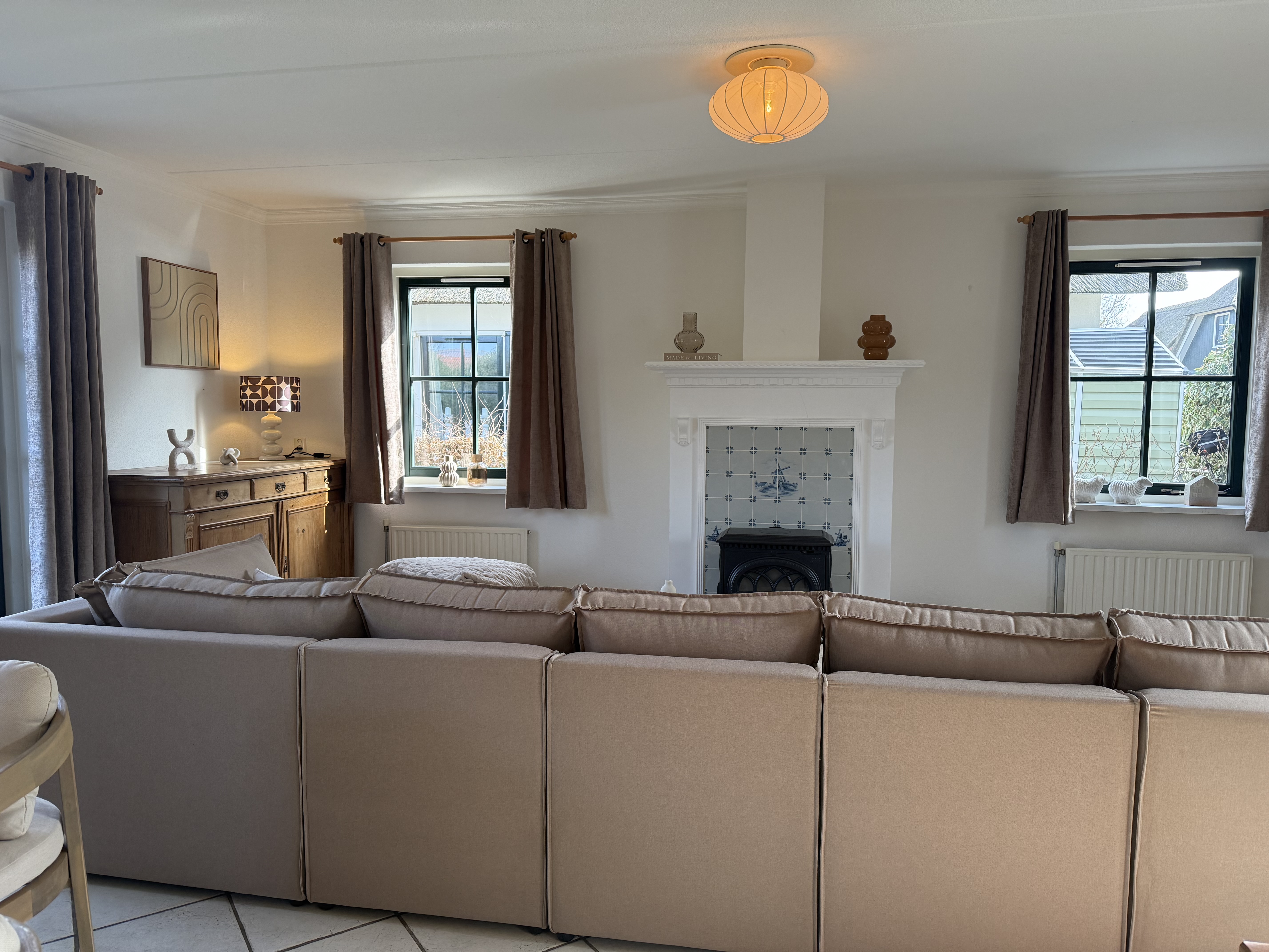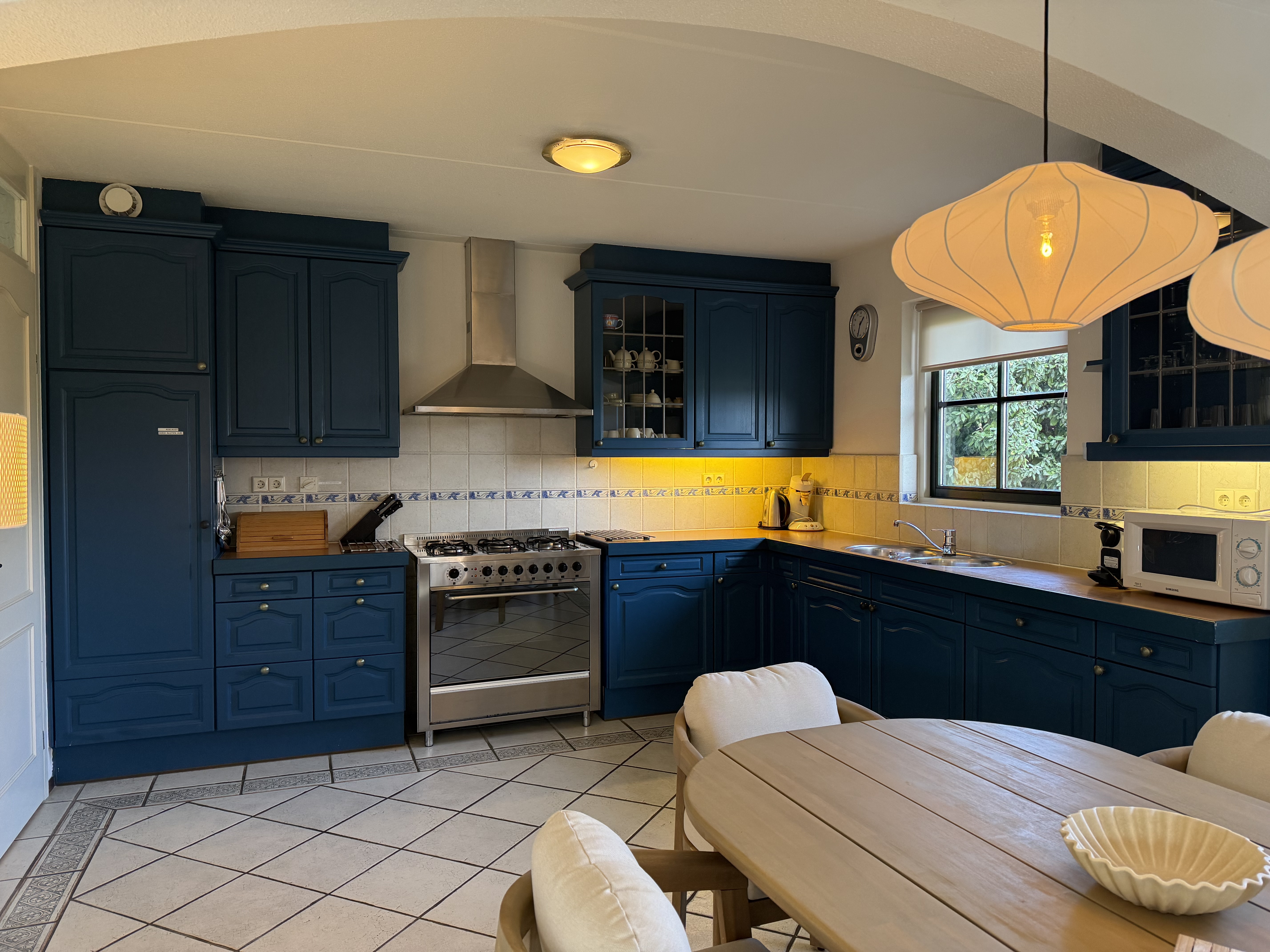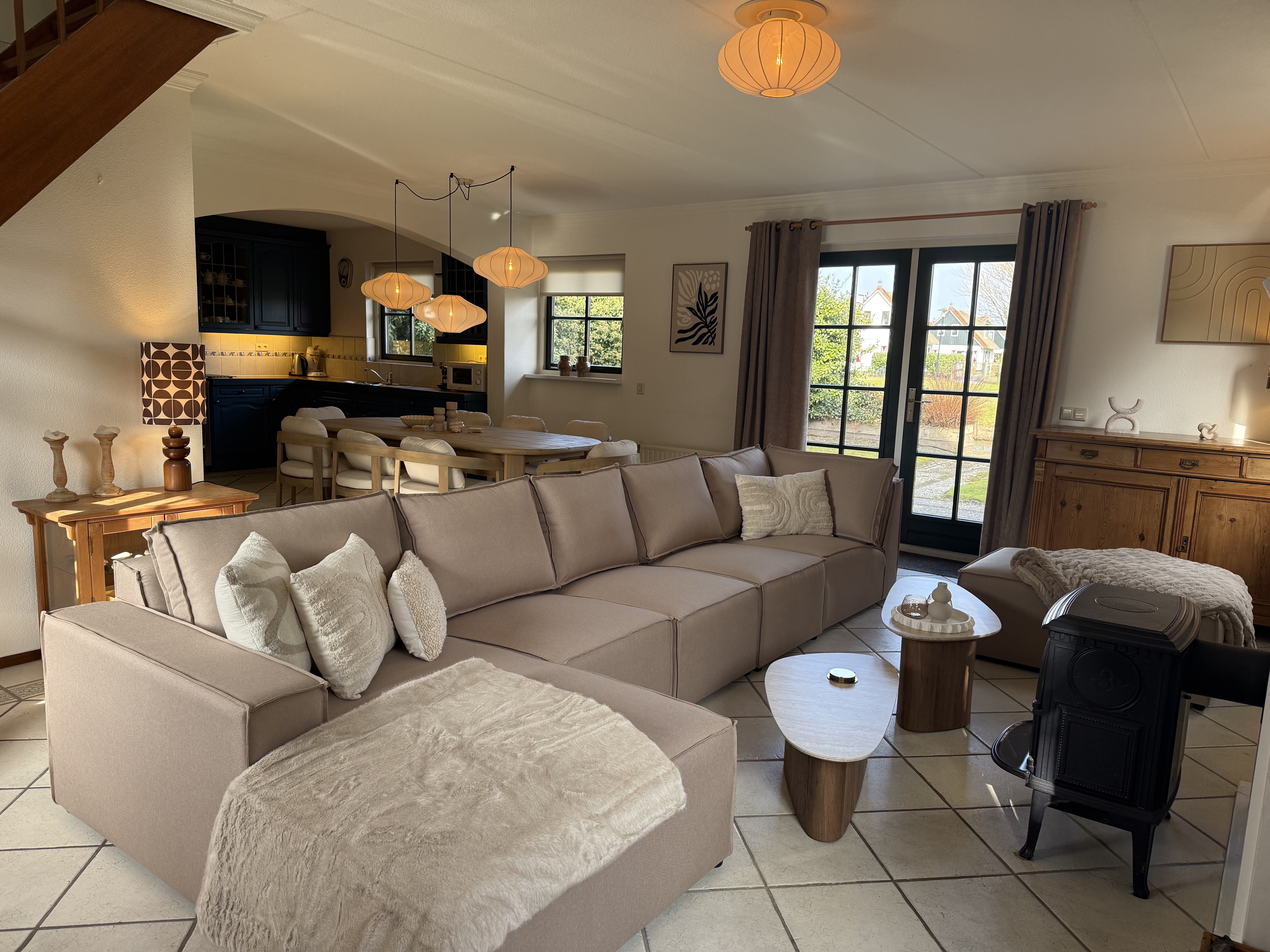 Voor extra gemak zijn er ook een wasmachine, droger en stofzuiger beschikbaar. Gezinsvriendelijke voorzieningen zoals een kinderstoel en een traphekje zijn ook aanwezig. Het huis wordt comfortabel verwarmd door centrale verwarming en vloerverwarming. Buiten vindt u een grote, goed onderhouden tuin met een terras en tuinmeubelen. Parkeren is direct bij het huis mogelijk.