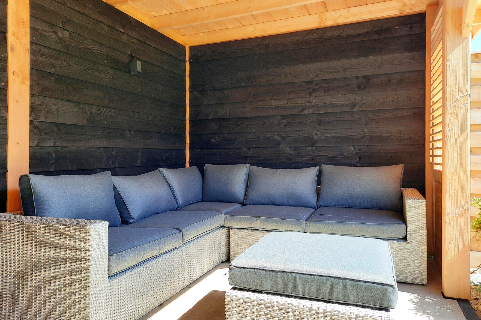 Schöner Garten mit überdachter Sitzecke. Der Garten hat einen hohen Zaun, also perfekt mit Hund.