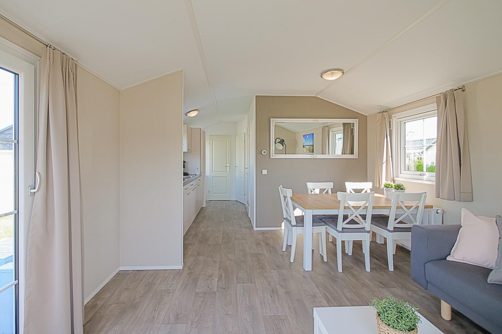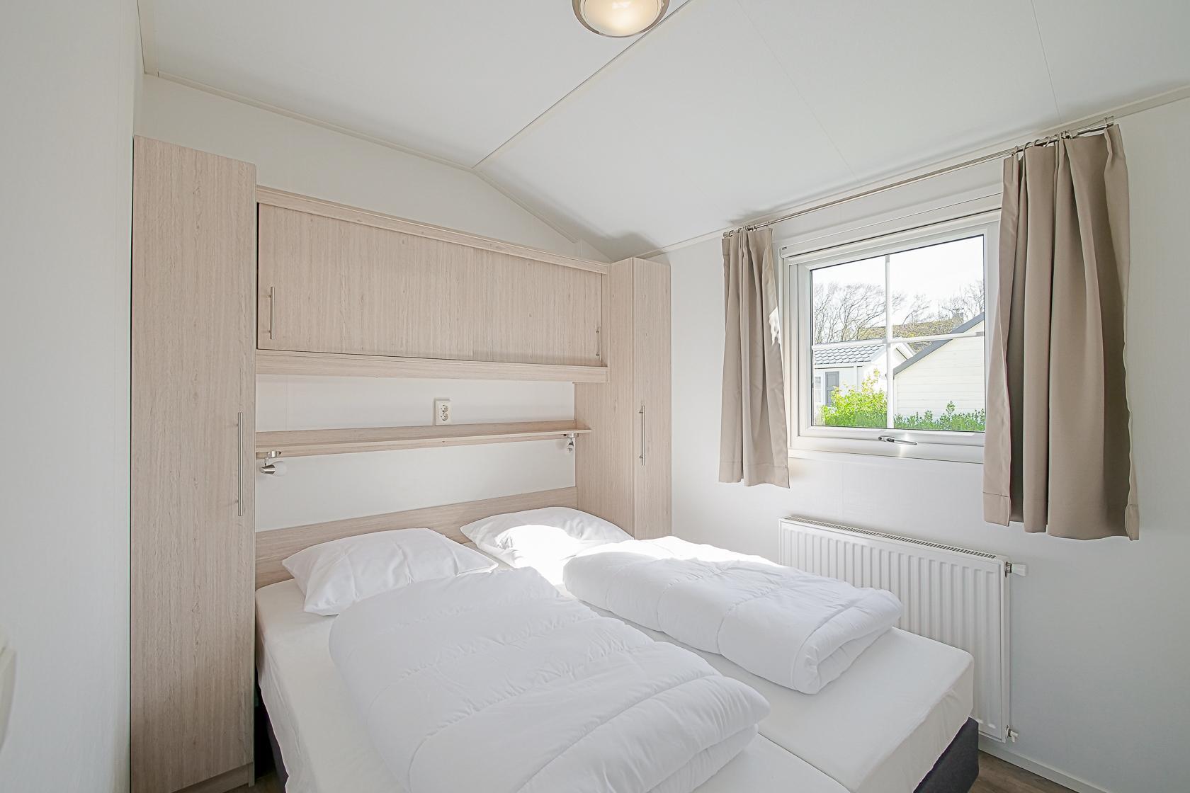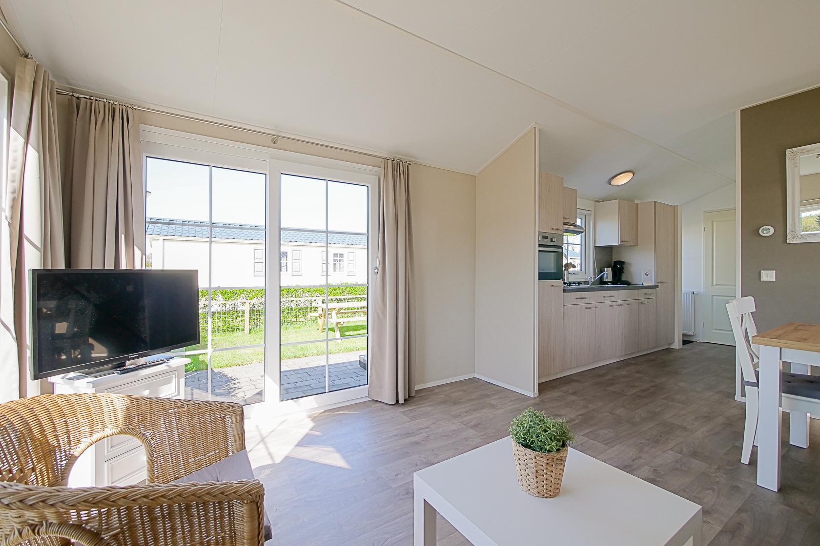 Dit chalet met omheinde tuin ligt aan de rand van Callantsoog, omgeven door heide, weilanden en duinen. Het brede zandstrand van Callantsoog ligt op slechts 1400 meter afstand. Het moderne, gelijkvloerse chalet is comfortabel ingericht en biedt plaats aan maximaal vijf personen. Een gezellige woonkamer met een zithoek, flatscreen-tv, gratis wifi en centrale verwarming zorgen voor een aangename sfeer. De open keuken is van alle gemakken voorzien, zoals een vaatwasser, combimagnetron, koelkast met vriesvak, vierpits gasfornuis, broodrooster, waterkoker en koffiezetapparaat. Een wasmachine, droogrek, stofzuiger en rookmelder zijn eveneens aanwezig. Het chalet heeft twee slaapkamers: één met een comfortabel tweepersoonsbed en één met een eenpersoonsbed en een stapelbed, geschikt voor gezinnen met kinderen. De badkamer is voorzien van een douche, wastafel en toilet. De omheinde tuin biedt volop ruimte om te ontspannen en te spelen en is voorzien van een terras, tuinmeubilair, een parasol en een tuinhuisje. Het chalet beschikt over een eigen parkeerplaats en er is een laadpunt voor elektrische auto`s op het terrein. Dankzij de centrale en toch natuurlijke ligging bent u niet alleen zo bij het strand, maar ook bij de duinen en de vele wandel- en fietspaden. Uitstapjes naar Alkmaar met zijn beroemde kaasmarkt, naar Den Helder, Texel of naar omliggende dorpen bieden extra afwisseling. Het uitgestrekte landschap, natuurgebied het Zwanenwater en de nabijheid van het centrum maken het park ideaal voor gasten met honden.