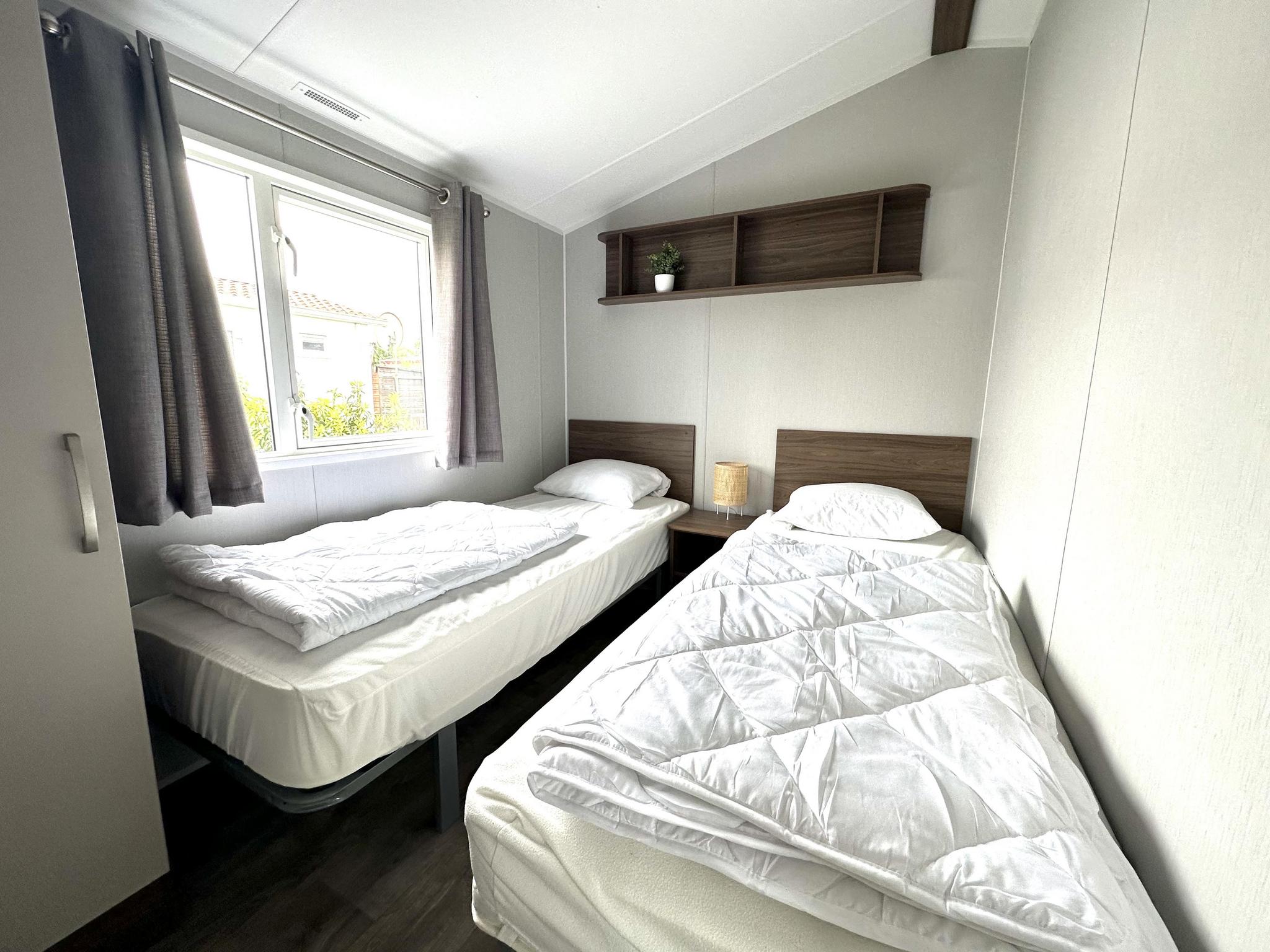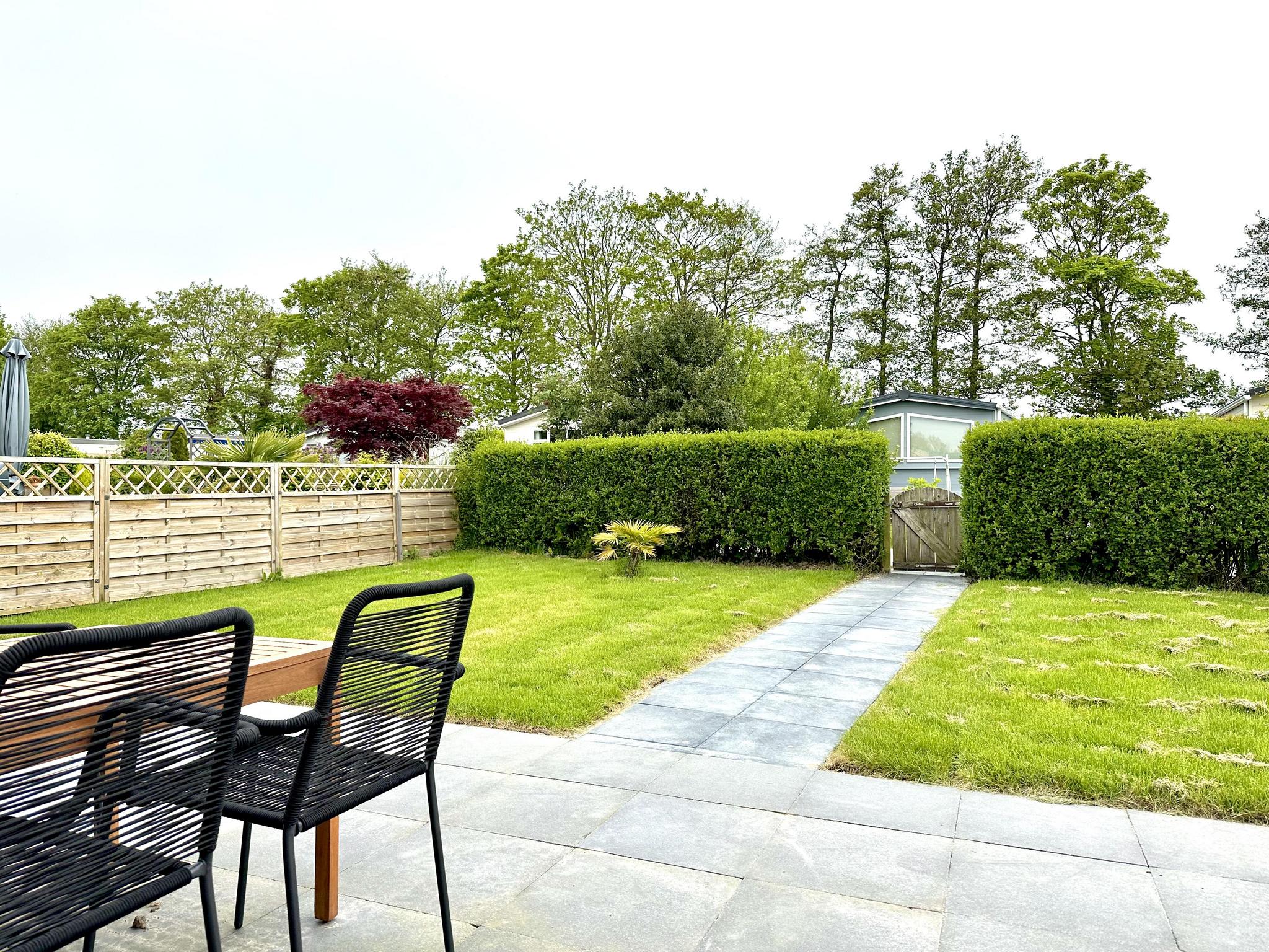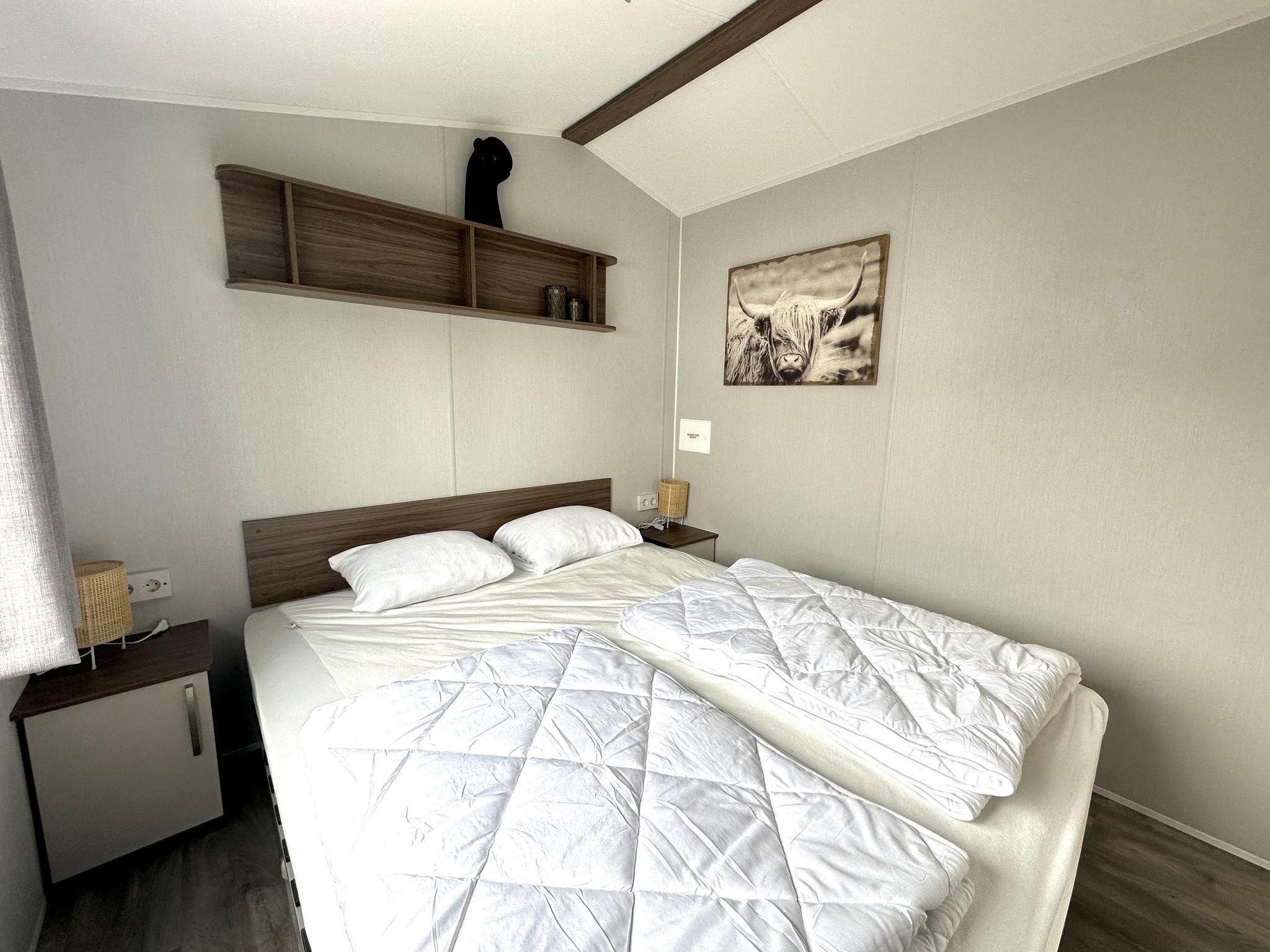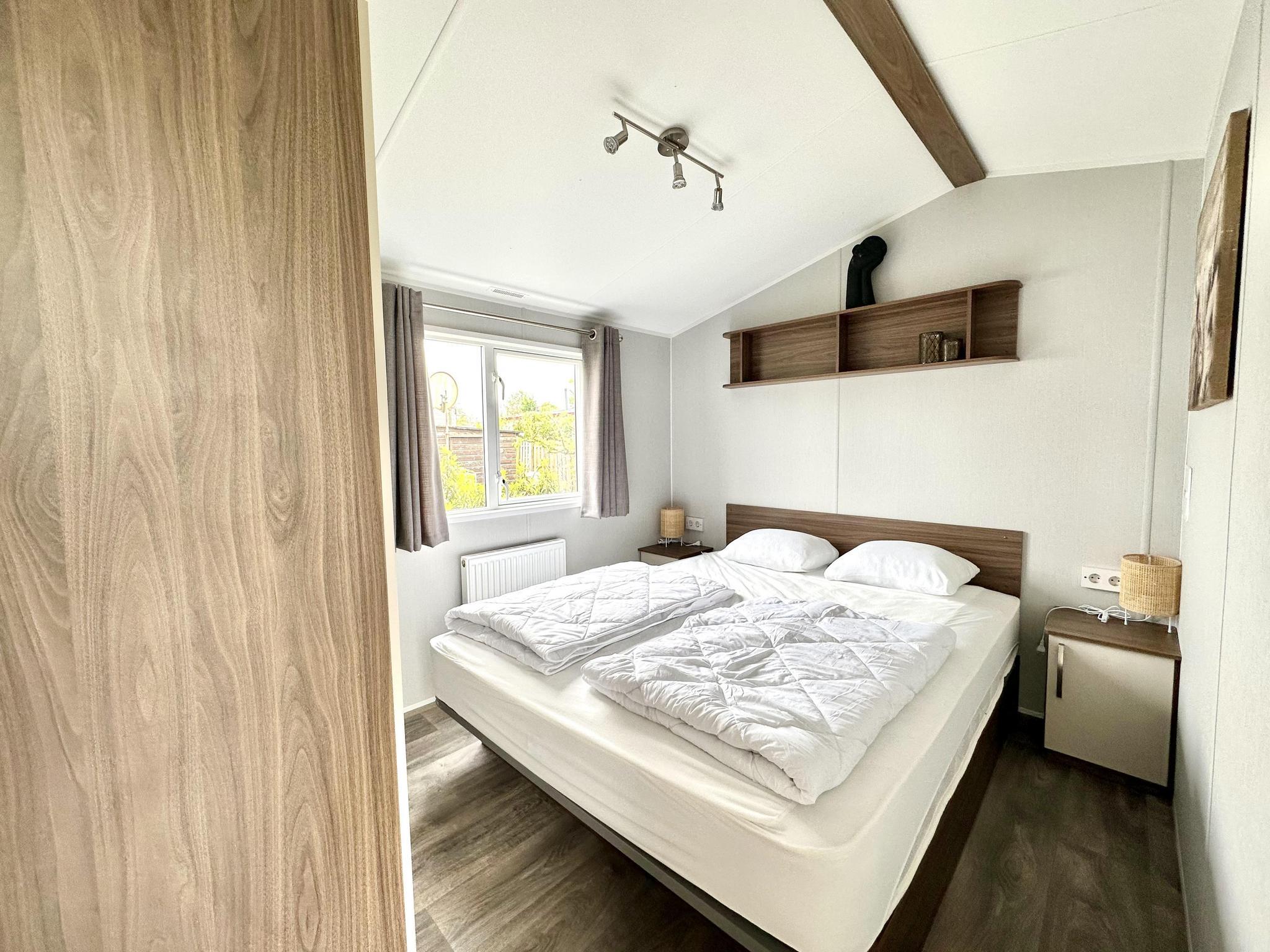 Het chalet heeft twee slaapkamers: de hoofdslaapkamer heeft een comfortabel tweepersoonsbed (160 x 200 cm) en de tweede slaapkamer heeft twee eenpersoonsbedden (elk 80 x 200 cm). De badkamer is modern en voorzien van een douche, wastafel en toilet. Buiten nodigt een overdekt terras met parasol, tuinmeubilair en zitgelegenheid u uit om te ontspannen. De tuin is gedeeltelijk omheind en biedt ruimte om buiten te ontspannen. Er is privéparkeergelegenheid direct bij het chalet. Het vakantiepark biedt diverse faciliteiten, waaronder een verwarmd buitenzwembad (begin mei tot half september), een groot sport- en recreatiegebied met voetbal-, volleybal- en badmintonvelden, een jeu de boulesbaan, een ruime speeltuin met een tokkelbaan en trampoline, en aangrenzende vismogelijkheden. Van april tot oktober zijn er ook fietsverhuur, een broodjesservice, een bar en een restaurant beschikbaar. Er zijn laadpunten voor elektrische auto`s aanwezig. Let op: de accommodaties kunnen alleen voor recreatieve doeleinden worden gehuurd.