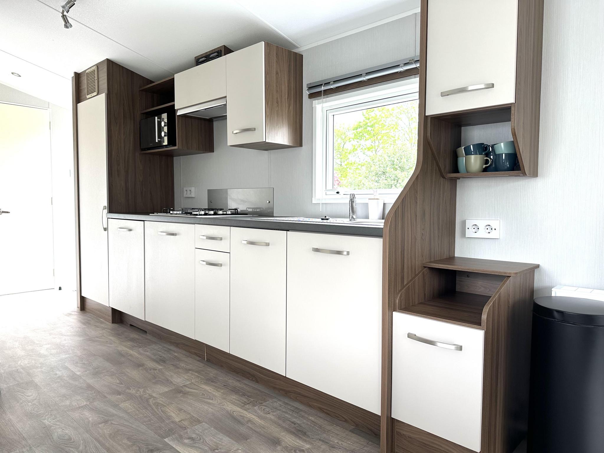 De open keuken is van alle gemakken voorzien en biedt alle moderne gemakken om comfortabel te koken. Denk hierbij aan een combimagnetron, een vaatwasser, een koelkast met vriesvak, een vierpits gaskookplaat, een afzuigkap, een waterkoker en alle benodigde kookgerei, servies en glaswerk.