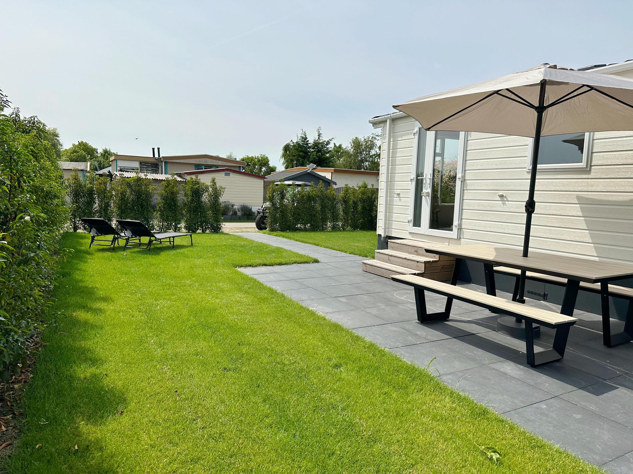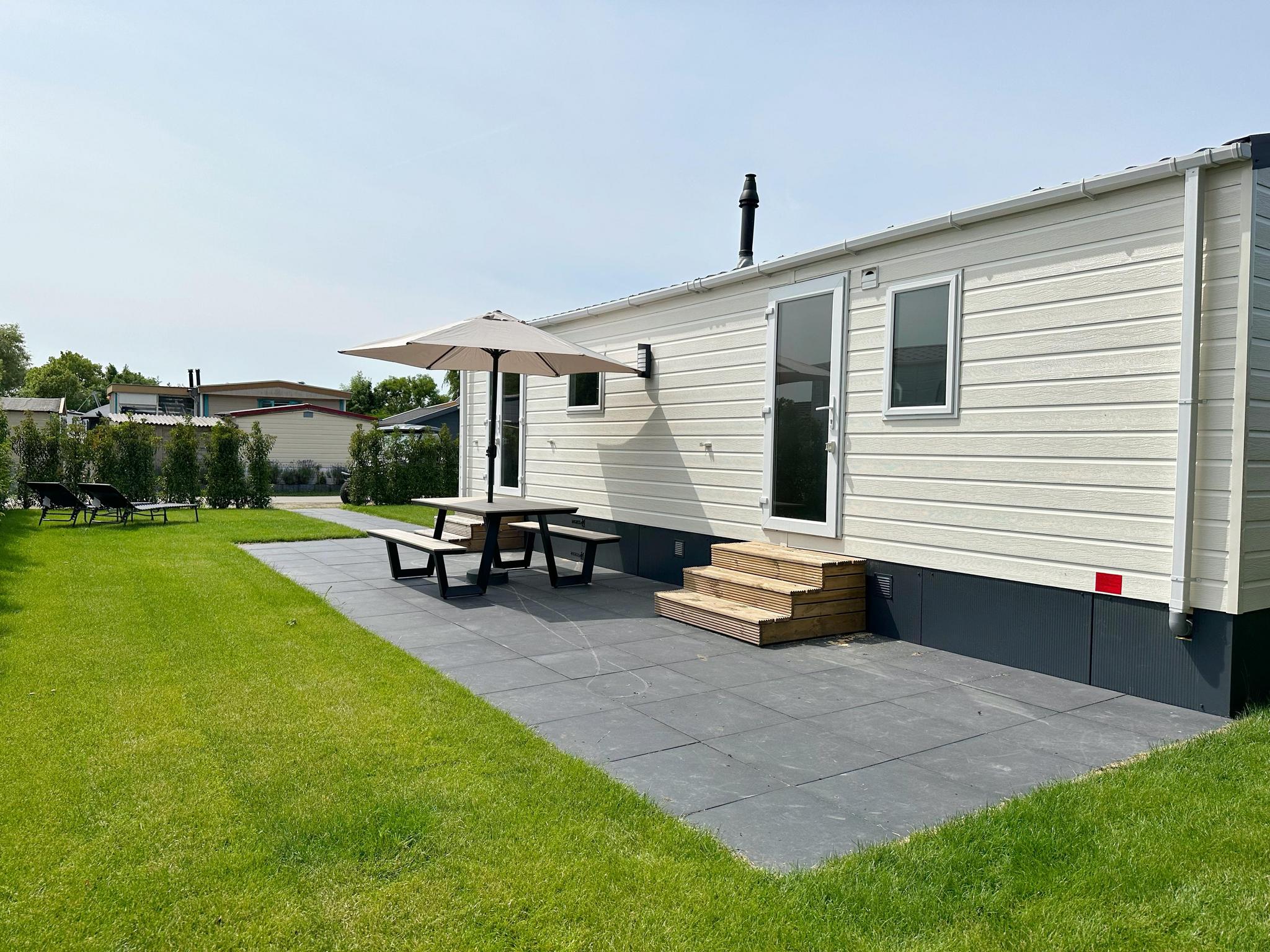 Buiten kun je genieten van de frisse lucht en de rustige omgeving. Het chalet beschikt over een picknicktafel met parasol en zonneluifel, ideaal voor al fresco maaltijden of gewoon om te relaxen uit de zon. Voor de zonliefhebbers zijn er ook twee ligstoelen beschikbaar, zodat je optimaal kunt genieten van de zonnestralen.