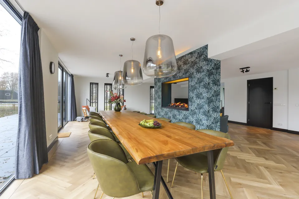 De ruime woonkamer heeft meerdere zithoeken, tv en een sfeerhaard. In de serre staat een eettafel van vier meter voor diners met twaalf personen. De open keuken met kookeiland en bar is uitgerust met twee ovens, combimagnetron, bier wijnklimaatkast, twee vaatwassers en een inductiekookplaat met tien zones.