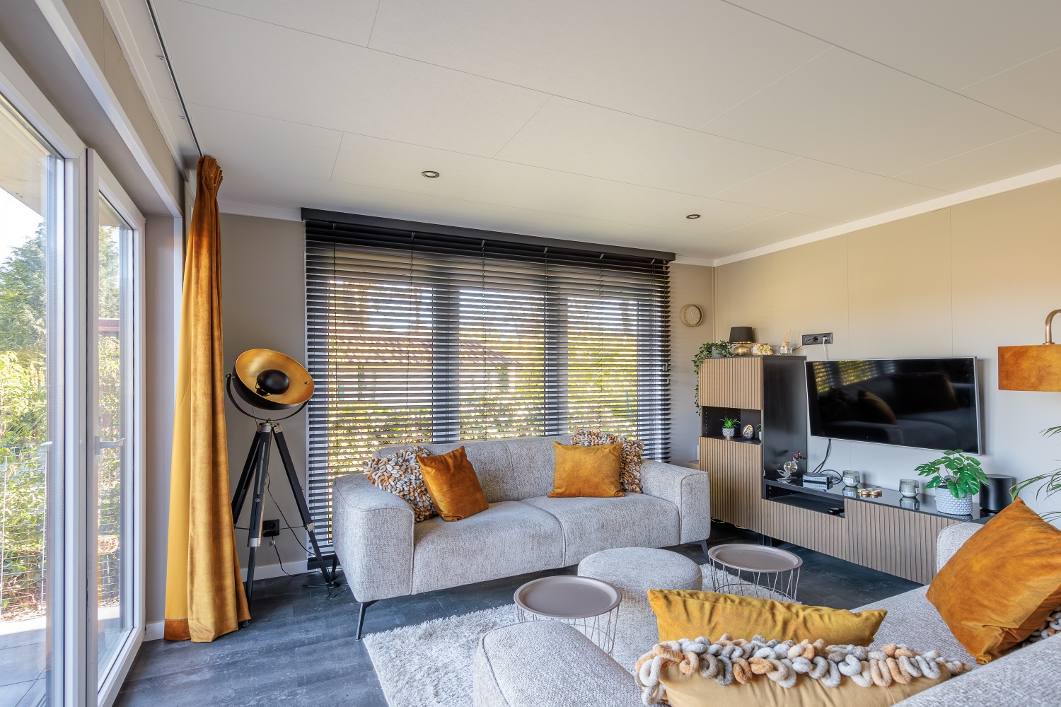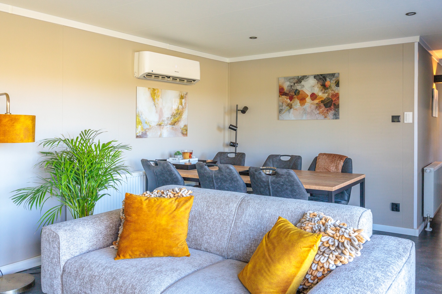 De leefruimte bestaat uit een apart zit- en eetgedeelte. Door de grote raampartijen, waaronder een openslaande pui, valt er veel natuurlijk (zon)licht naar binnen én heeft men mooi uitzicht naar buiten toe compleet met een Sonos One Era