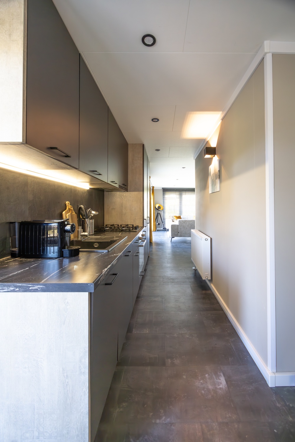 Direct aan de leefruimte grenst de rechte halfopen keuken. Deze heeft een moderne uitstraling en is luxe uitgevoerd, compleet met een koelkast, combimagnetron, vaatwasser, gasstel en afzuigkap.