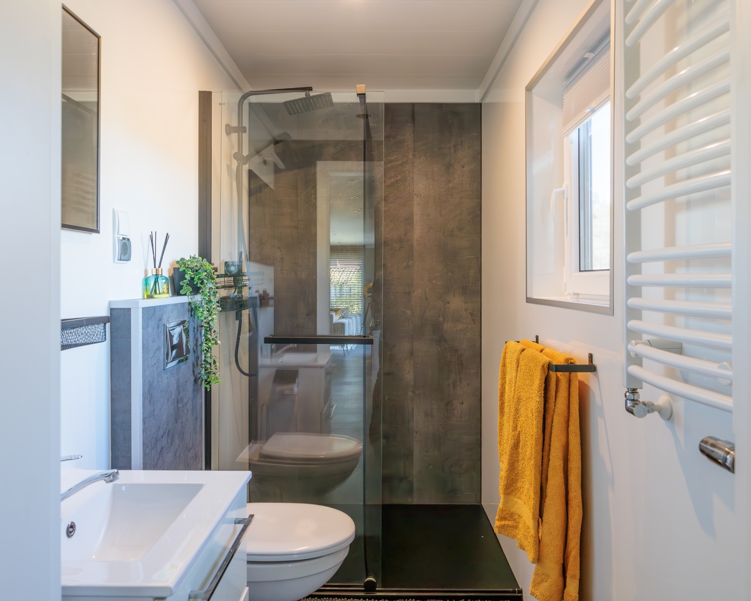 Luxe badkamer bevat een ruime douchecabine, enkele wastafel, toilet, designradiator en een regen douche.