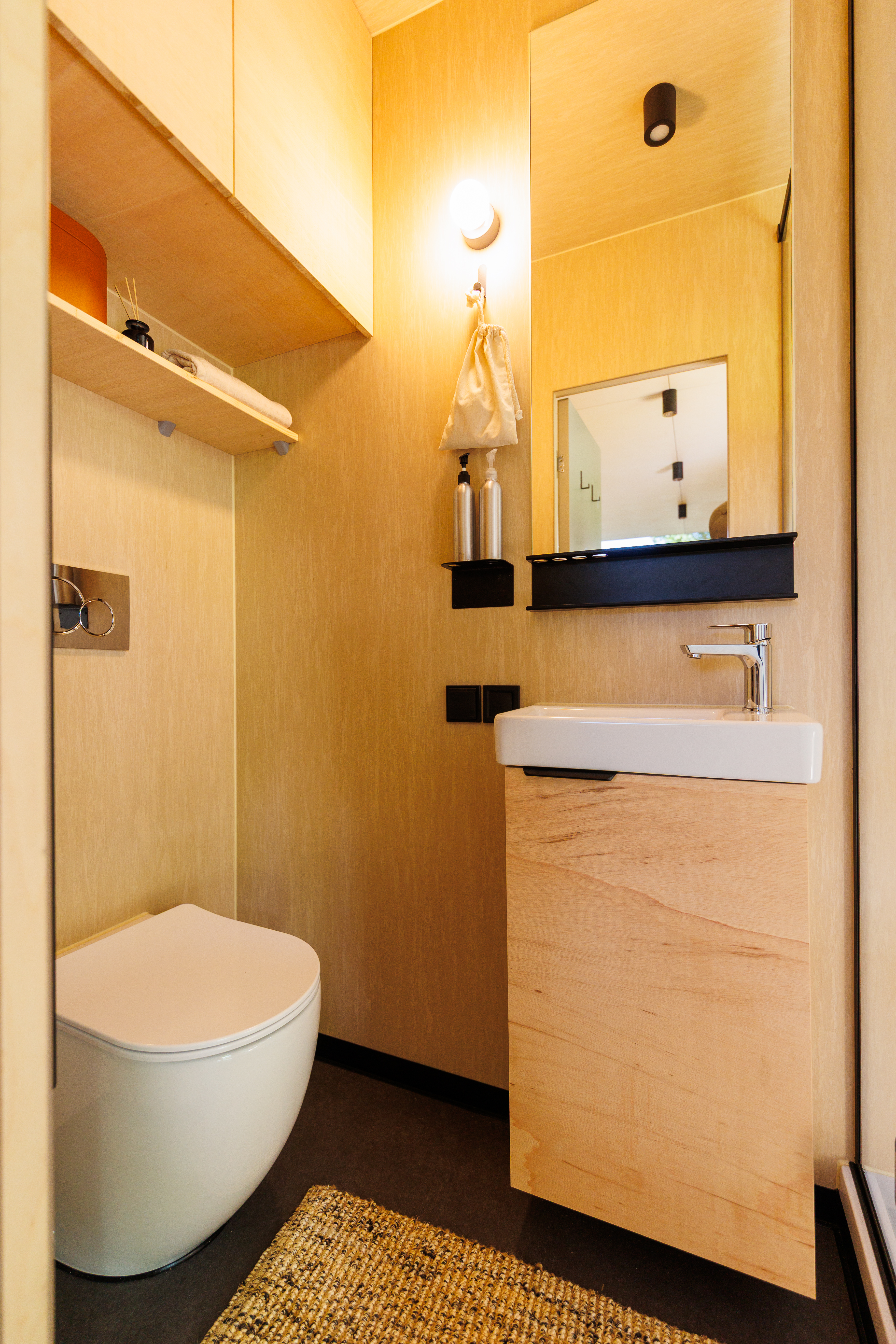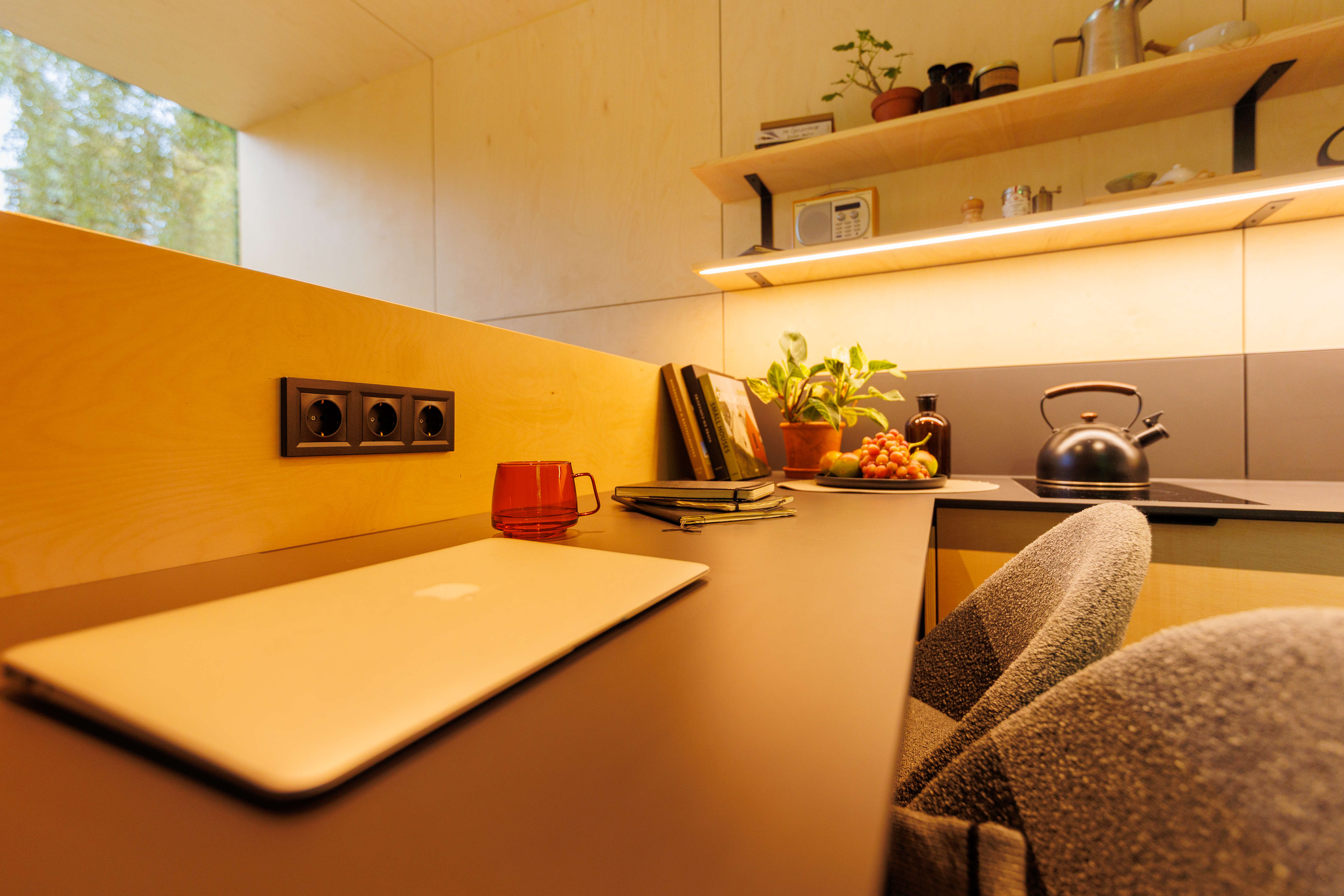 Binnen vind je alles wat je nodig hebt: een knus tweepersoonsbed met dat waanzinnige uitzicht -, een eigen badkamer -, een keukentje voor het bereiden van een simpel gerechtje en airco voor warme zomerdagen. Klein, maar compleet. Da’s pas tiny done right. Dit huisje is ook perfect voor een workcation. Aan het barretje werk je in de ochtend lekker even de eerste mailtjes weg, met een heerlijk uitzicht!
