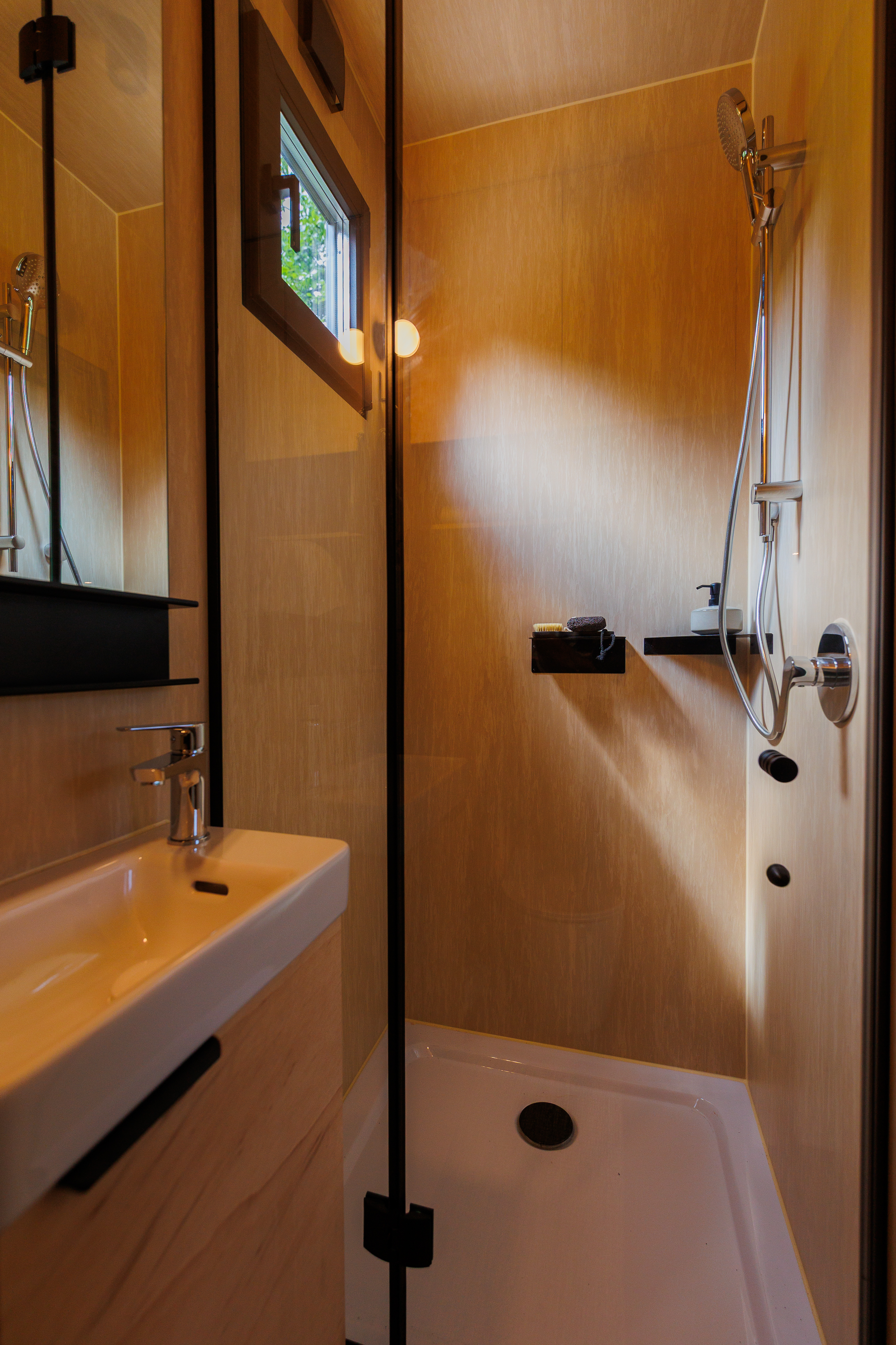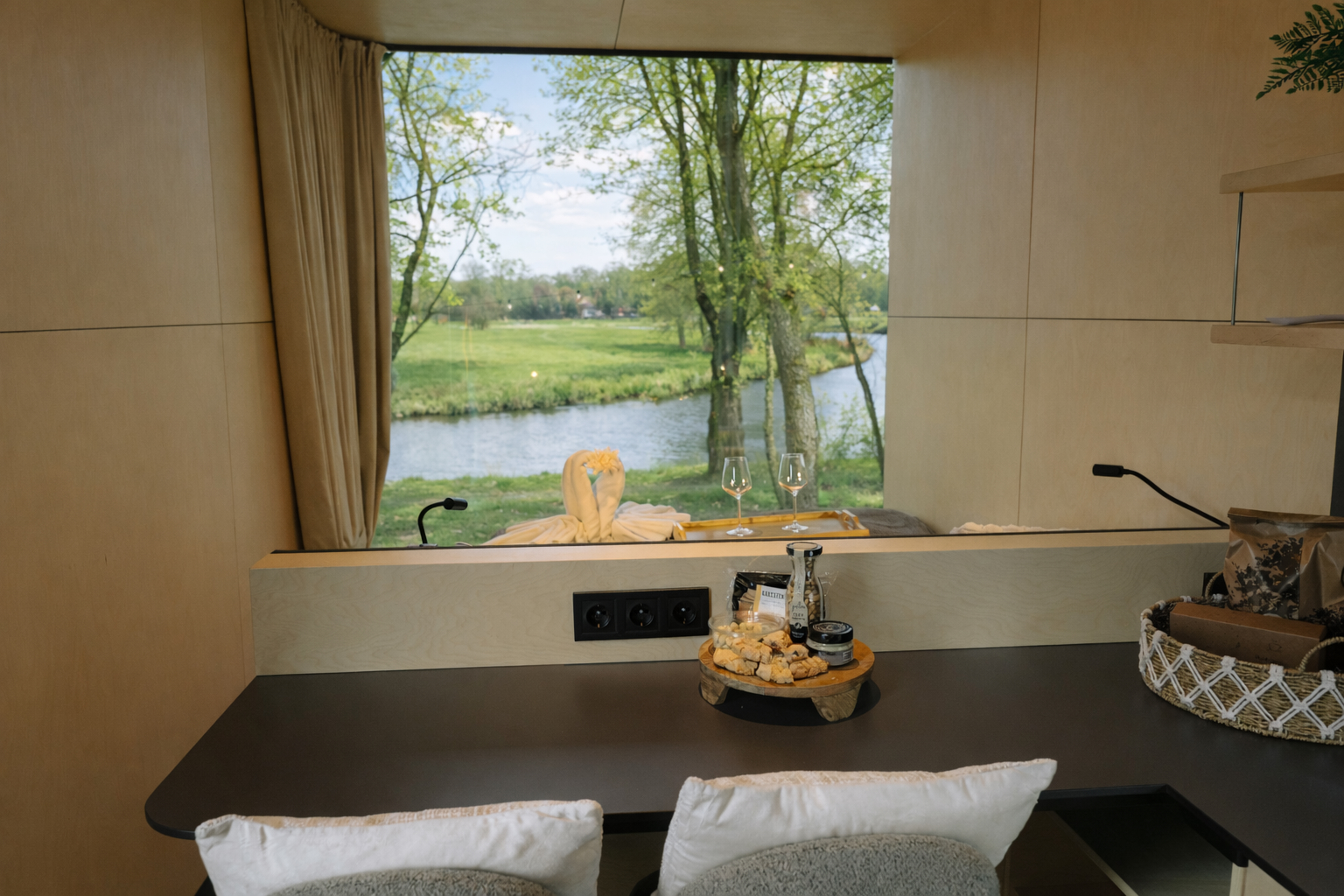 - Psst... deze foto`s zijn nog van de fabrikant. Het interieur kan hier en daar iets afwijken, maar geen zorgen: het uitzicht, de bubbeltub én het slow living-gevoel zijn 100% Mölke.