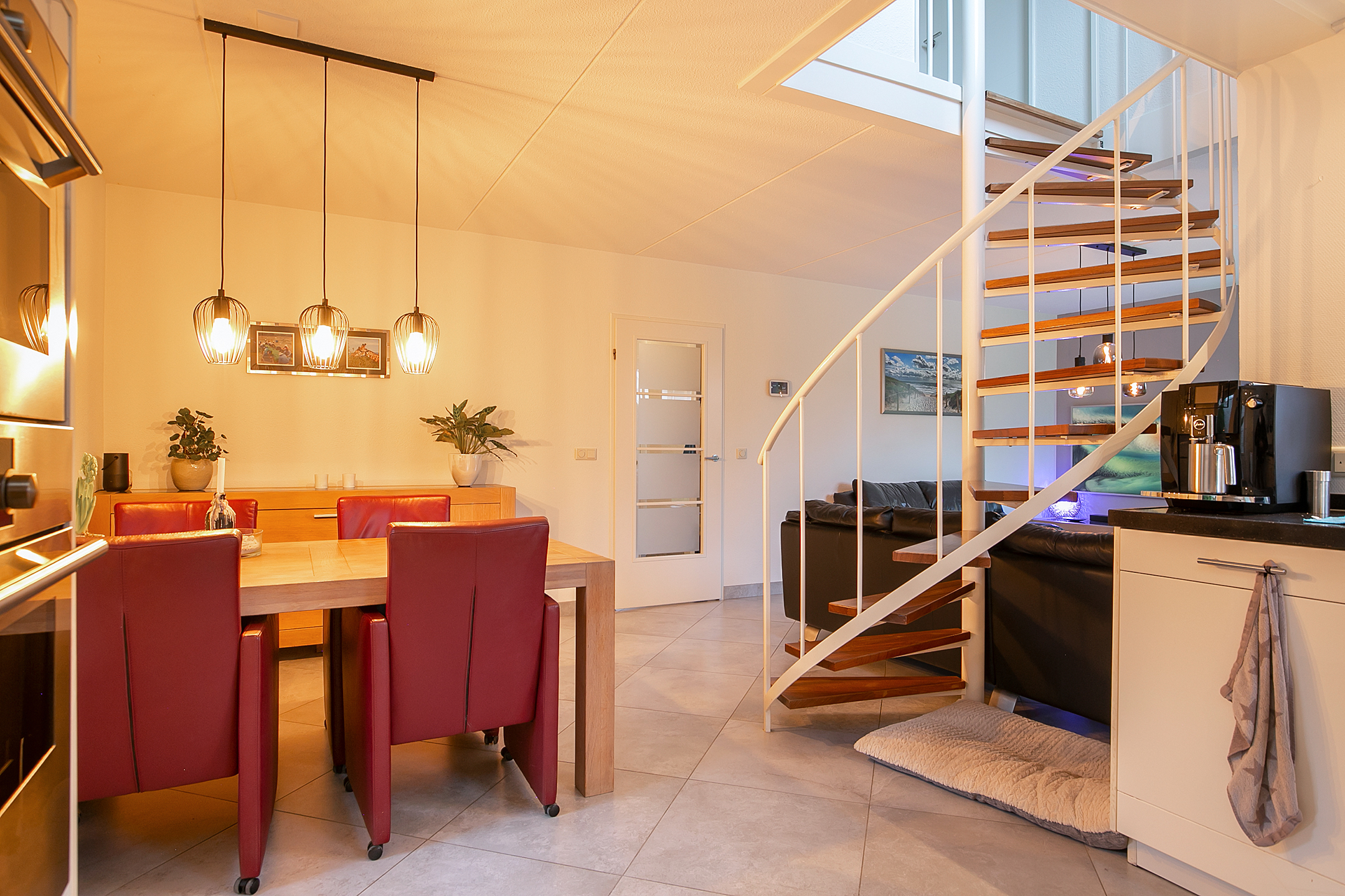 Vanuit de hal komt u in de ruime woonkamer met gezellige zithoek met Smart-tv en uitzicht op de tuin. De moderne open keuken is ruim en voorzien van inbouwapparatuur zoals een inductiekookplaat, vaatwasser, oven, magnetron en koel-vriescombinatie. Voor de koffieliefhebbers is een Nespresso koffiemachine aanwezig.