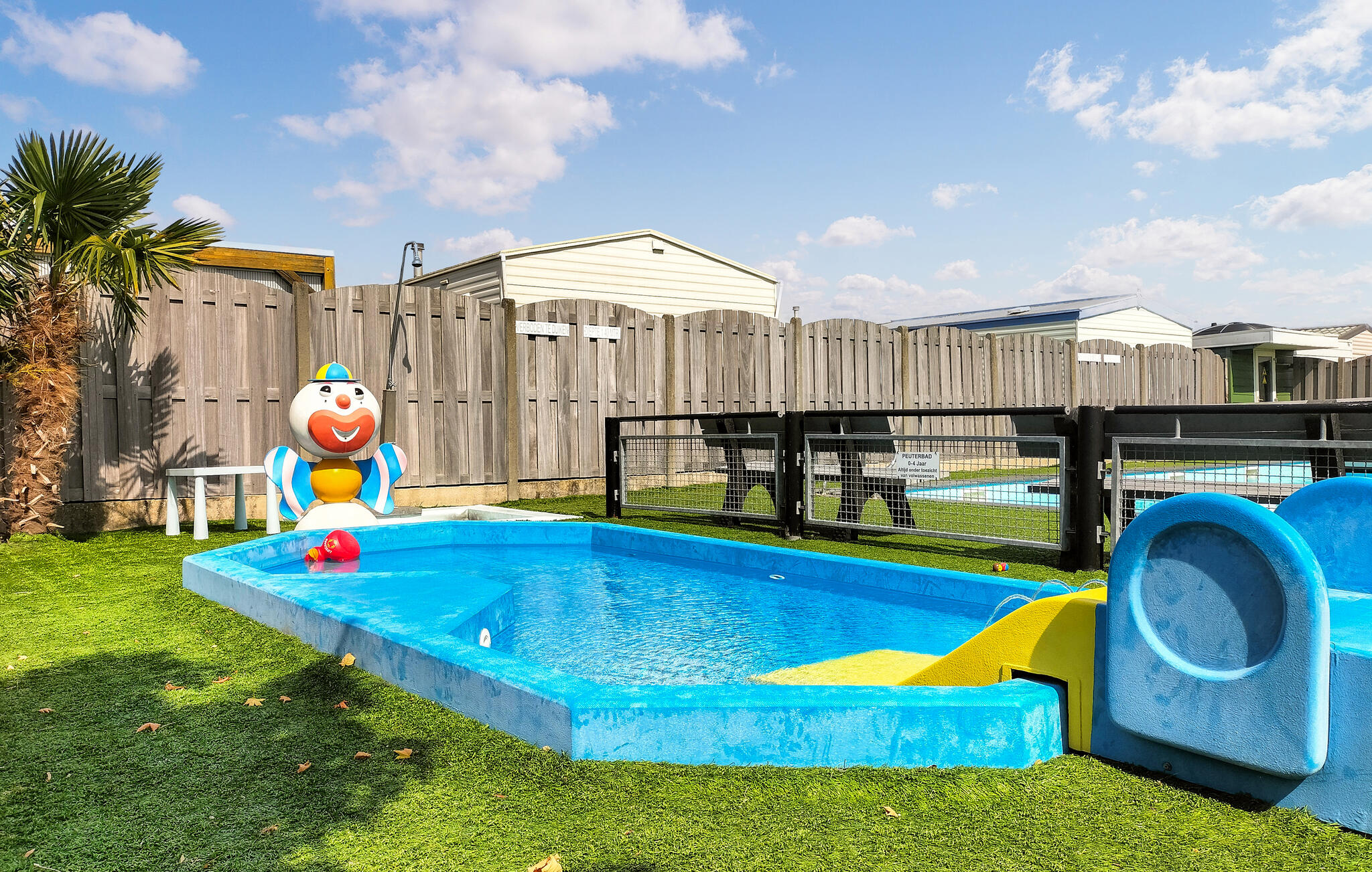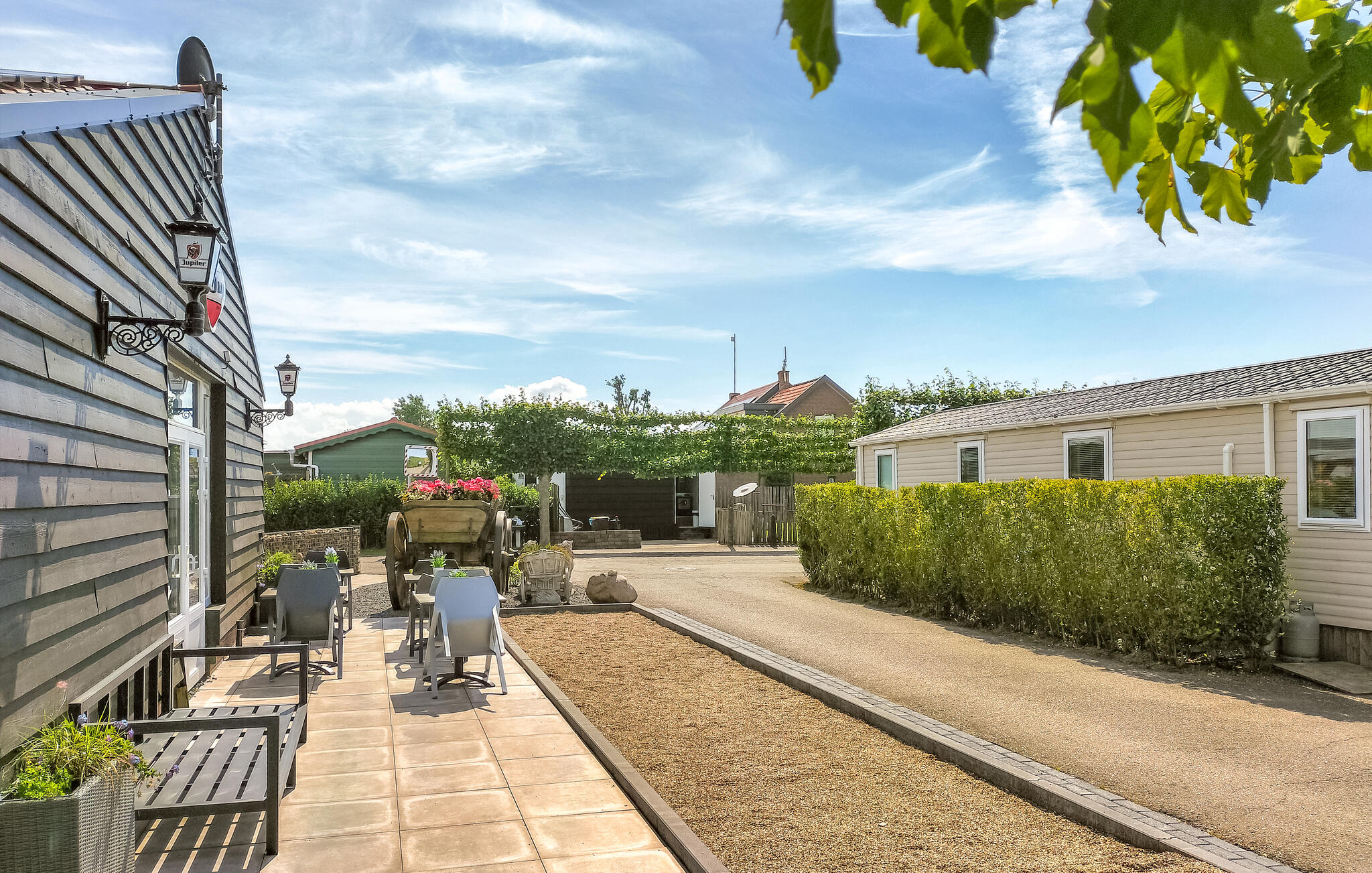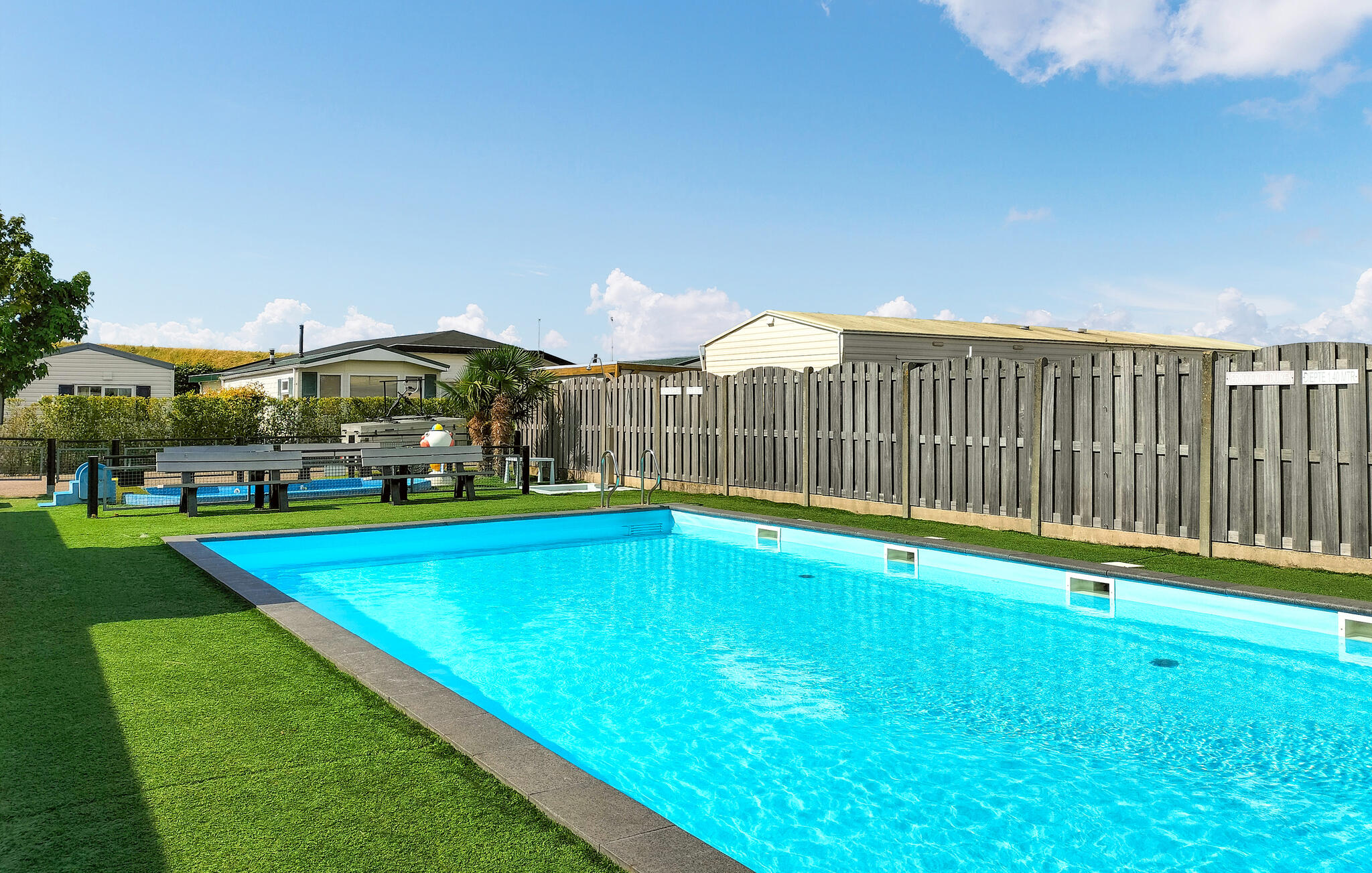 Stap uit op het betegelde terras direct voor het huis. Een tafel met stoelen nodigt je uit om buiten te eten of de dag rustig te beginnen. Heggen en een klein hek zorgen voor wat privacy. Maak gebruik van de campingfaciliteiten met zwembad en apart peuterbad. Je kinderen kunnen zich uitleven in de speeltuin, terwijl jij de fitnessruimte of de bowlingbaan uitprobeert. Huur een scooter en verken comfortabel de omgeving.