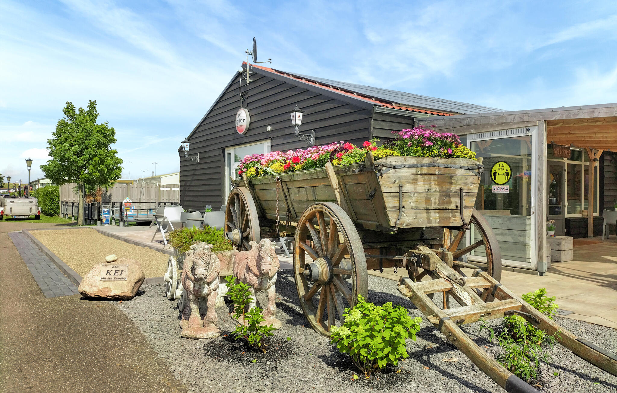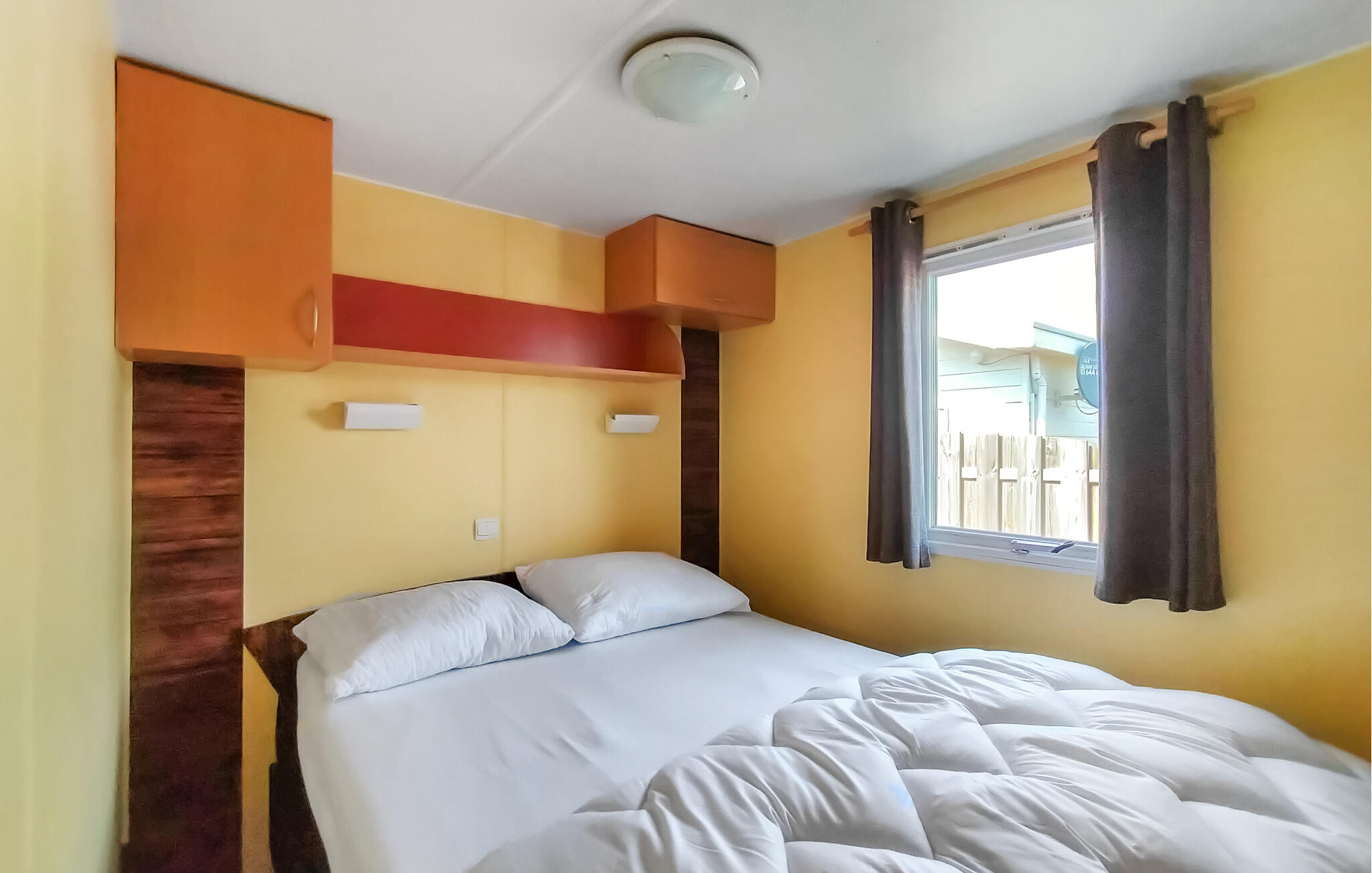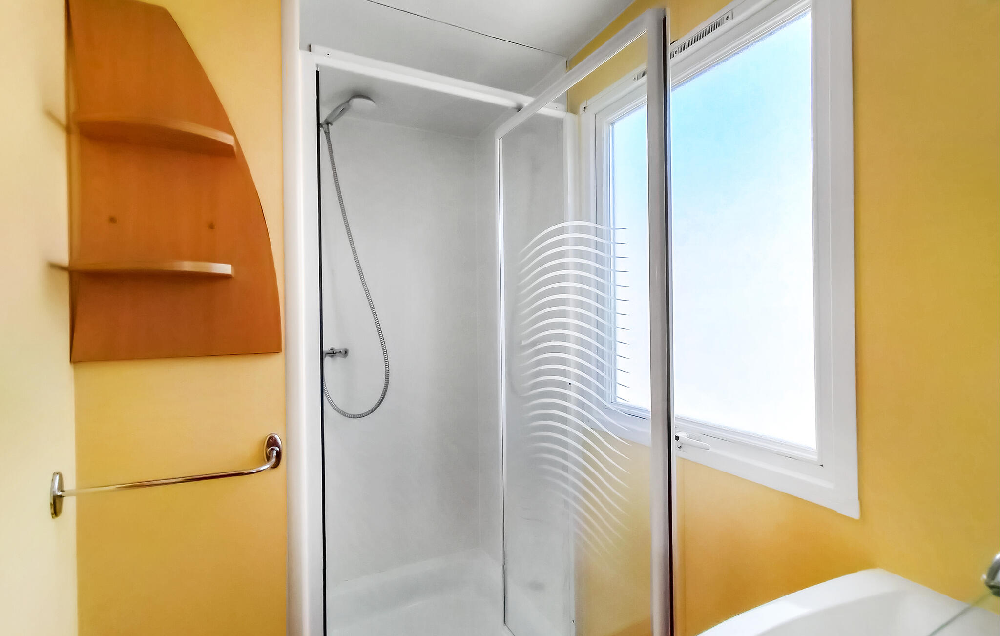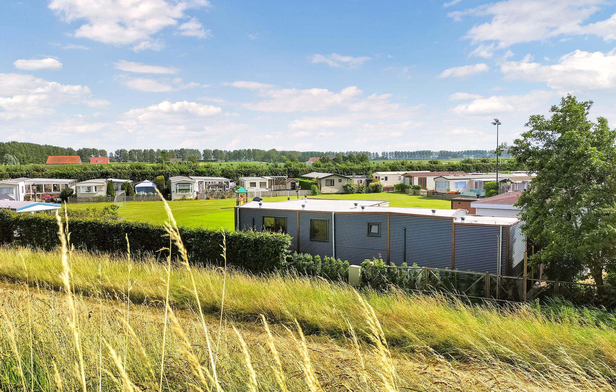 Stap uit op het betegelde terras direct voor het huis. Een tafel met stoelen nodigt je uit om buiten te eten of de dag rustig te beginnen. Heggen en een klein hek zorgen voor wat privacy. Maak gebruik van de campingfaciliteiten met zwembad en apart peuterbad. Je kinderen kunnen zich uitleven in de speeltuin, terwijl jij de fitnessruimte of de bowlingbaan uitprobeert. Huur een scooter en verken comfortabel de omgeving.