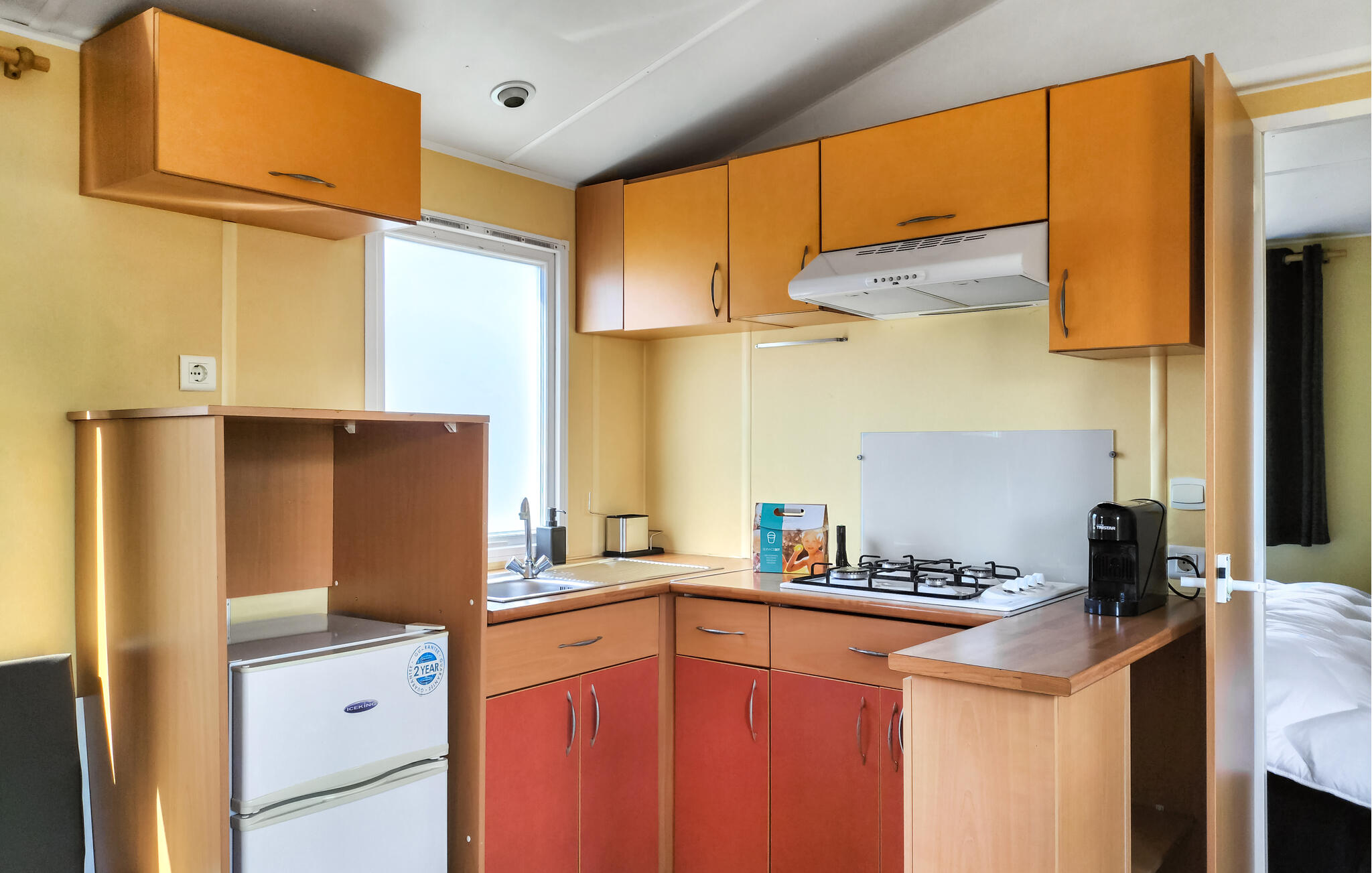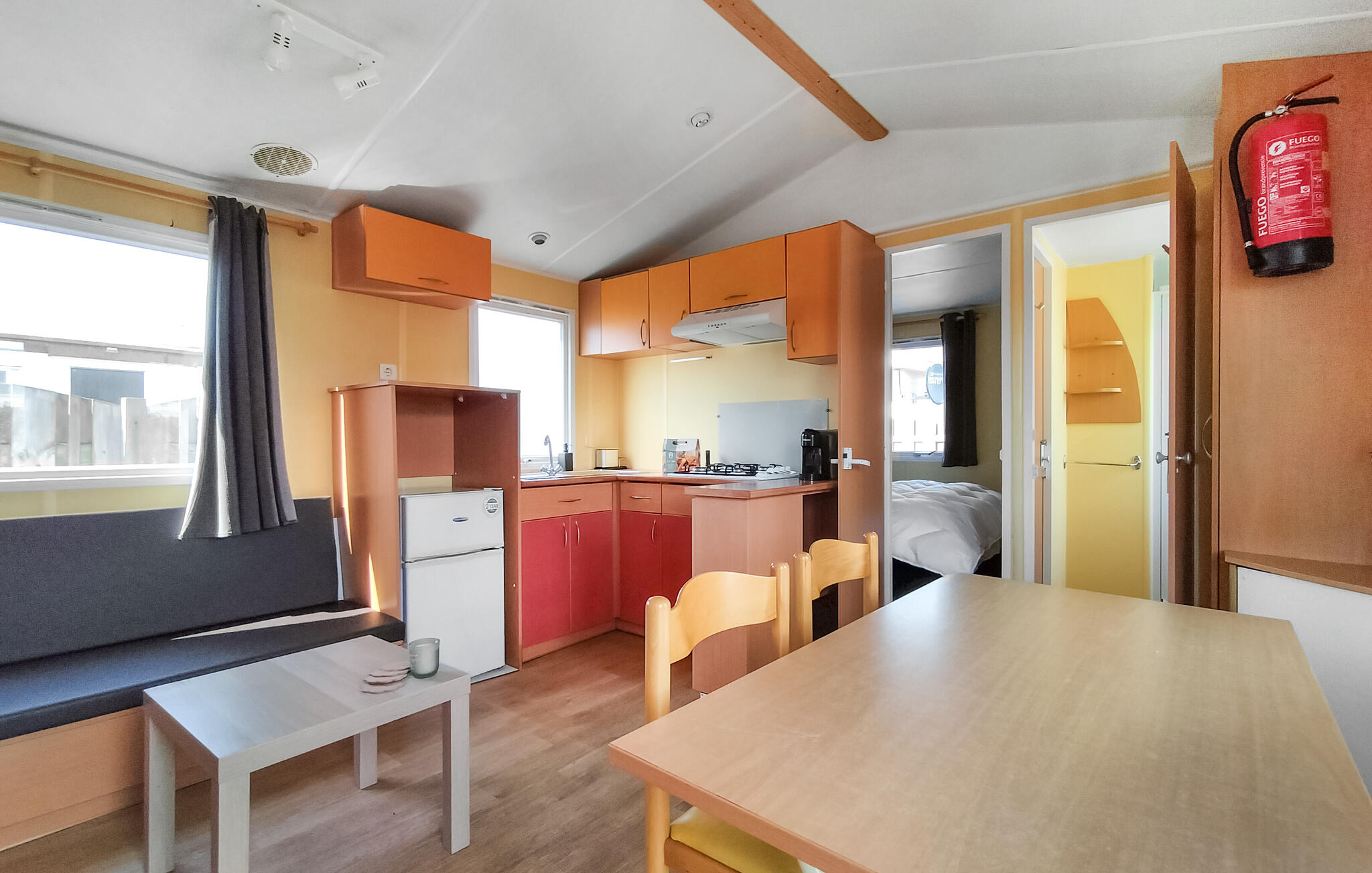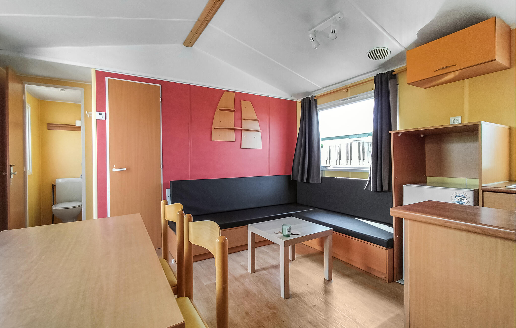 Geniet van een ongecompliceerde vakantie in je compacte vakantiehuis op een goed onderhouden camping. Het woongedeelte is praktisch ingericht en biedt een zithoek met bank, salontafel en eethoek. Neem plaats aan tafel of ontspan op de bank bij het raam na een actieve dag. Bereid eenvoudige maaltijden in de functioneel ingerichte, open keuken.