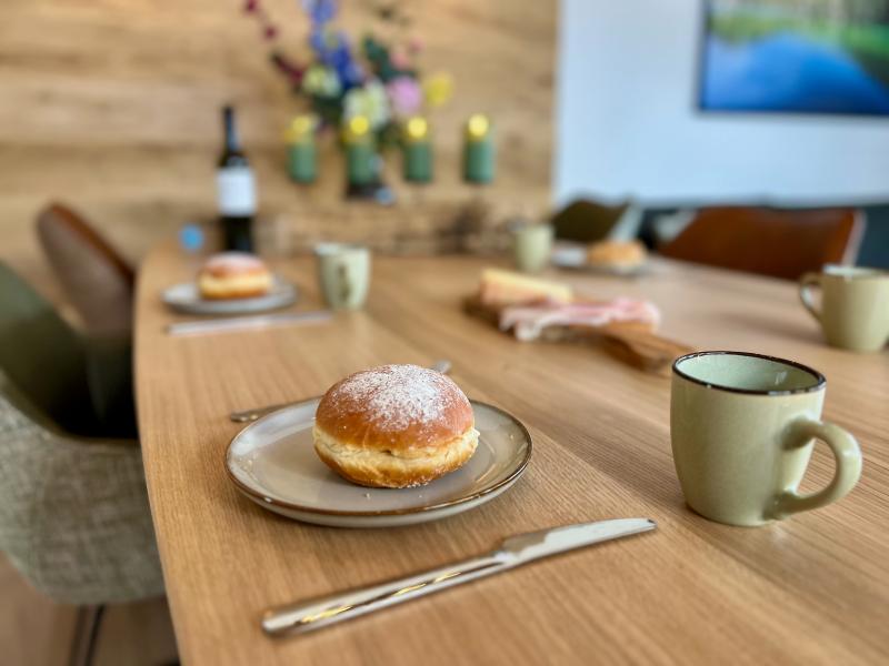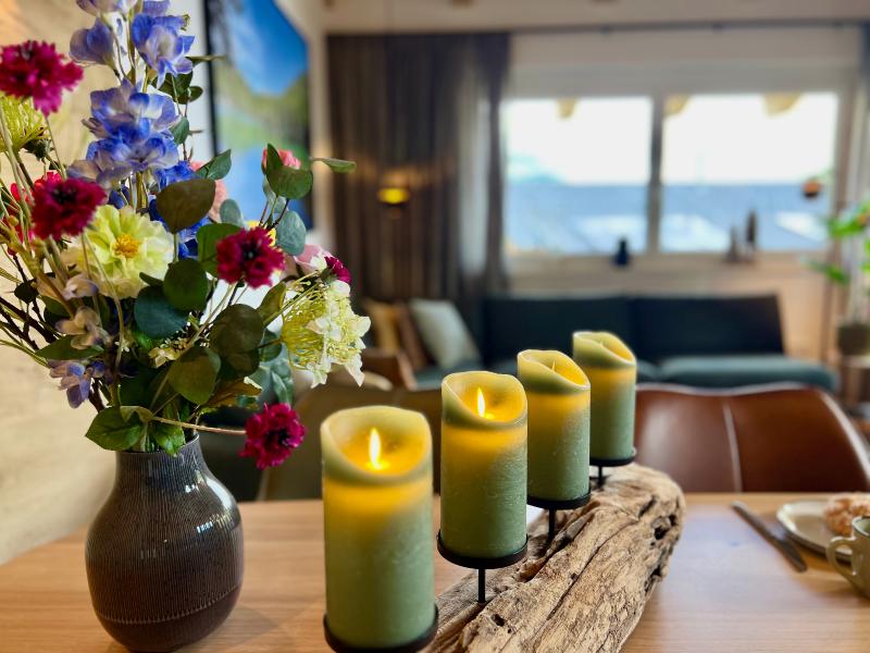 Op de 1e etage:  woonkamer met eettafel(6 personen), zithoek , open keuken met kookplaat(4 kookplaten, inductie), waterkoker, afzuigkap, koffiezetapparaat(filtermaling), koffiezetapparaat(nespresso cups), oven, magnetron, afwasmachine, koel-/vriescombinatie, citruspers , slaapkamer met 2-pers. bed(180 x 200 cm), TV(smart TV) , badkamer met douche, wastafel, haardroger , toilet met wc , balkon met eettafel(4 personen)