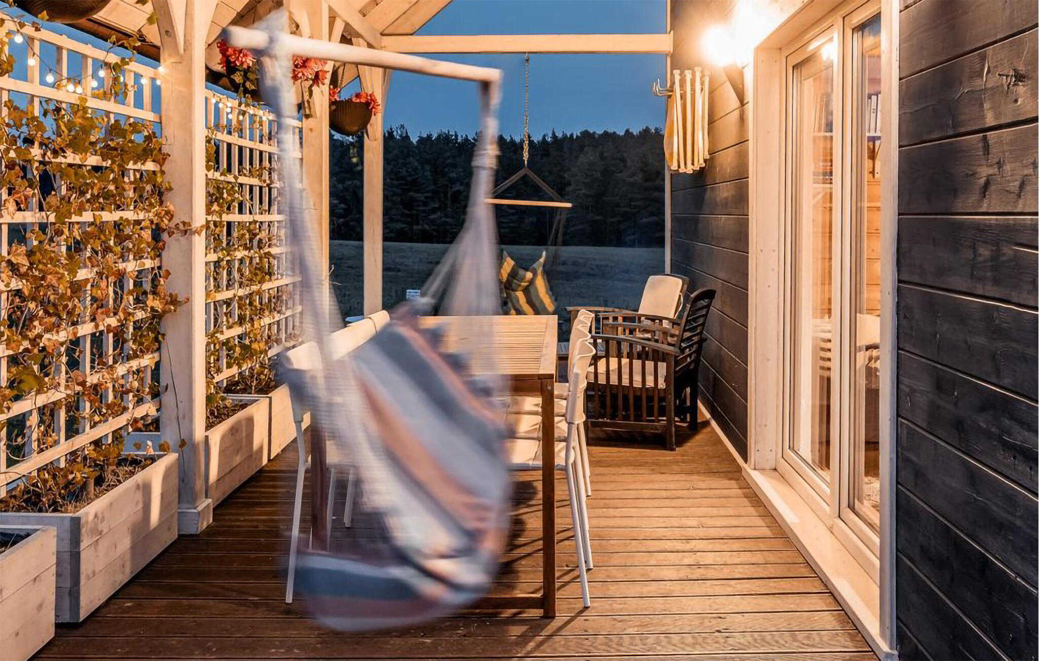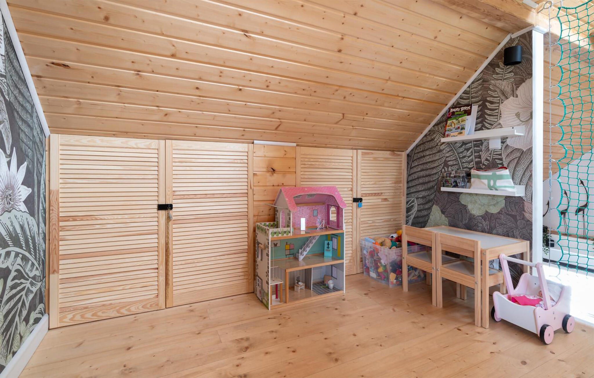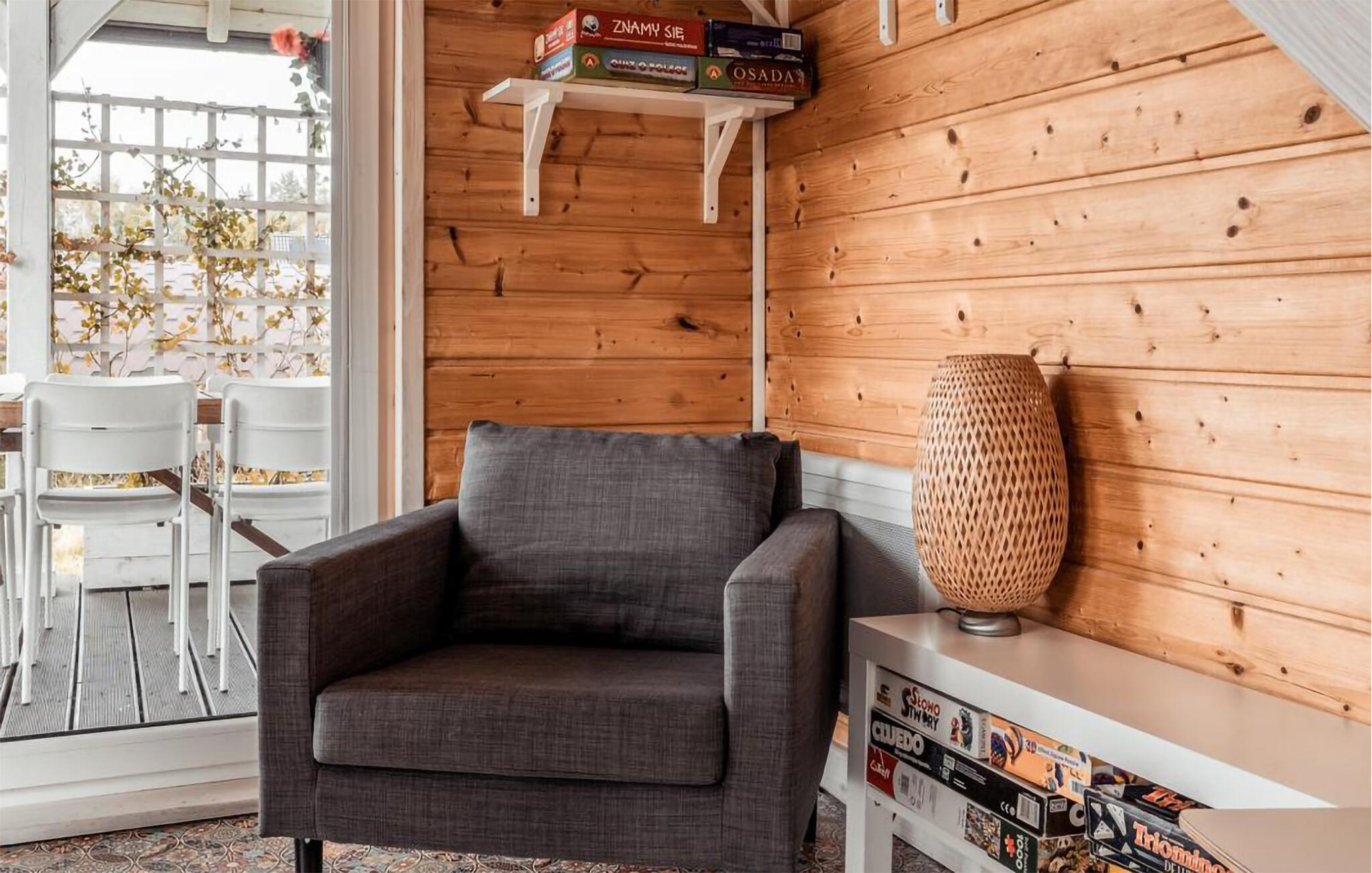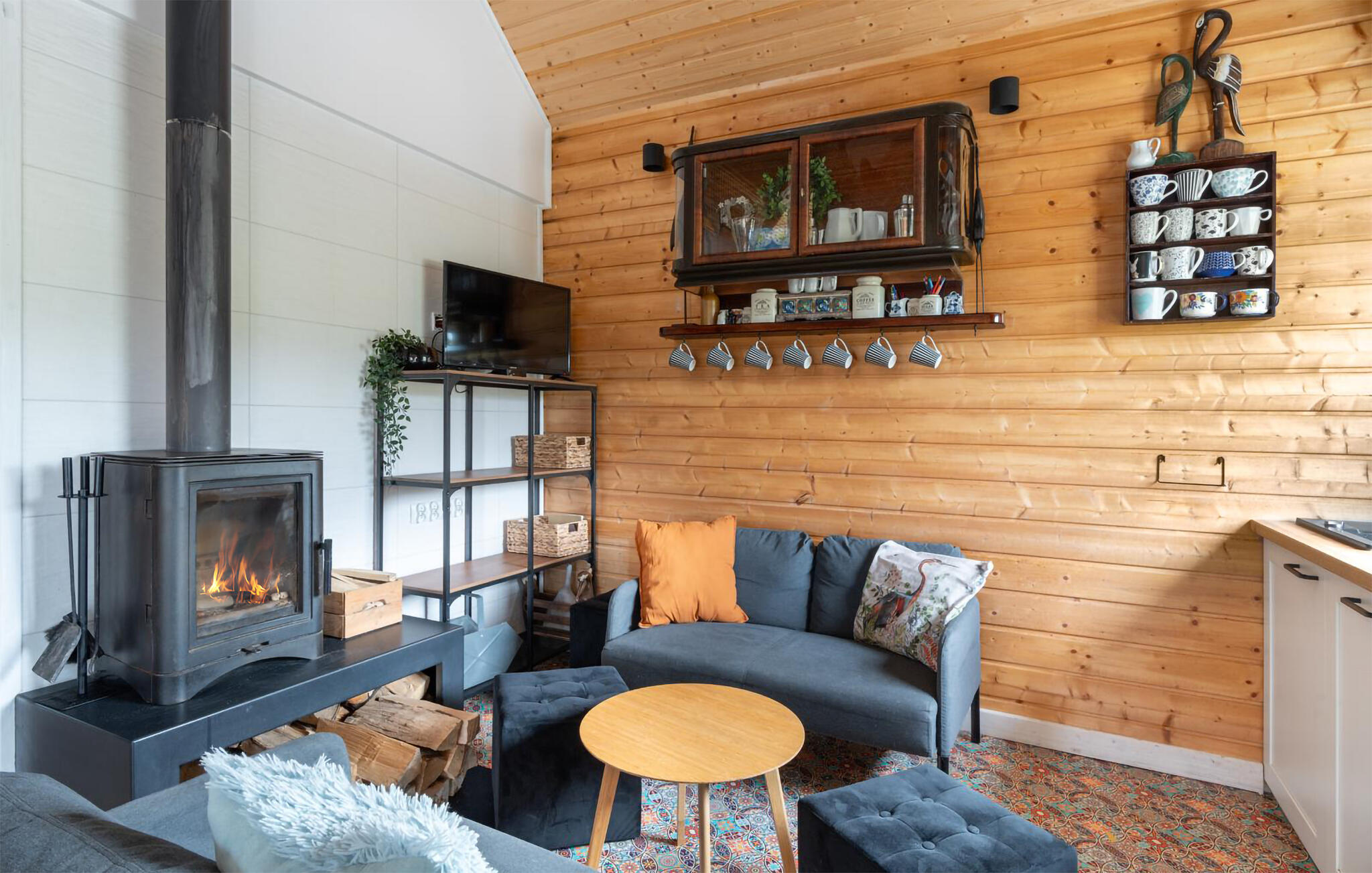 Laat je inspireren door het warme karakter van je huis met zijn lichtgekleurde houten lambrisering. Maak het jezelf gemakkelijk op de bank en geniet van de gezellige warmte van de houtkachel op koelere avonden. De open woon- en eetkamer is bijzonder gezellig dankzij de grote ramen. Neem plaats aan de eettafel met uitzicht op het groen en begin de dag ontspannen. Bereid gemakkelijk je maaltijden in de compacte, open keuken. Trek je terug in de galerij onder het dak, waar zitzakken en een tv een knus onderkomen creëren.