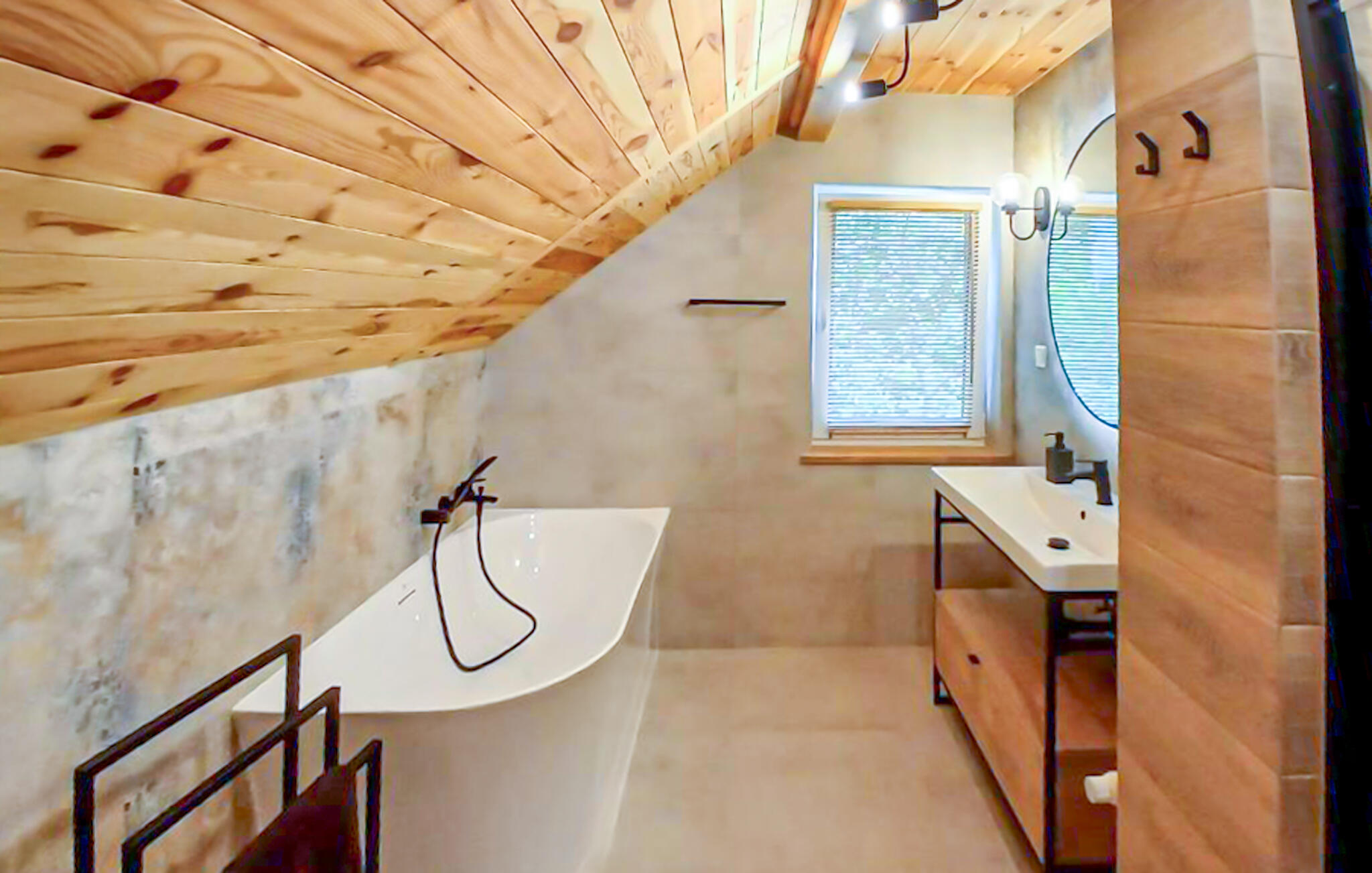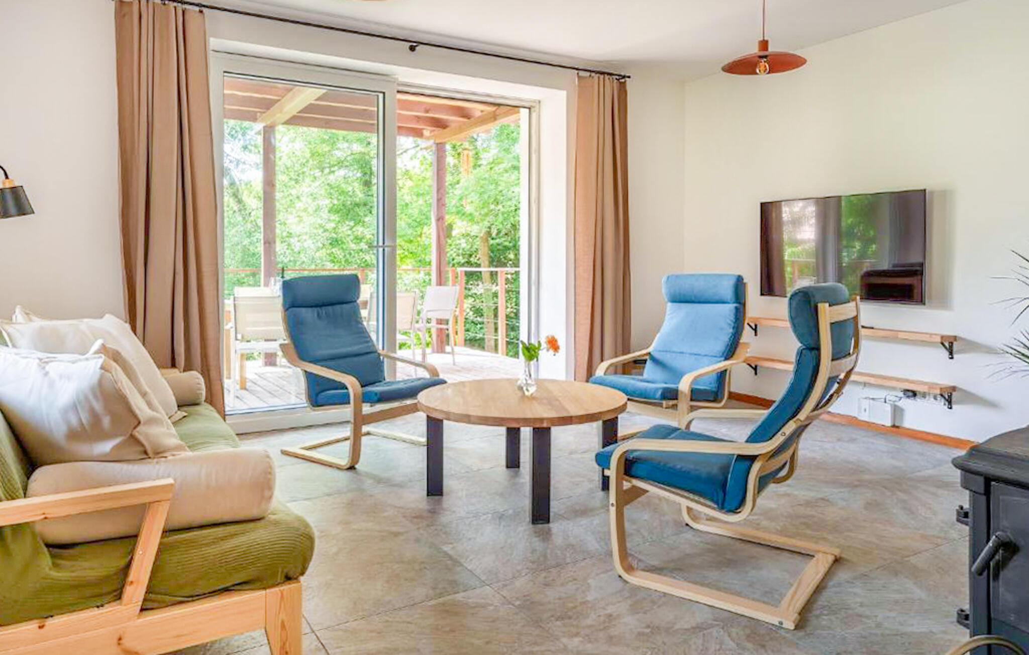Laat je verwelkomen door de lichte, open woonkamer en neem plaats in een van de comfortabele fauteuils of ontspan op de bank met uitzicht op het groen. Grote ramen zorgen voor veel natuurlijk licht en creëren een vriendelijke sfeer. Bereid verse maaltijden in de aparte keuken en gebruik de ruime werkoppervlakken voor je culinaire ideeën. Kom samen rond de eettafel voor de natuurstenen muur en geniet samen van je maaltijden in een moderne sfeer. Trek je daarna terug in de sauna en trakteer jezelf op weldadige warmte na een actieve dag.