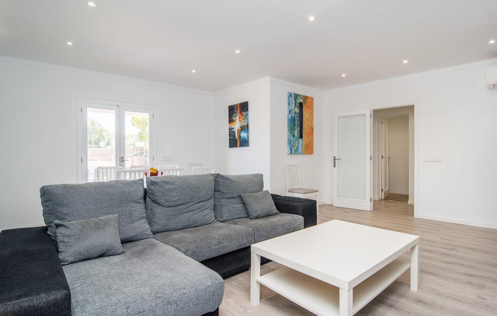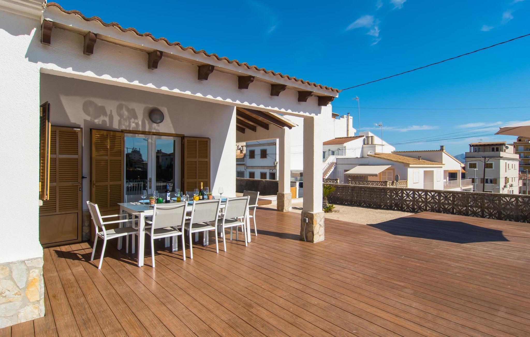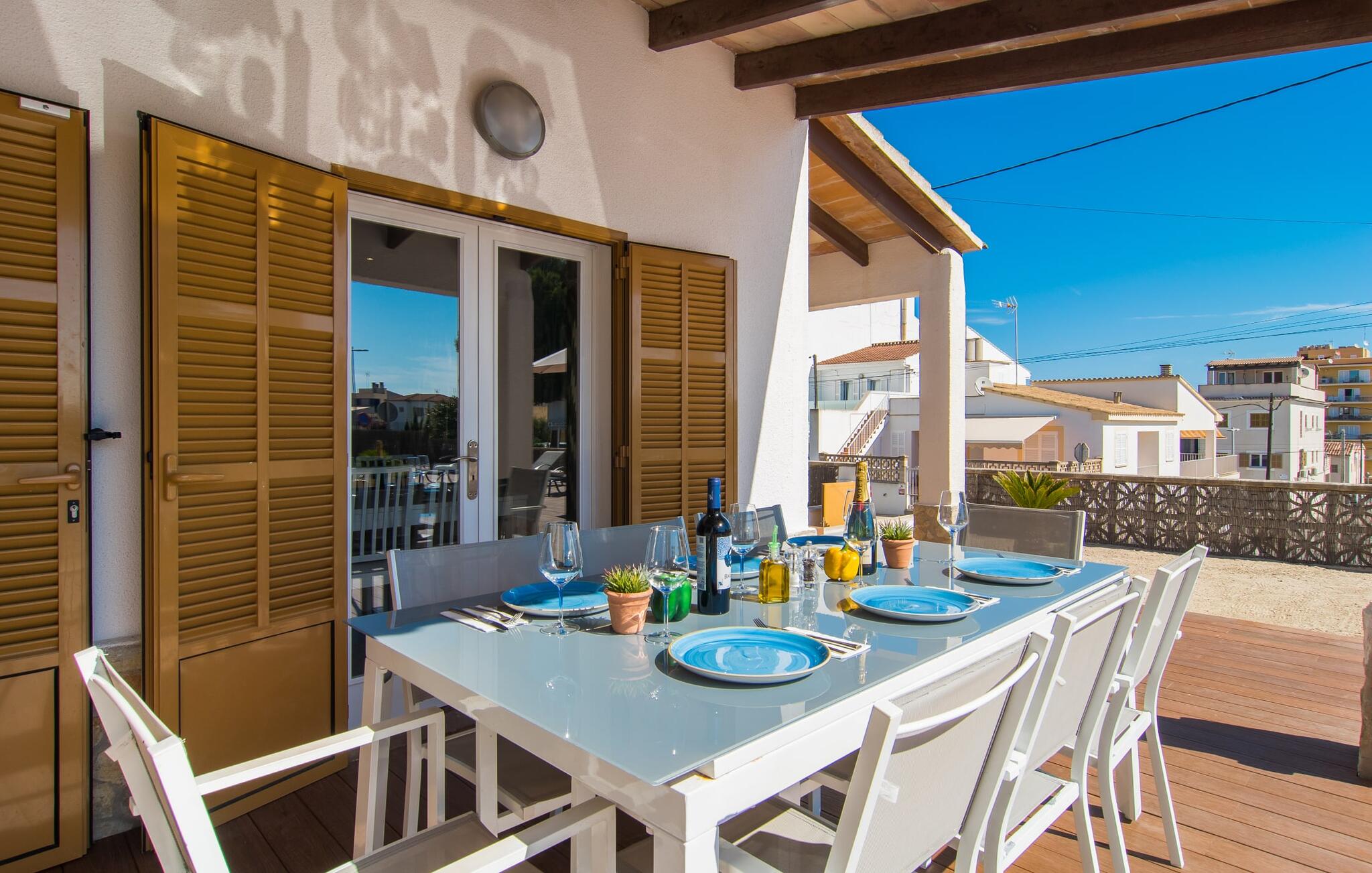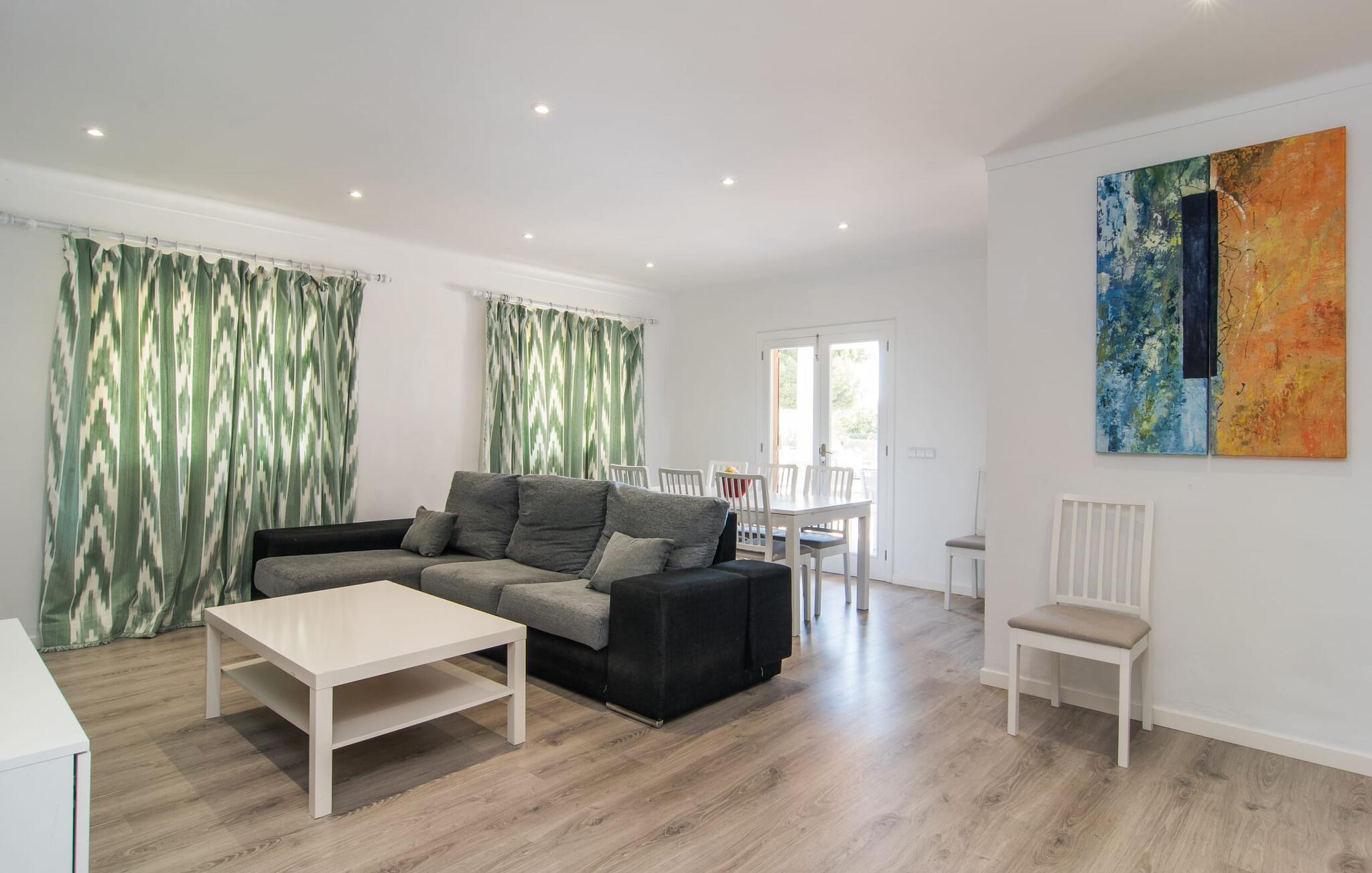 Deze villa op de begane grond biedt ruimte voor maximaal acht gasten in een vriendelijke en praktische omgeving. Het interieur wordt gekenmerkt door een heldere, ingetogen sfeer met witte tinten en contrasterende accenten. De open woon-eetkamer heeft een ruime bank en een grote tafel, terwijl de volledig uitgeruste keuken directe toegang biedt tot het terras. Met vier slaapkamers en drie badkamers (twee en suite) is privacy gegarandeerd. Deze villa is een uitstekend vakantiehuis op Mallorca, een combinatie van uitstekende infrastructuur en de nabijheid van de zee zonder afbreuk te doen aan comfort, bijna als een boerderij, midden in het hart van de stad!