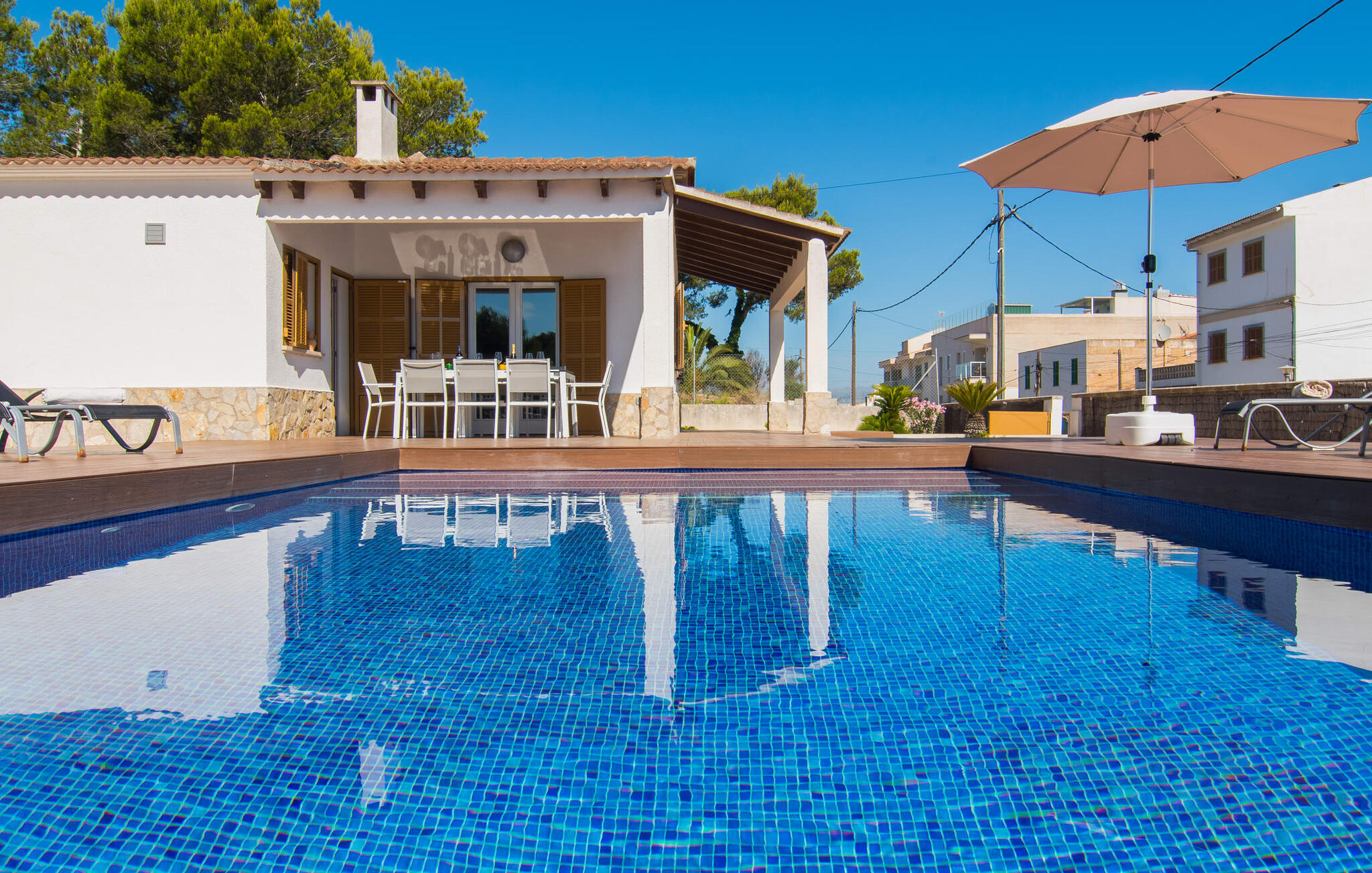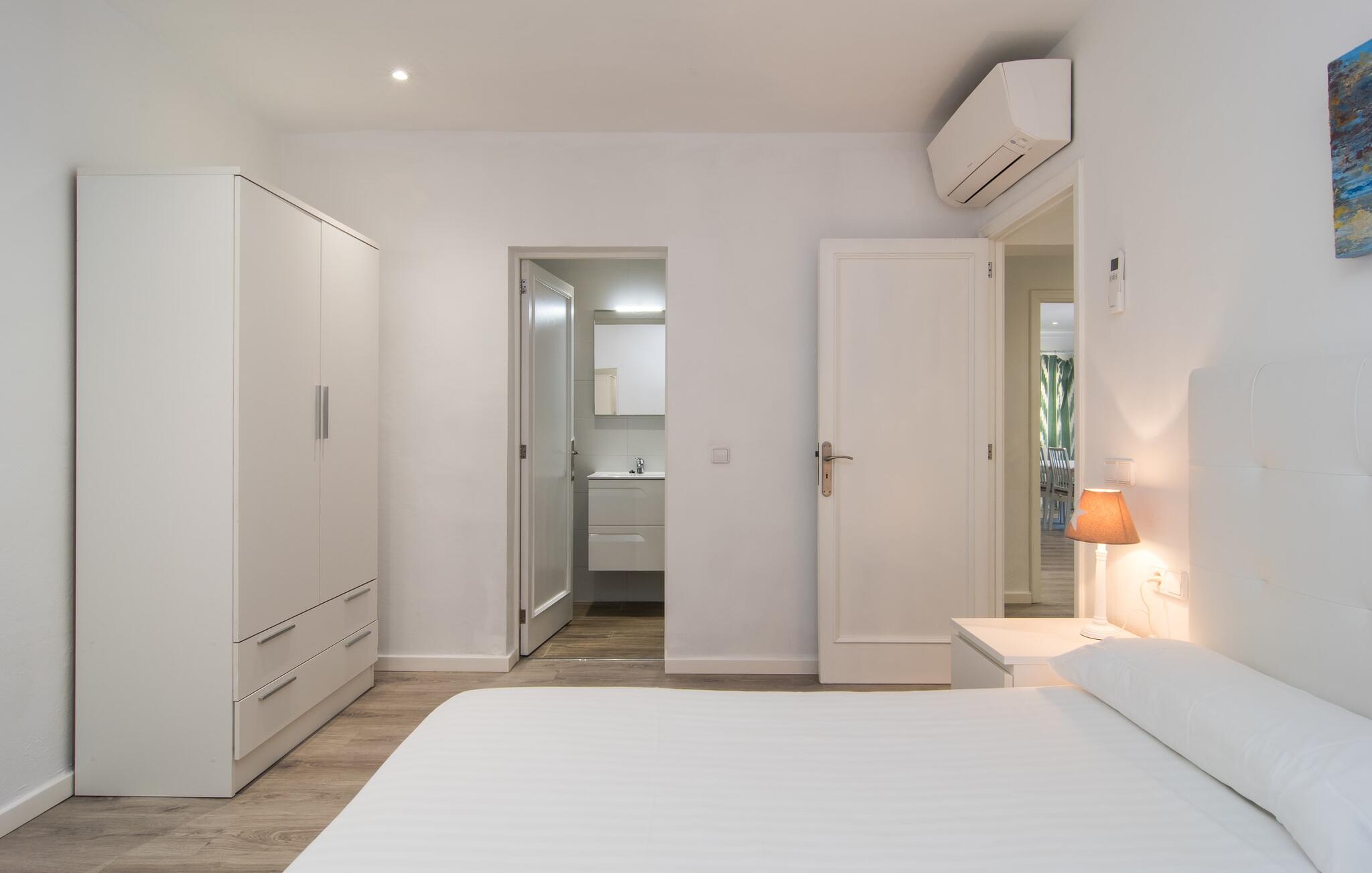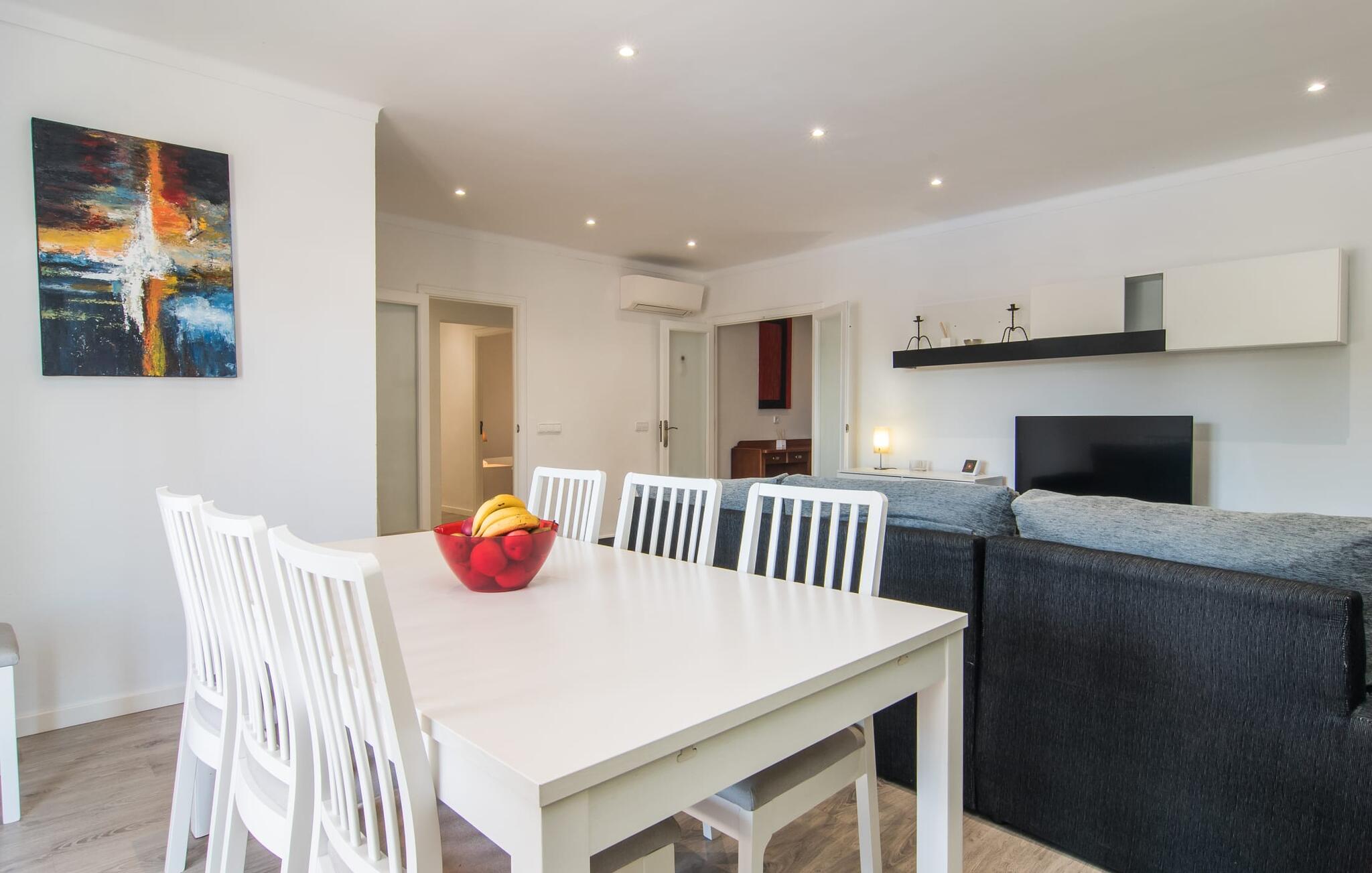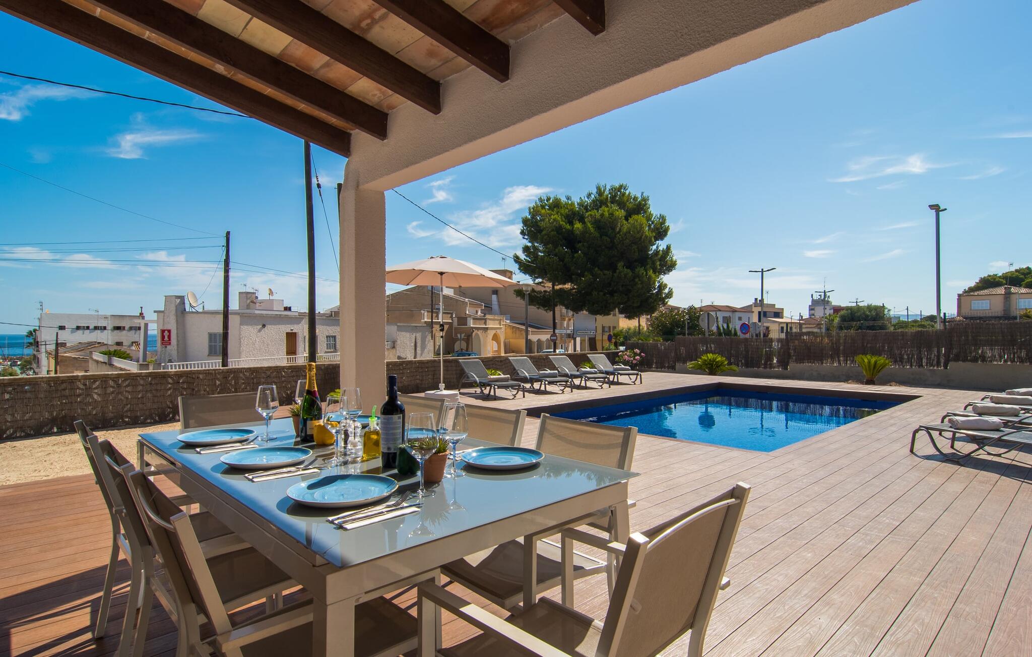 Deze villa op de begane grond biedt ruimte voor maximaal acht gasten in een vriendelijke en praktische omgeving. Het interieur wordt gekenmerkt door een heldere, ingetogen sfeer met witte tinten en contrasterende accenten. De open woon-eetkamer heeft een ruime bank en een grote tafel, terwijl de volledig uitgeruste keuken directe toegang biedt tot het terras. Met vier slaapkamers en drie badkamers (twee en suite) is privacy gegarandeerd. Deze villa is een uitstekend vakantiehuis op Mallorca, een combinatie van uitstekende infrastructuur en de nabijheid van de zee zonder afbreuk te doen aan comfort, bijna als een boerderij, midden in het hart van de stad!
