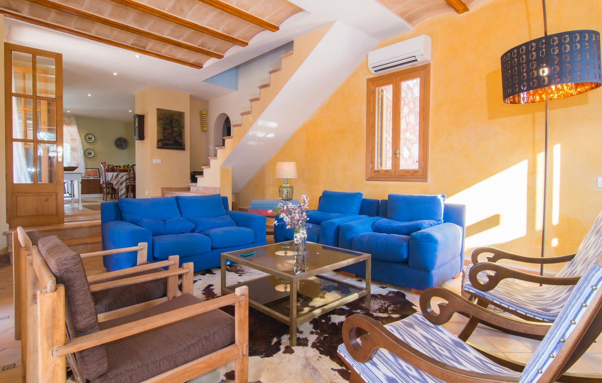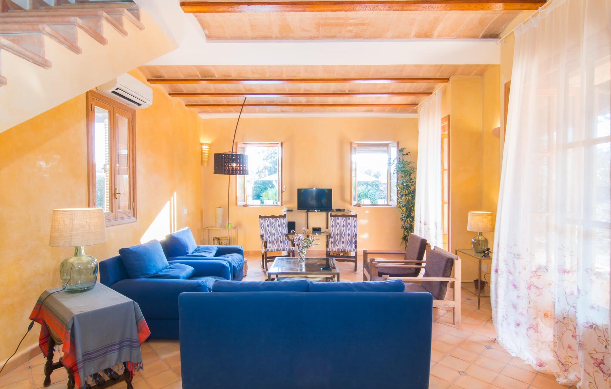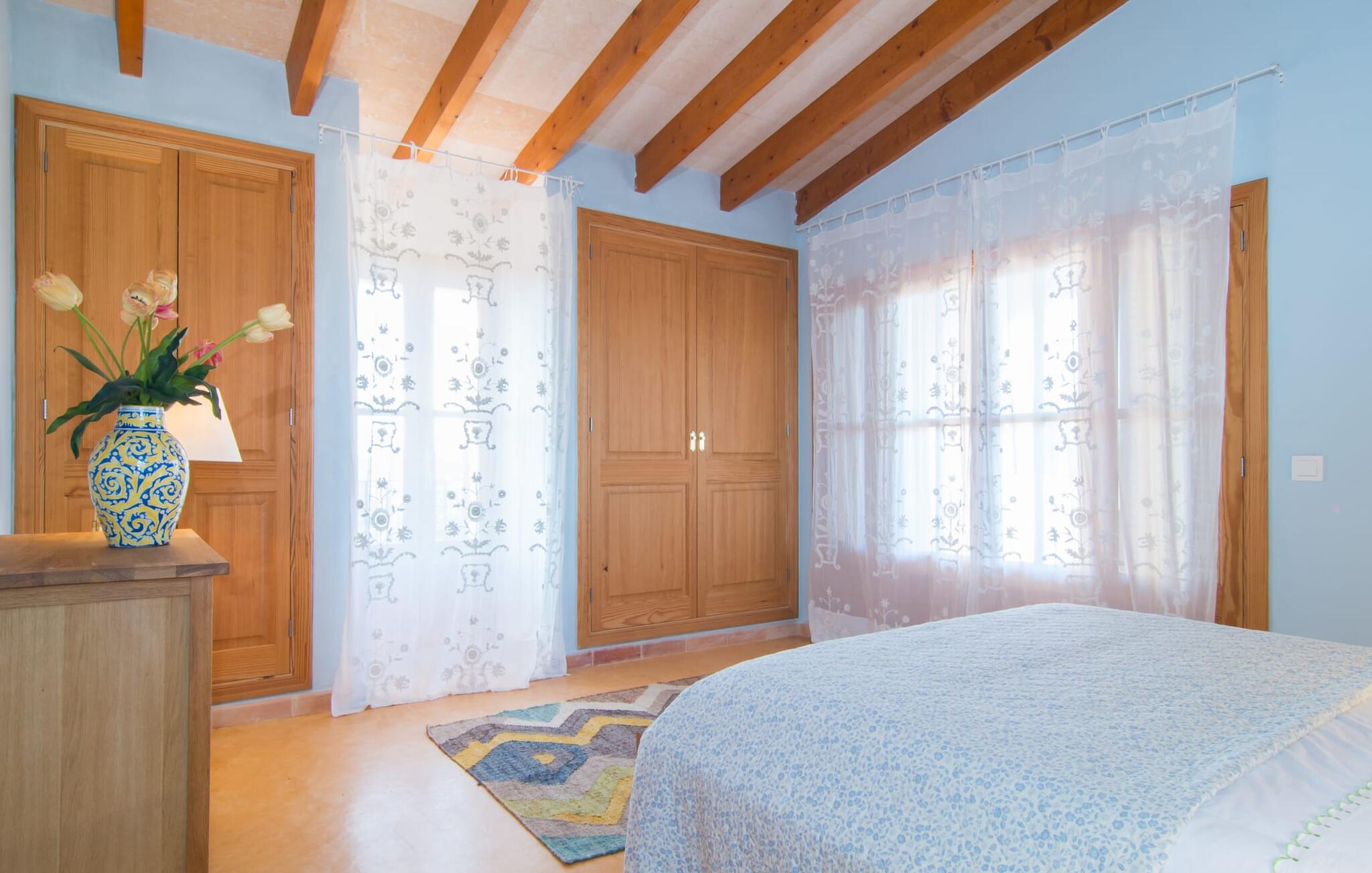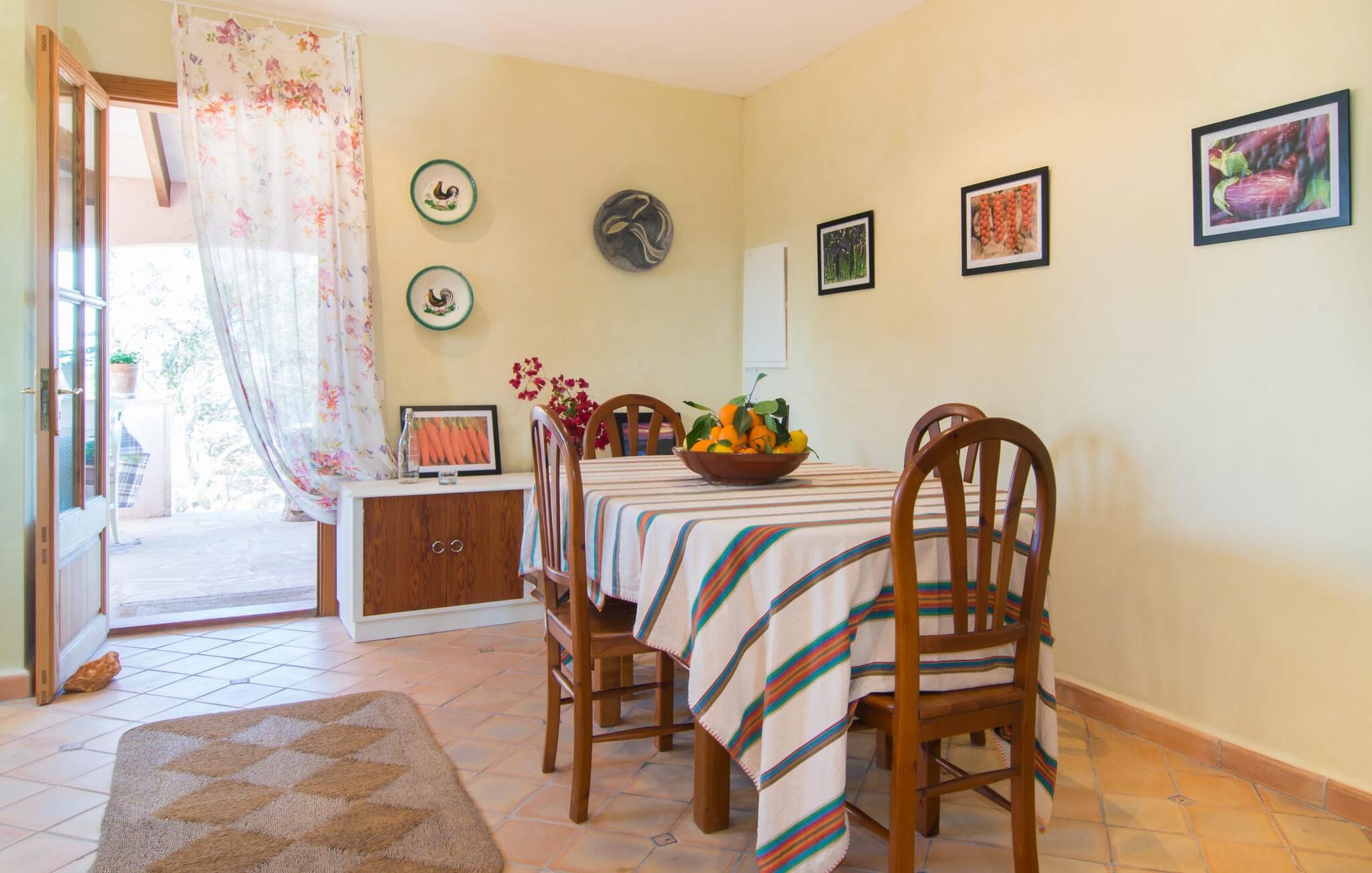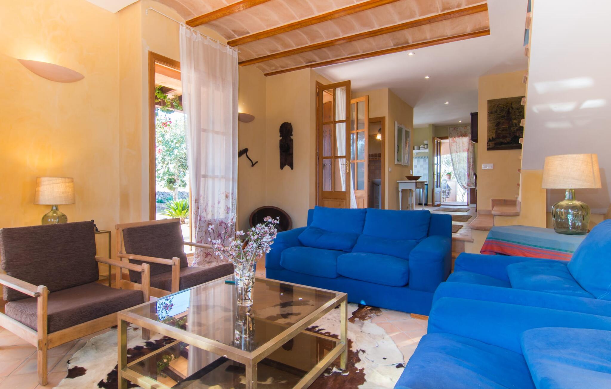Net als een vrucht die levert wat de buitenkant belooft, stelt de binnenkant ook niet teleur: Mallorcaans, nuchter, zonnig en bloemig. Een frisse bries lijkt door het huis te waaien en luchtige gordijnen geven de ruimte een lichte touch. De ruime, open woon-, kook- en eetruimte wordt omringd door gezellige, felblauwe banken die je uitnodigen om je onder te dompelen in een filmavondje. Natuurlijk kun je ook wegdromen in de aangenaam eenvoudige slaapkamers met massief houten bedden; de slaapkamers zijn ingericht met een keuze uit donkerder of lichter gekleurd meubilair en een van de slaapkamers boven heeft directe toegang tot een beschut balkon met prachtig uitzicht over de bomen naar de bergen daarachter. Als je hier slaapt, kun je de deur open laten. De badkamers, een op de begane grond en een op de bovenverdieping, worden gedeeld door twee slaapkamers. Het enige dat nog genoemd moet worden is de moderne, goed uitgeruste keuken met een eigen plekje in de zon, aan de muren waarvan knapperige, verse groenten van de wekelijkse markt in Campos smakelijk hangen: een paradijs voor vegetariërs en liefhebbers van rauwkost, ware het niet dat de fantastische gemetselde barbecue voor de deur er om schreeuwt gebruikt te worden. Het zou zonde zijn om niet... ¡Buen provencho!