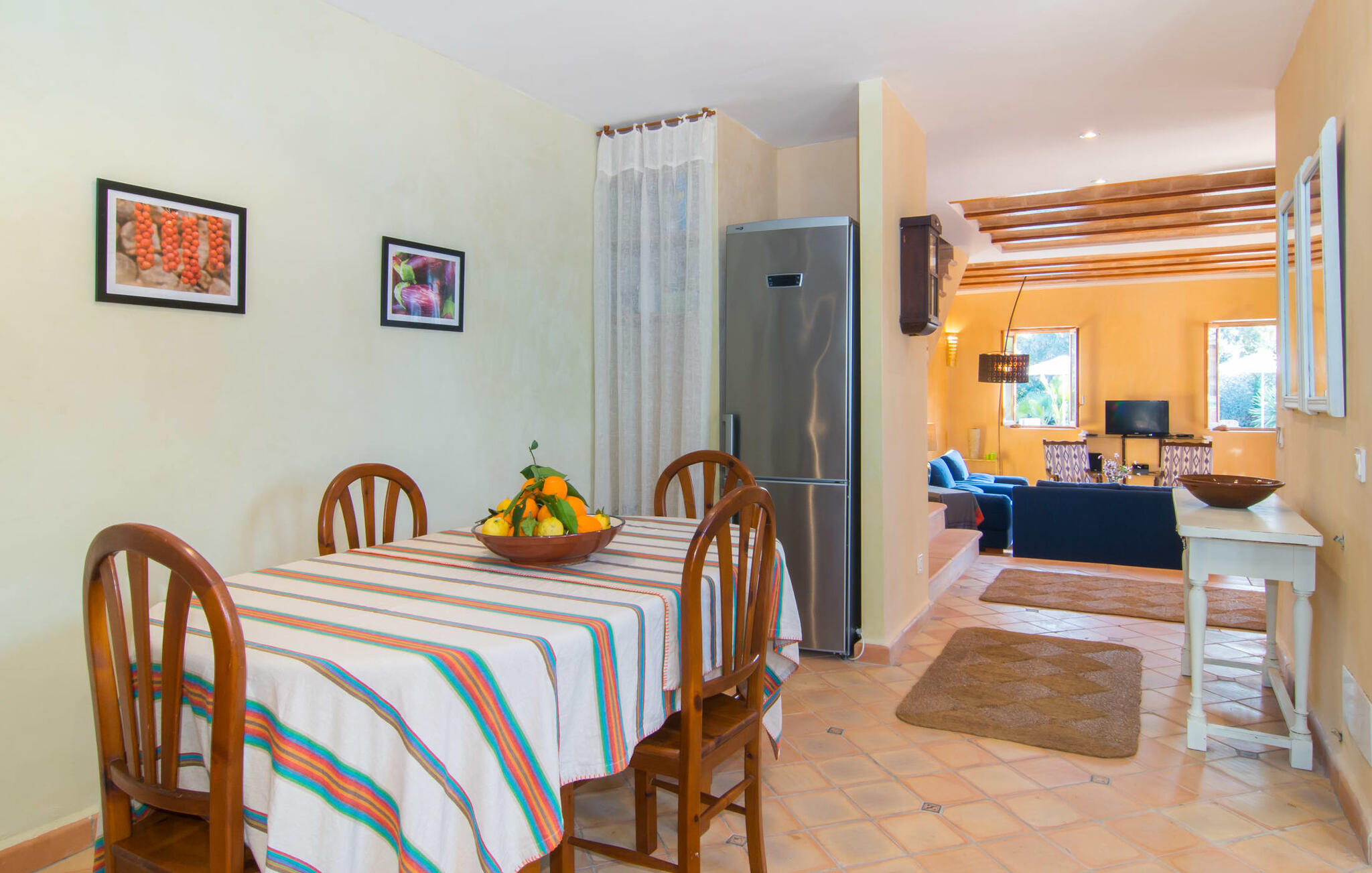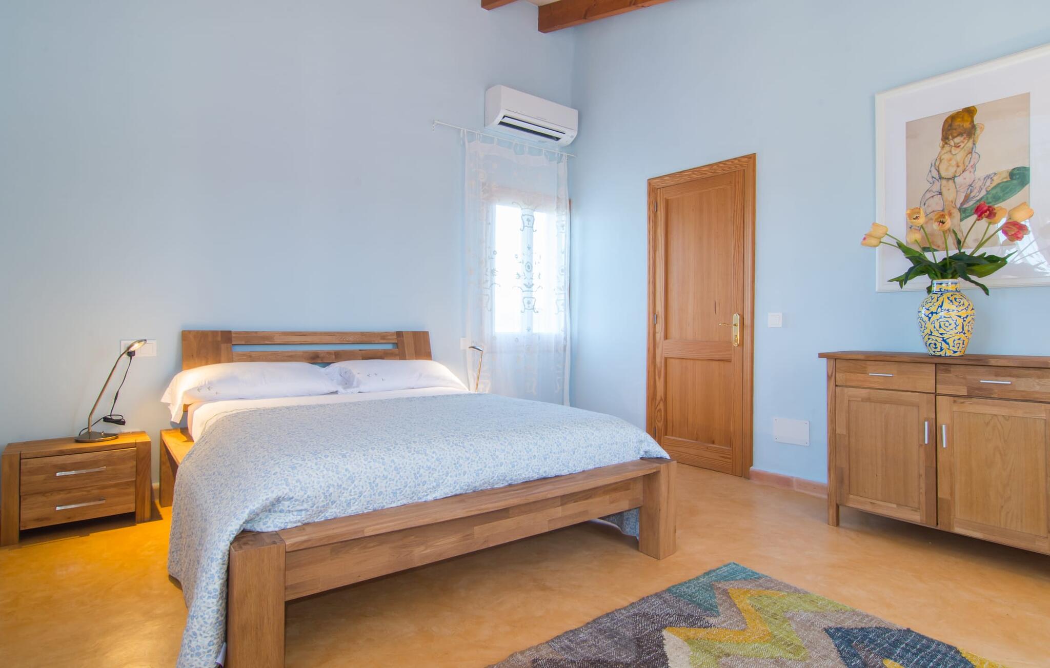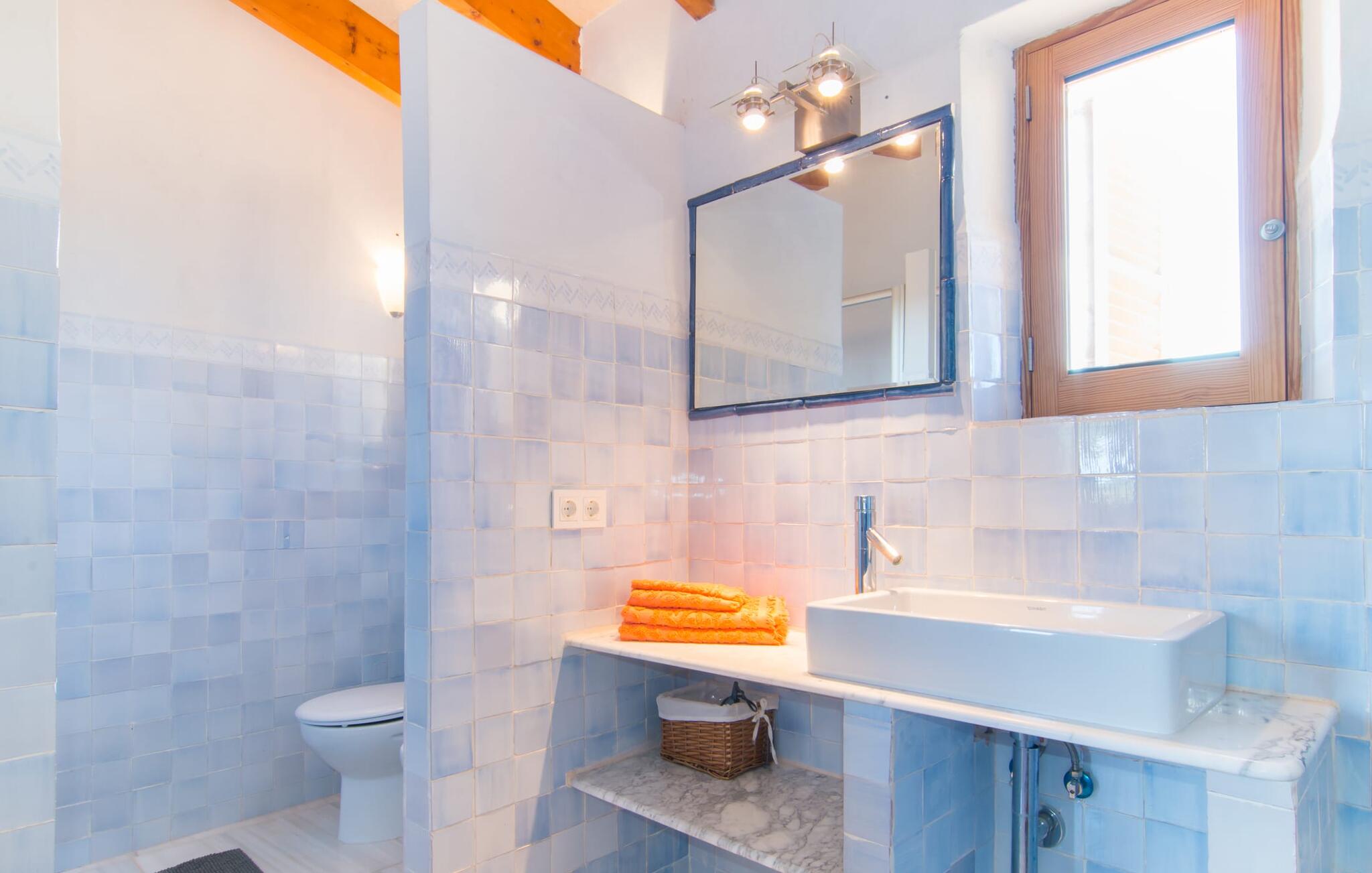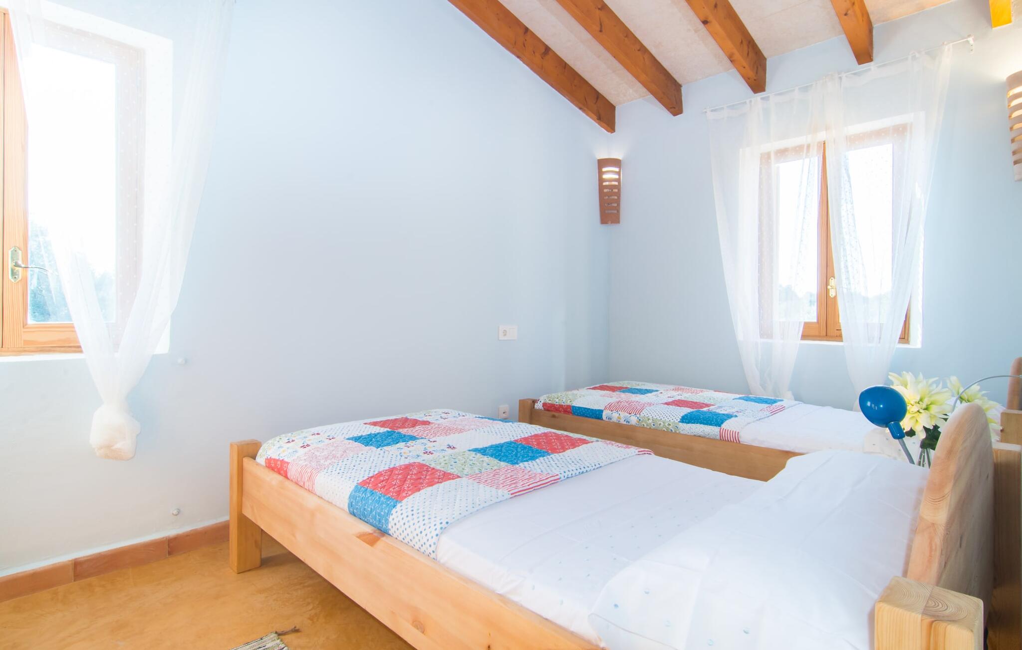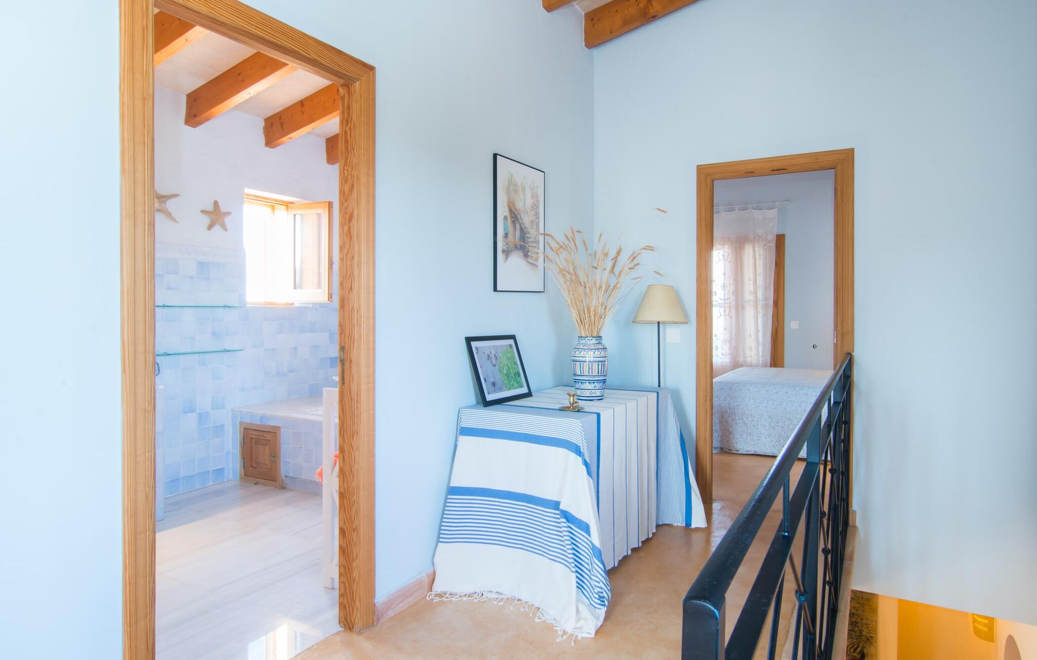 Net als een vrucht die levert wat de buitenkant belooft, stelt de binnenkant ook niet teleur: Mallorcaans, nuchter, zonnig en bloemig. Een frisse bries lijkt door het huis te waaien en luchtige gordijnen geven de ruimte een lichte touch. De ruime, open woon-, kook- en eetruimte wordt omringd door gezellige, felblauwe banken die je uitnodigen om je onder te dompelen in een filmavondje. Natuurlijk kun je ook wegdromen in de aangenaam eenvoudige slaapkamers met massief houten bedden; de slaapkamers zijn ingericht met een keuze uit donkerder of lichter gekleurd meubilair en een van de slaapkamers boven heeft directe toegang tot een beschut balkon met prachtig uitzicht over de bomen naar de bergen daarachter. Als je hier slaapt, kun je de deur open laten. De badkamers, een op de begane grond en een op de bovenverdieping, worden gedeeld door twee slaapkamers. Het enige dat nog genoemd moet worden is de moderne, goed uitgeruste keuken met een eigen plekje in de zon, aan de muren waarvan knapperige, verse groenten van de wekelijkse markt in Campos smakelijk hangen: een paradijs voor vegetariërs en liefhebbers van rauwkost, ware het niet dat de fantastische gemetselde barbecue voor de deur er om schreeuwt gebruikt te worden. Het zou zonde zijn om niet... ¡Buen provencho!