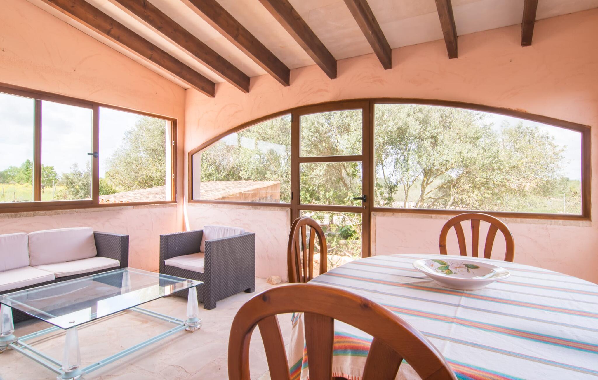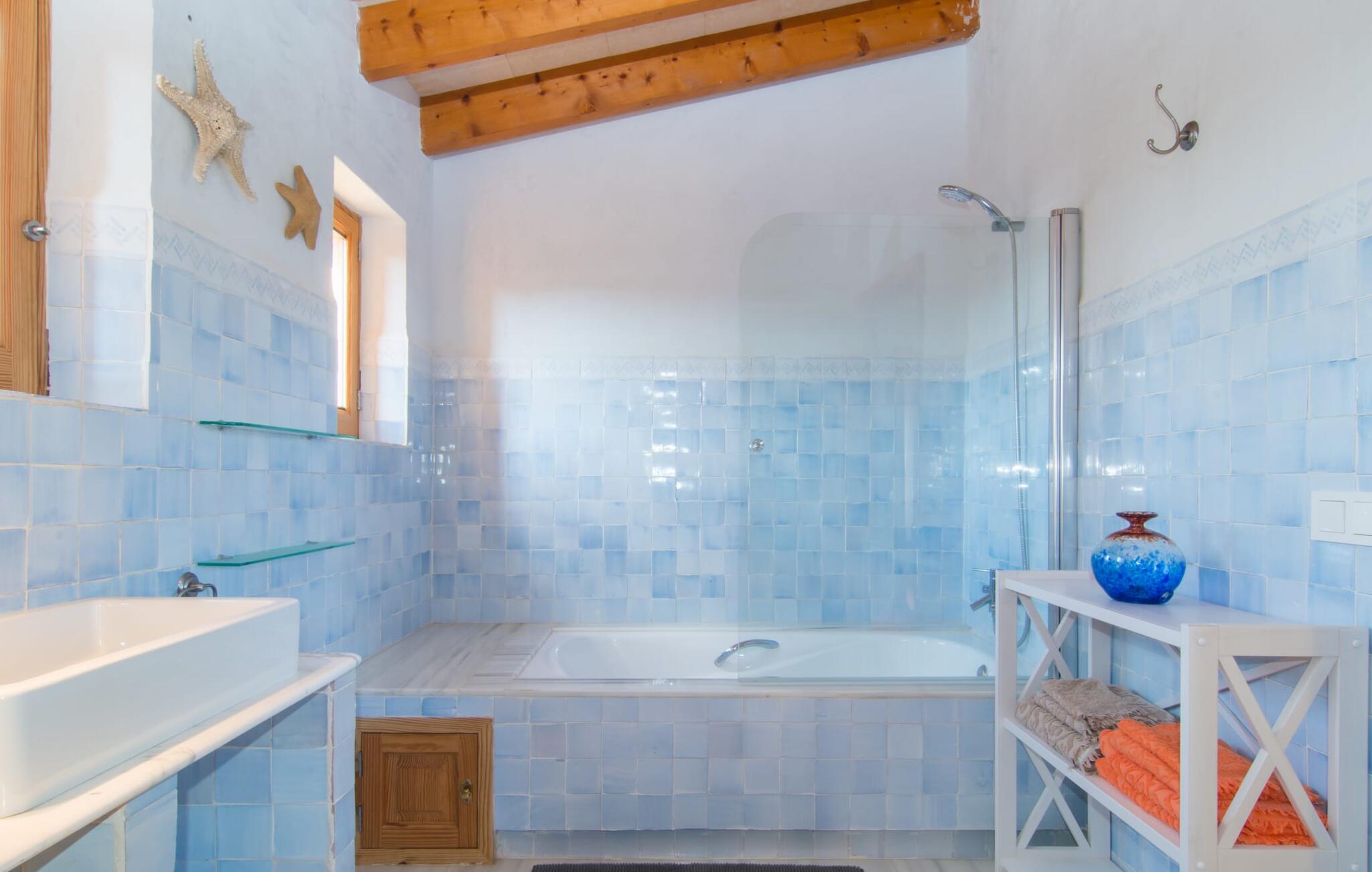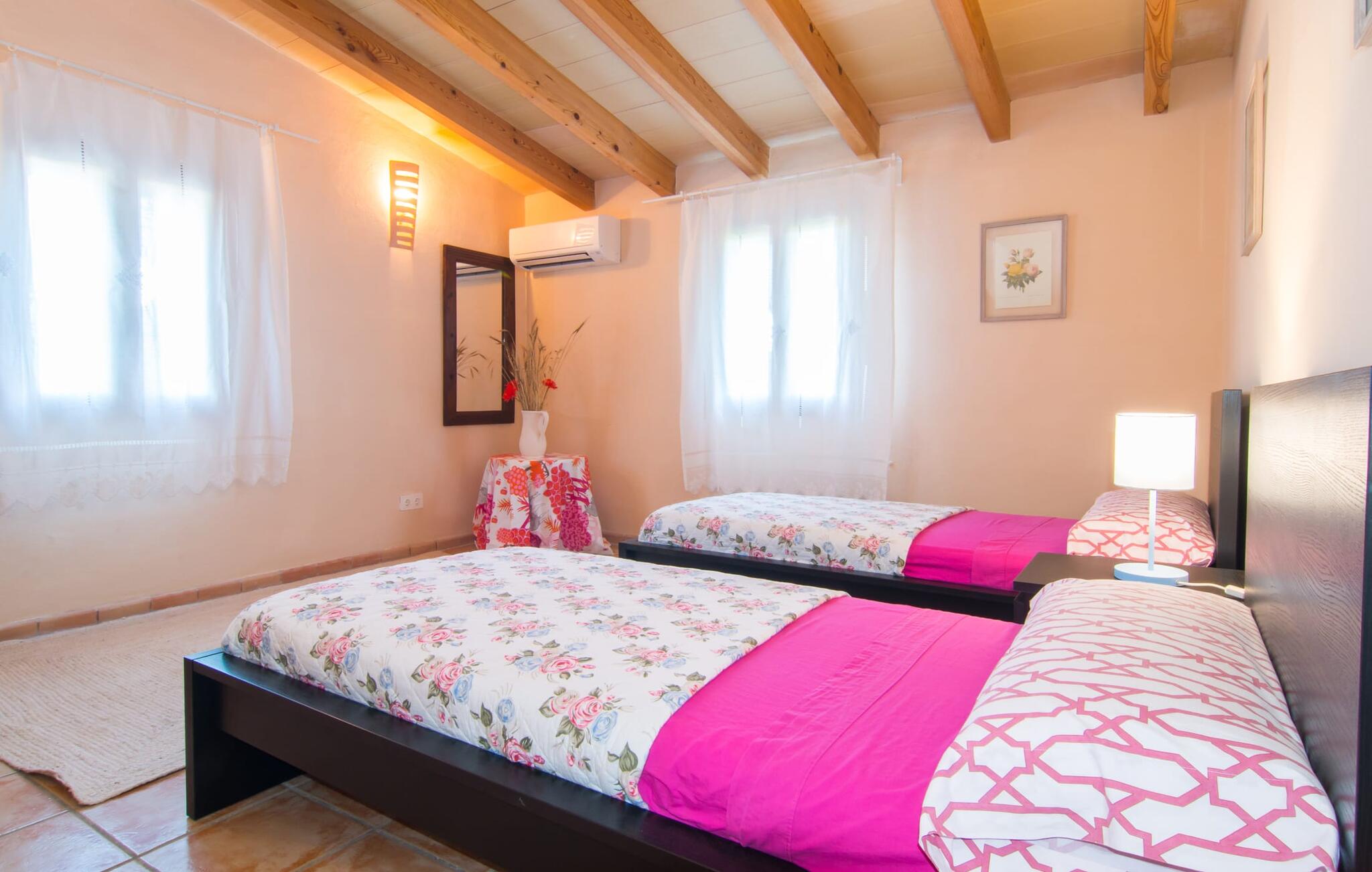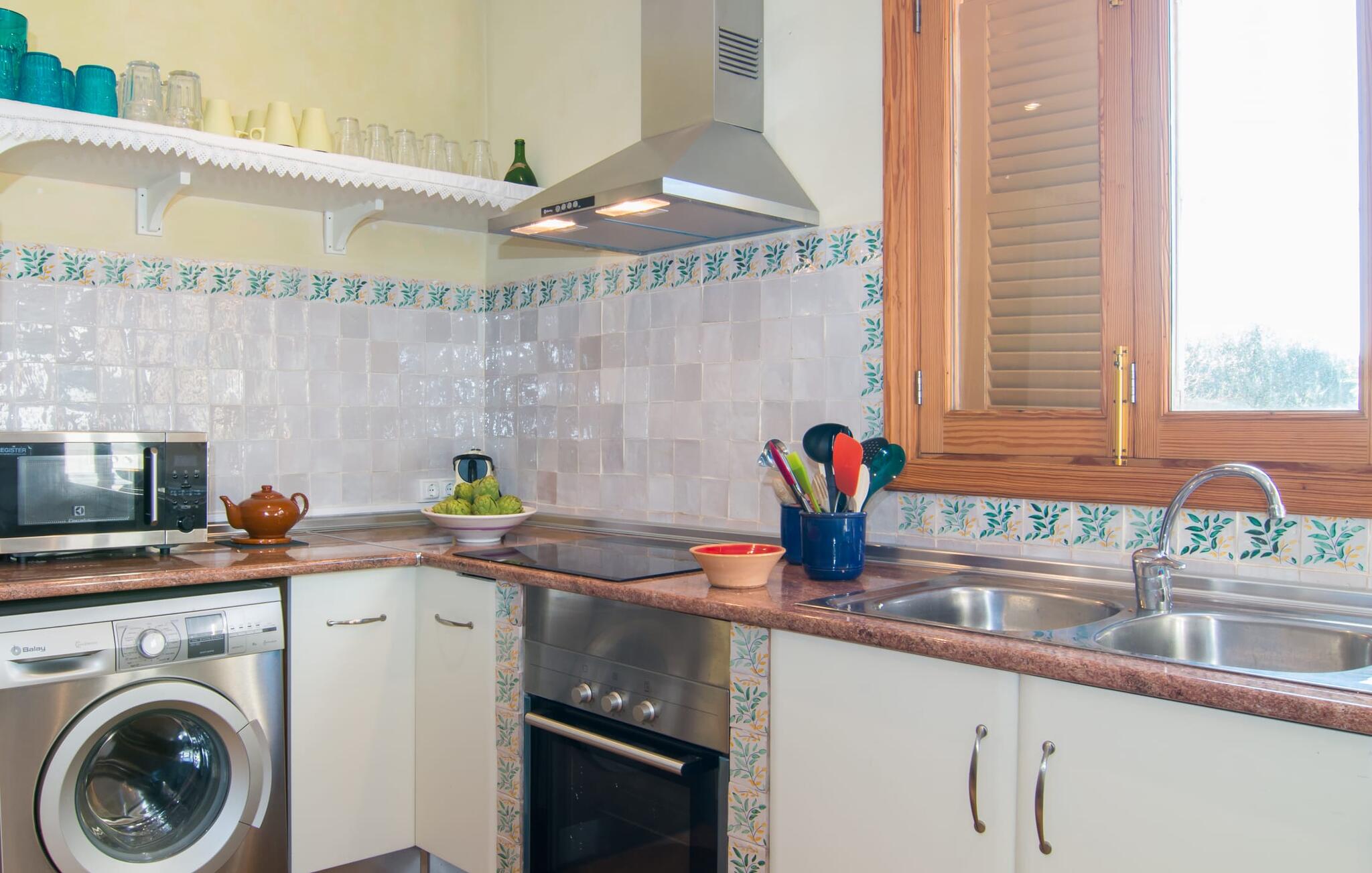 Net als een vrucht die levert wat de buitenkant belooft, stelt de binnenkant ook niet teleur: Mallorcaans, nuchter, zonnig en bloemig. Een frisse bries lijkt door het huis te waaien en luchtige gordijnen geven de ruimte een lichte touch. De ruime, open woon-, kook- en eetruimte wordt omringd door gezellige, felblauwe banken die je uitnodigen om je onder te dompelen in een filmavondje. Natuurlijk kun je ook wegdromen in de aangenaam eenvoudige slaapkamers met massief houten bedden; de slaapkamers zijn ingericht met een keuze uit donkerder of lichter gekleurd meubilair en een van de slaapkamers boven heeft directe toegang tot een beschut balkon met prachtig uitzicht over de bomen naar de bergen daarachter. Als je hier slaapt, kun je de deur open laten. De badkamers, een op de begane grond en een op de bovenverdieping, worden gedeeld door twee slaapkamers. Het enige dat nog genoemd moet worden is de moderne, goed uitgeruste keuken met een eigen plekje in de zon, aan de muren waarvan knapperige, verse groenten van de wekelijkse markt in Campos smakelijk hangen: een paradijs voor vegetariërs en liefhebbers van rauwkost, ware het niet dat de fantastische gemetselde barbecue voor de deur er om schreeuwt gebruikt te worden. Het zou zonde zijn om niet... ¡Buen provencho!
